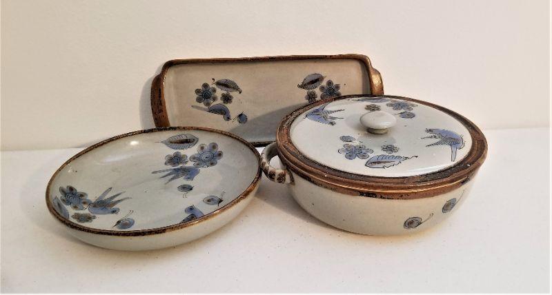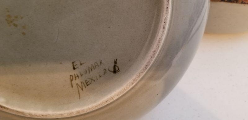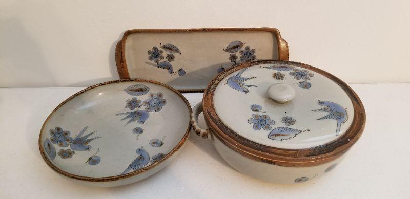 Pretty pieces in good condition - Mexican glazed pottery - shallow platter, rectangular platter, and casserole with lid. Shallow bowl is 11" across, covered bowl 13" across handle to handle, and rectangular piece is 15.5" across.