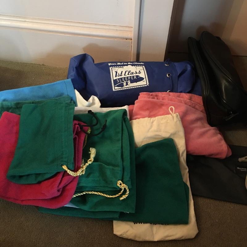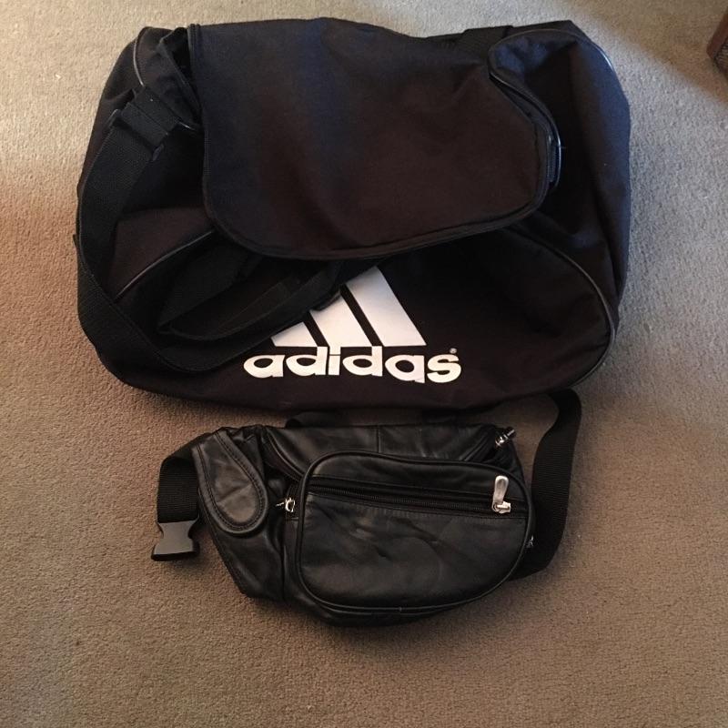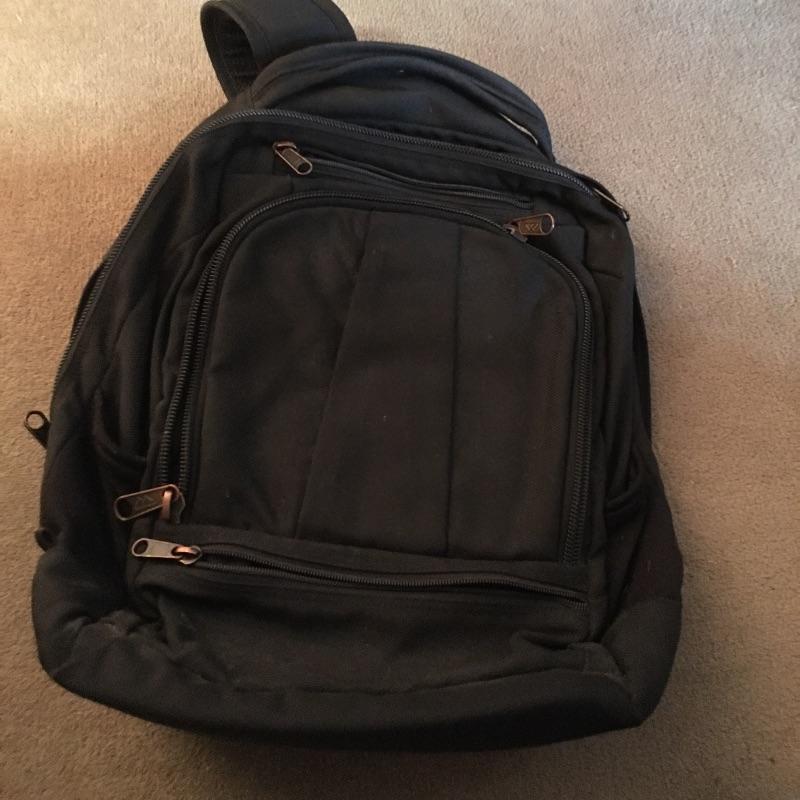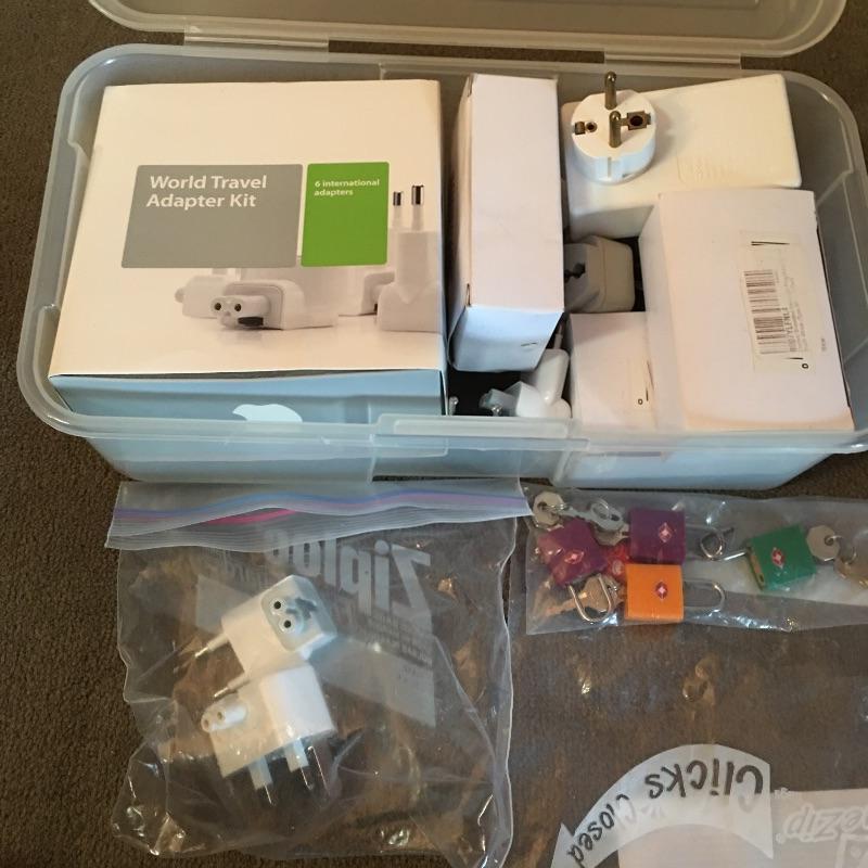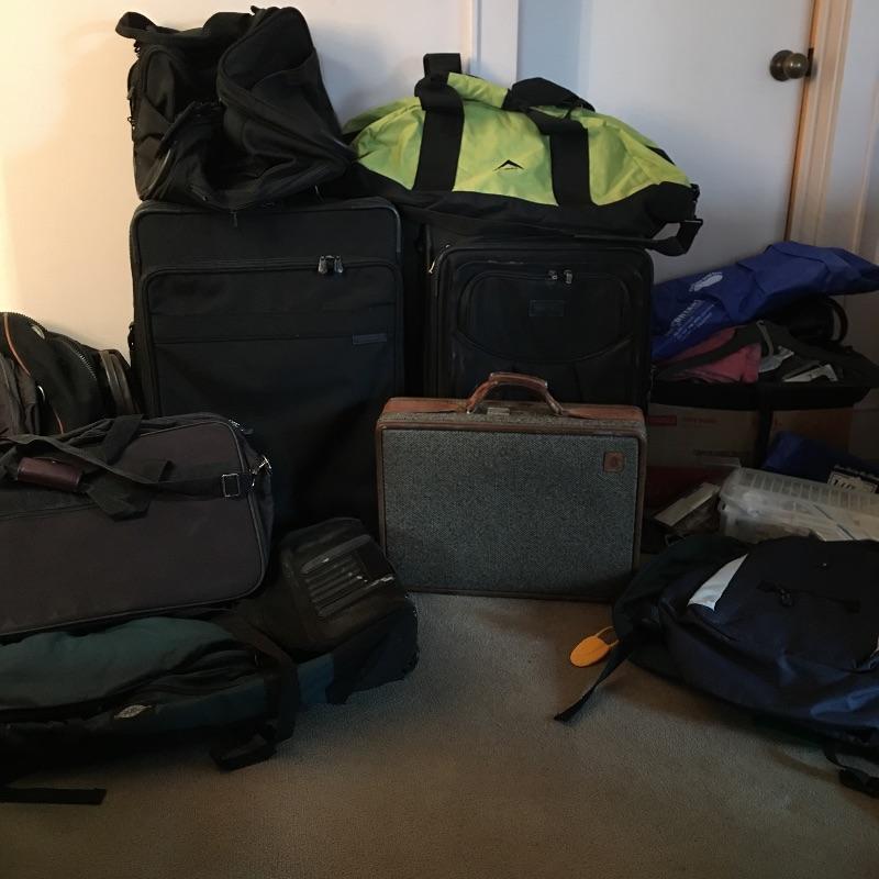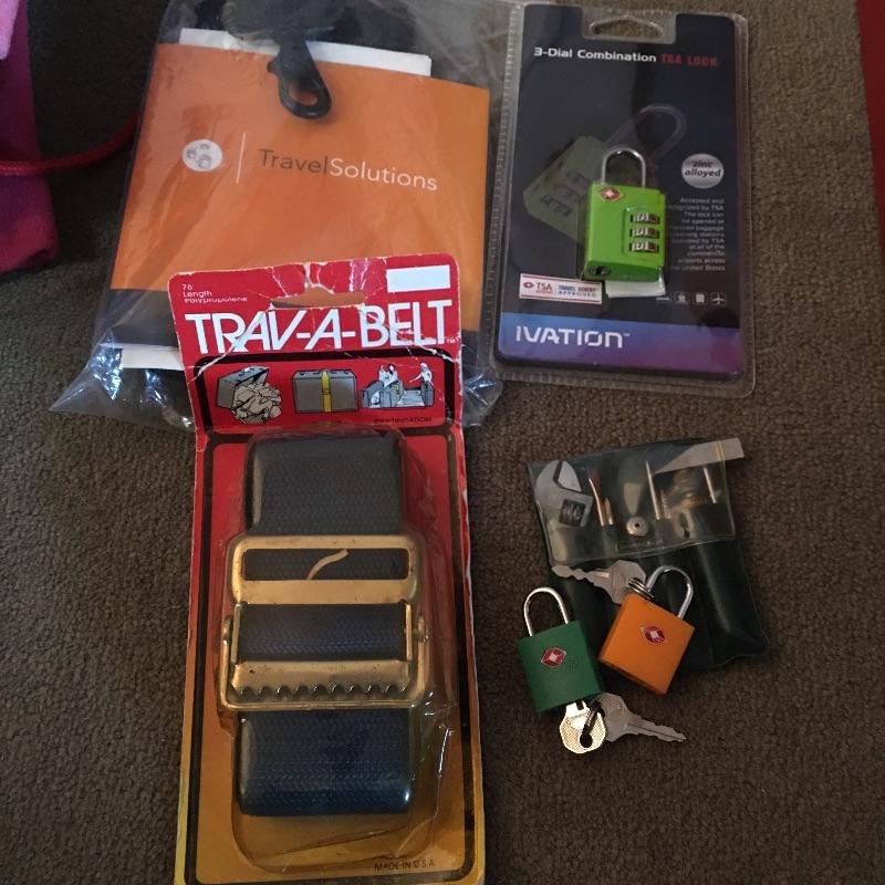 Luggage and travel essentials. Lot includes backpacks, rolling duffel, two wheeled suitcases, Hartman briefcase, American Tourister bags, travel adapter kit, clothes folders, locks and more.