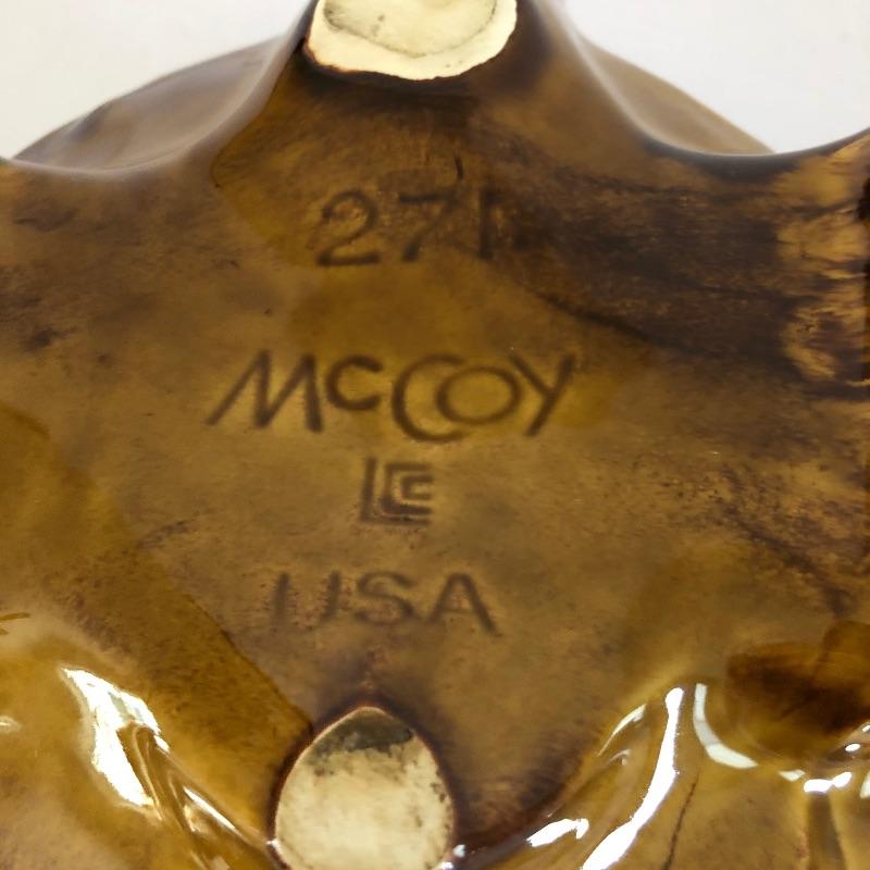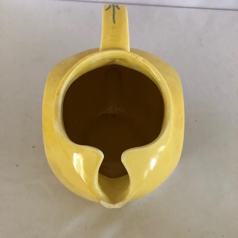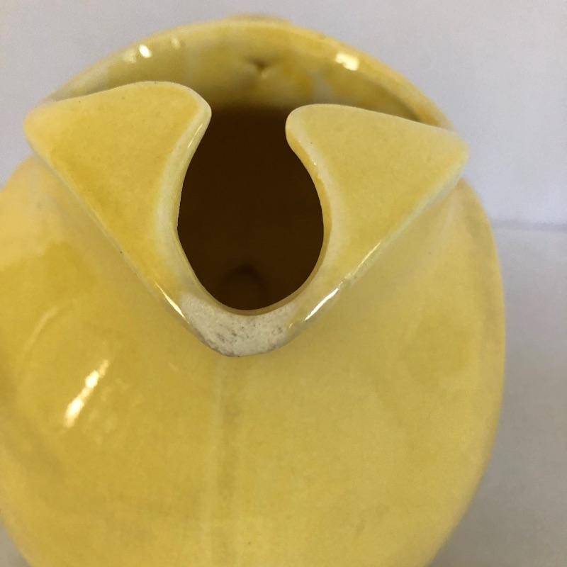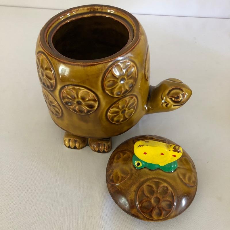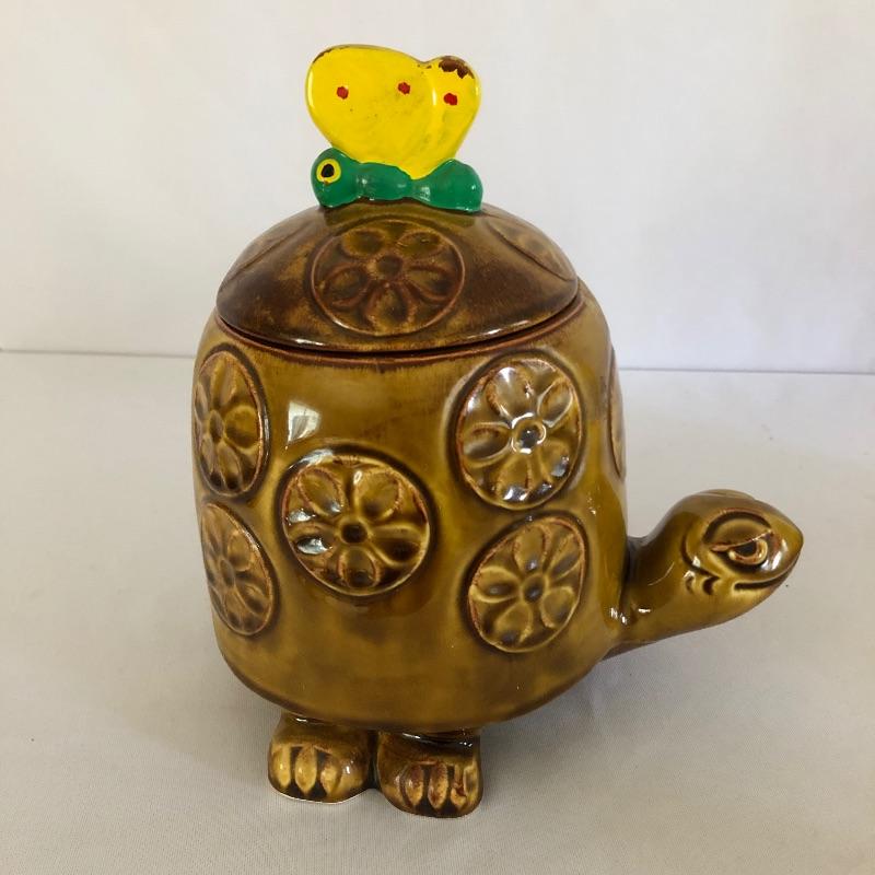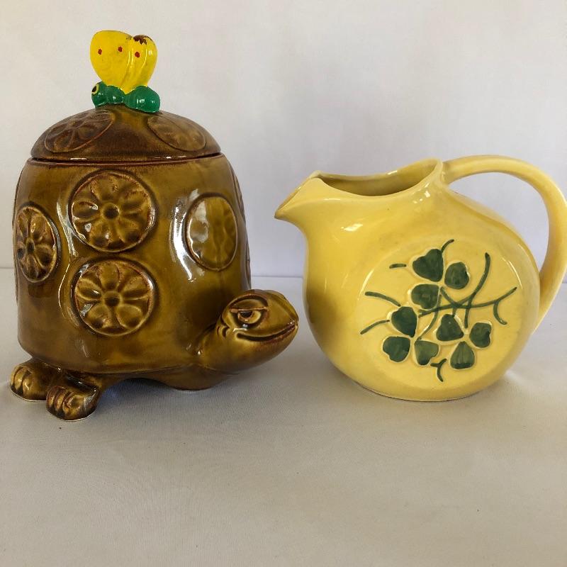 Two pieces of McCoy ceramics in this lot that includes a cookie jar and pitcher. The turtle cookie jar is adorable with his handle being a butterfly. The butterfly shows signs of a little wear, but it’s a cookie jar, what can we expect! It measures approximately 11”. The accompanying yellow pitcher has a lovely green motif on the sides. It has a small chip on its spout, see images.