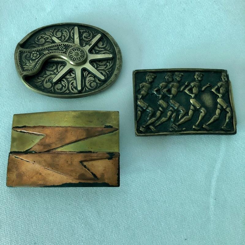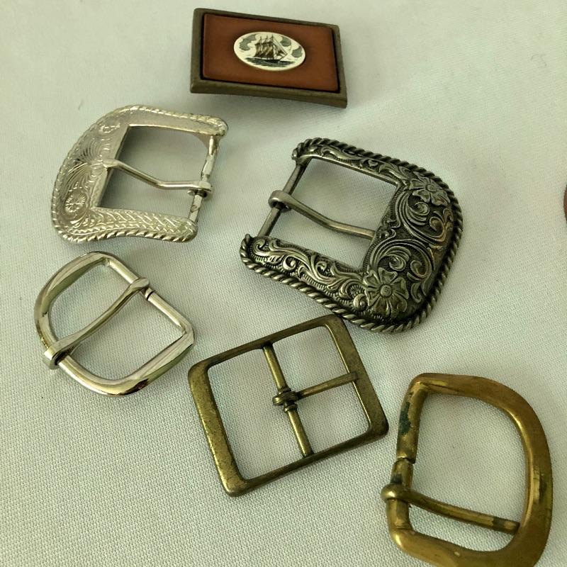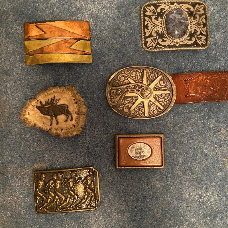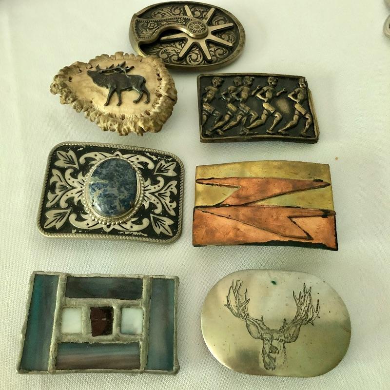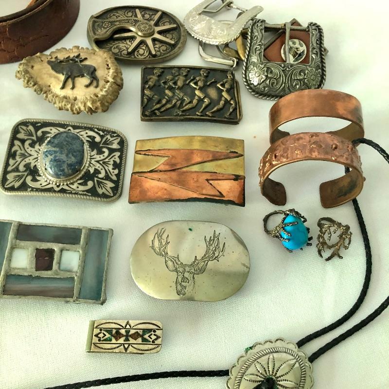 Buckle up guys, this lot has a great selection of accessories! Some really unique finds here that include pieces made from silver nickel, brass, copper and more. The buckle that looks like a cowboy spur is really cool because the rowels of the spur spins. A total of twelve belt buckles, one money clip, a lariat necklace, two copper and last but not least two rings. The one ring has what appears to be a large turquoise stone, the other is missing its center piece. Some kind of metal. See images for sizes.