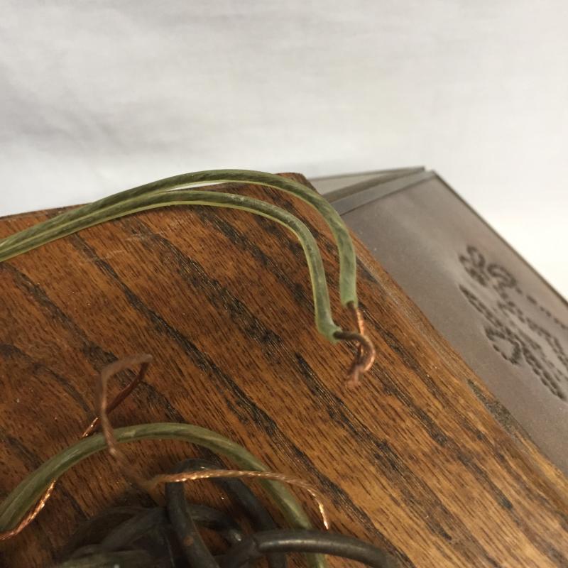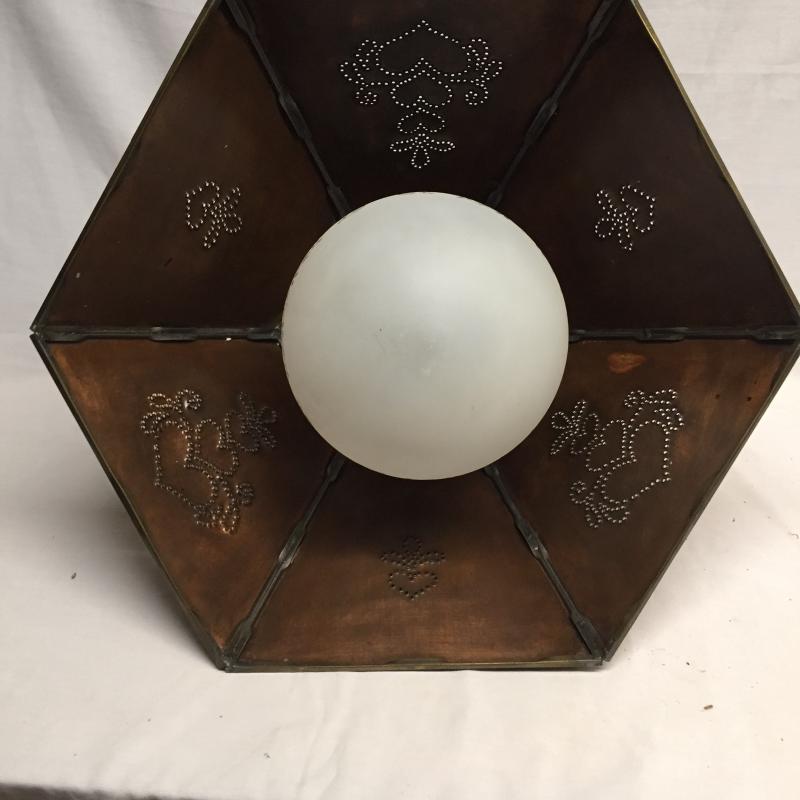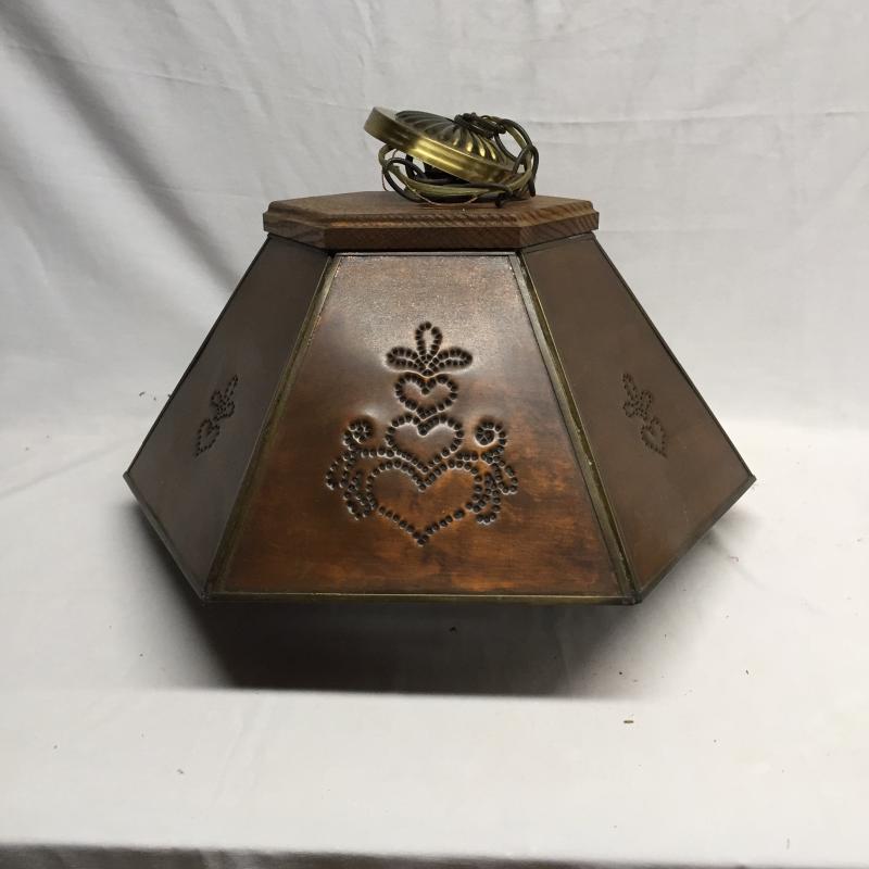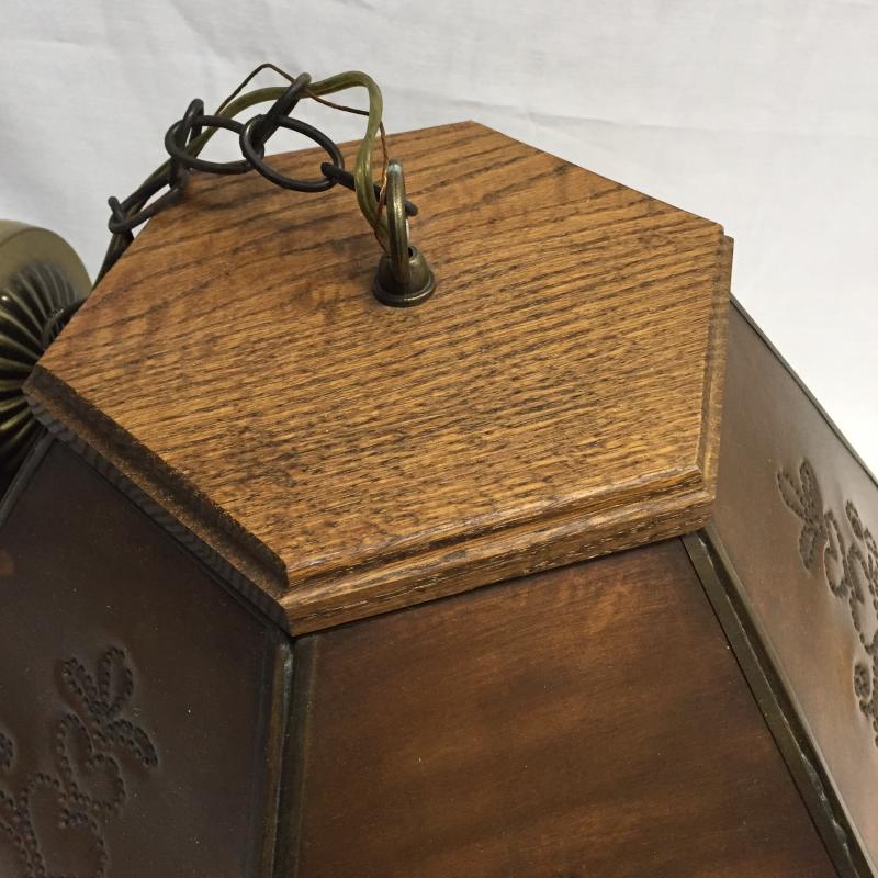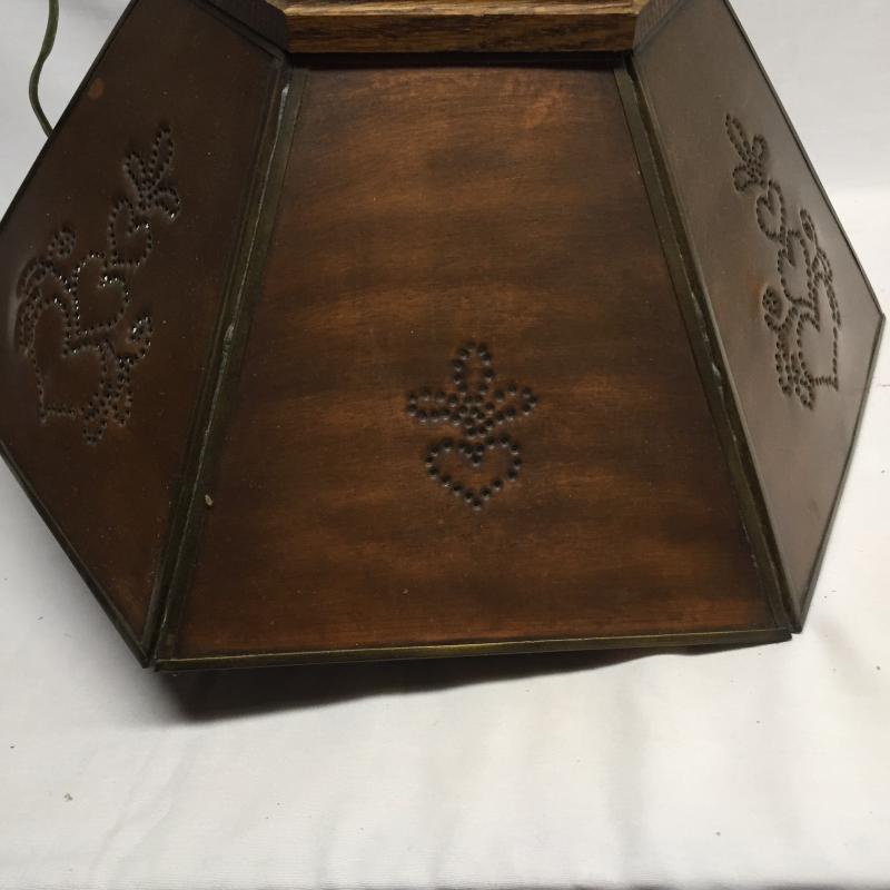 Copper and Wooden Light Fixture. Copper with Punched Designs and Wooden Top. Could not be tested as to working order. Light Measures 9” x 19”.
