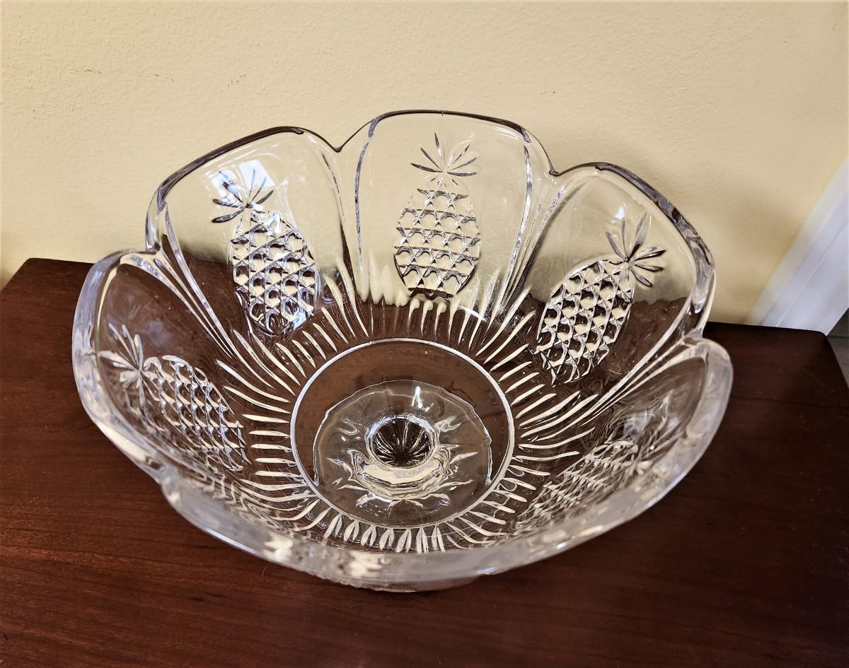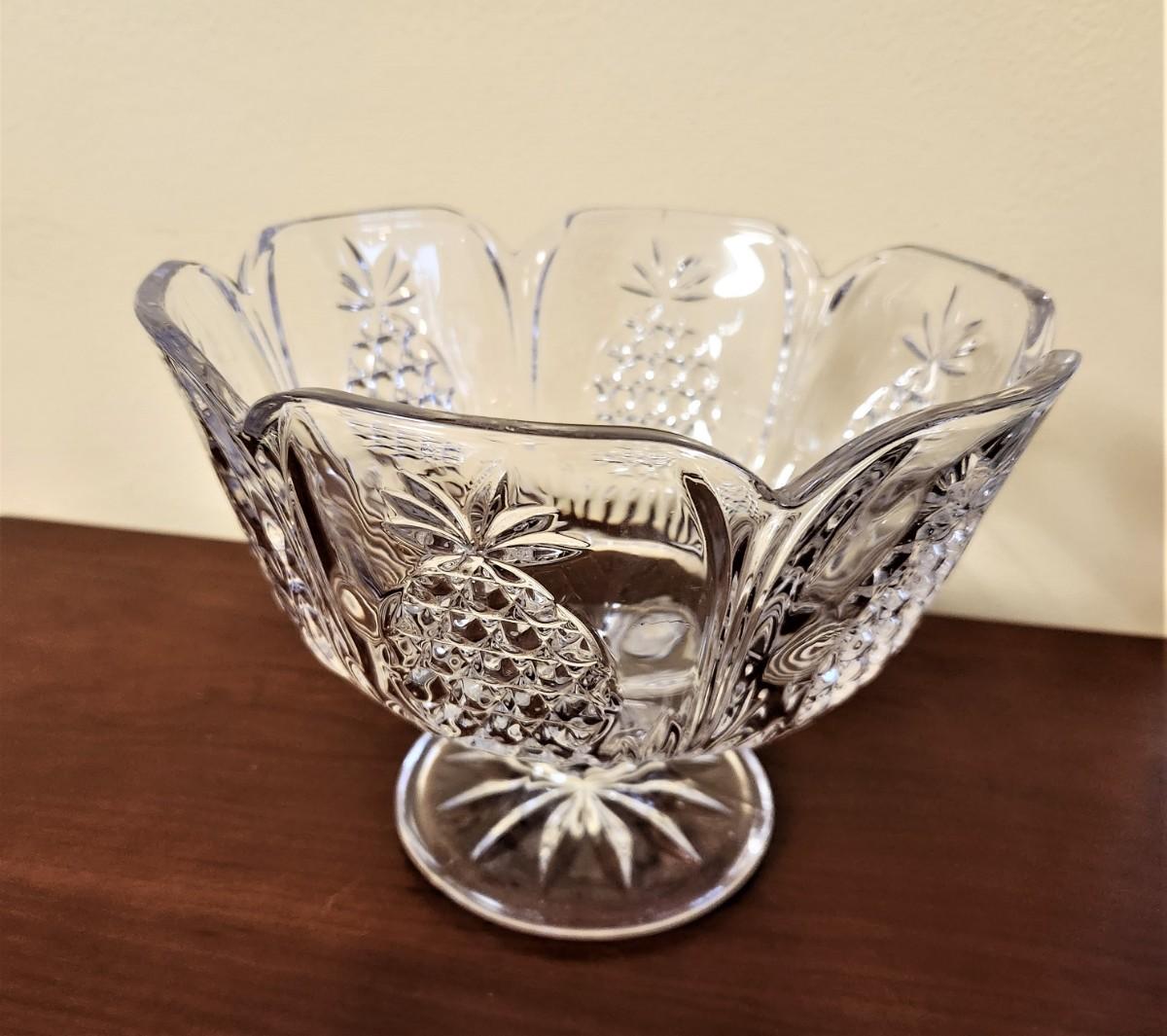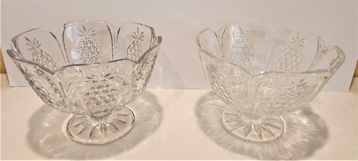 Nice pair of crystal compotes with a pineapple motif - the symbol of hospitality. Good condition - each of 6.5" tall, 8.5" across.