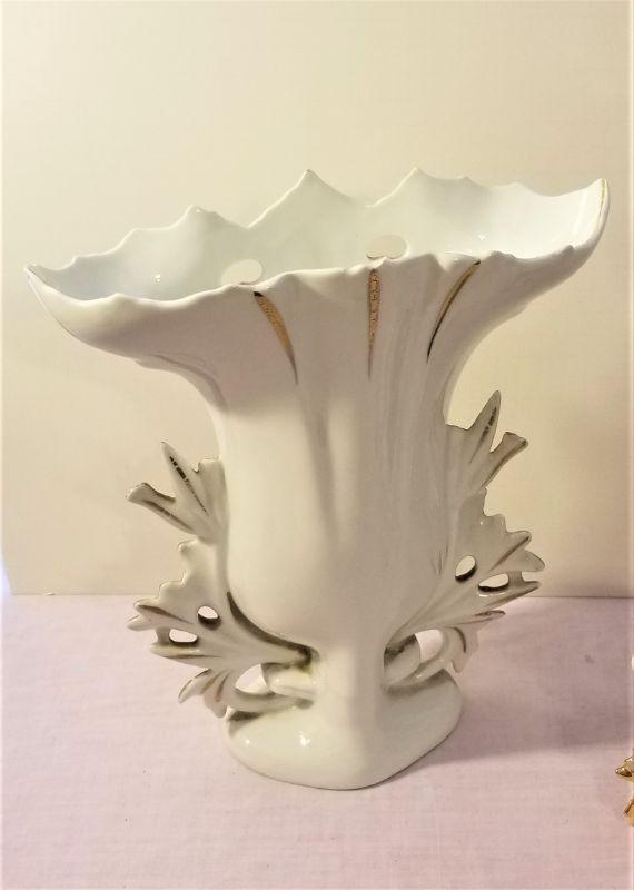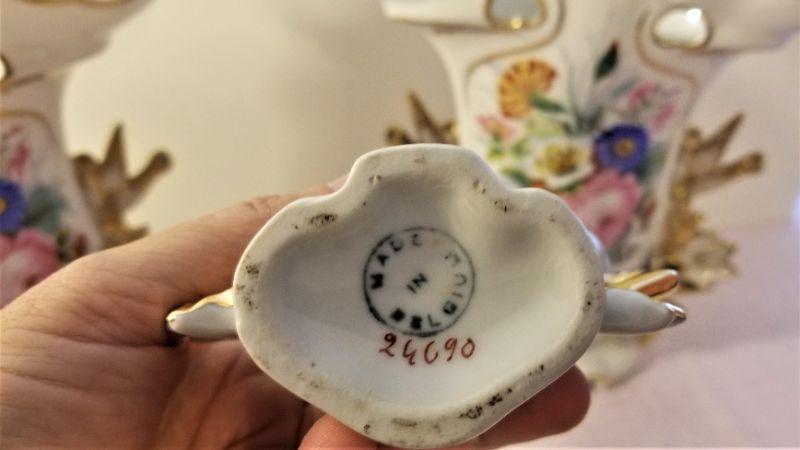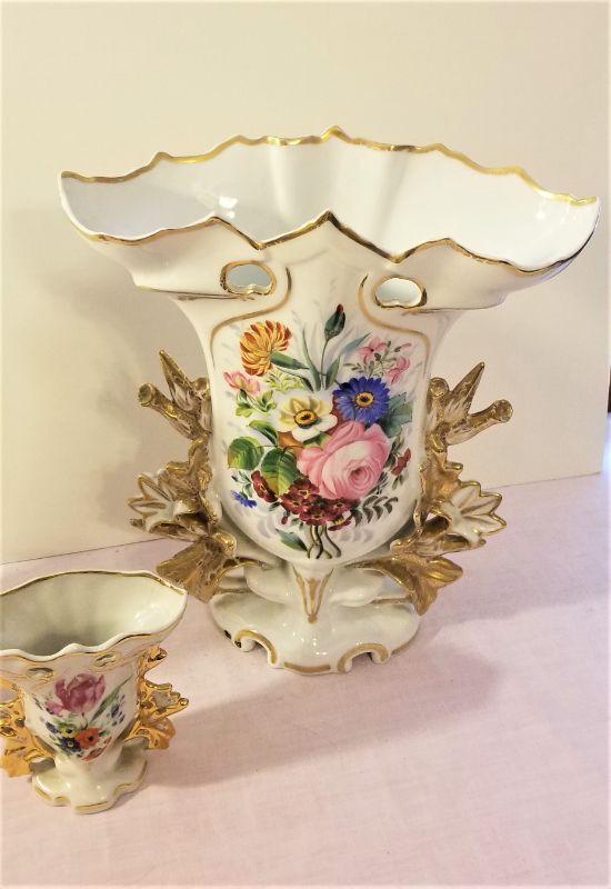 Nice pair of vintage mantle vases, done in the Old Paris style. These are a bit later, marked "Portugal." Each is 11.5" tall. Gold gilt and floral decoration, plus one smaller vase in the same style, this one marked "Belgium." It is 4.75" tall. all on good condition.
