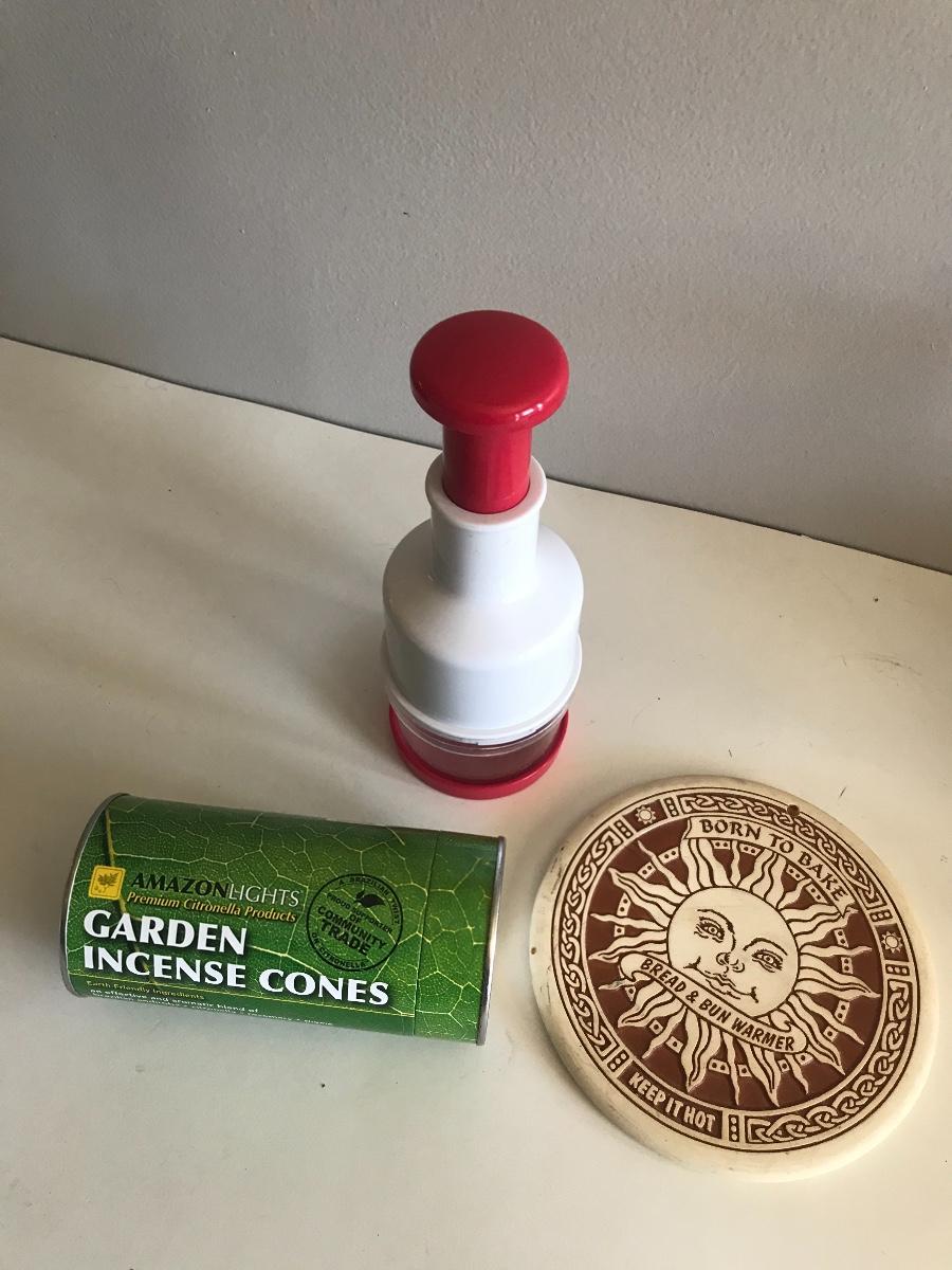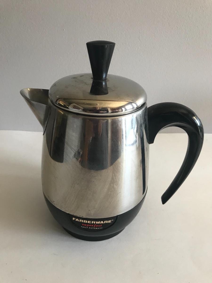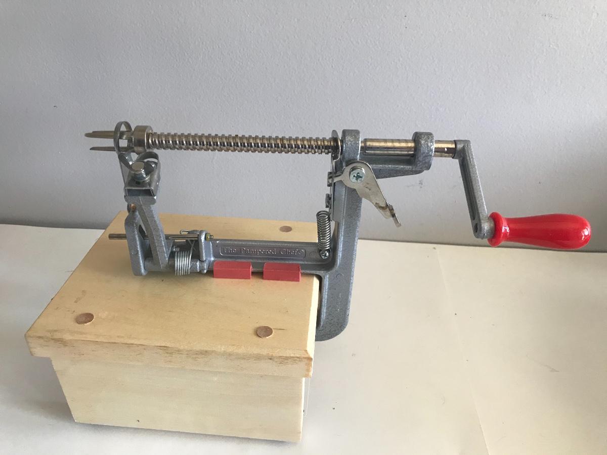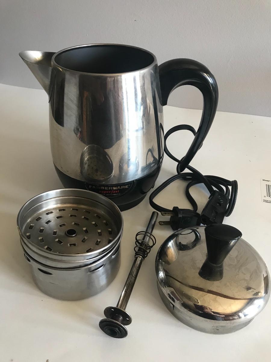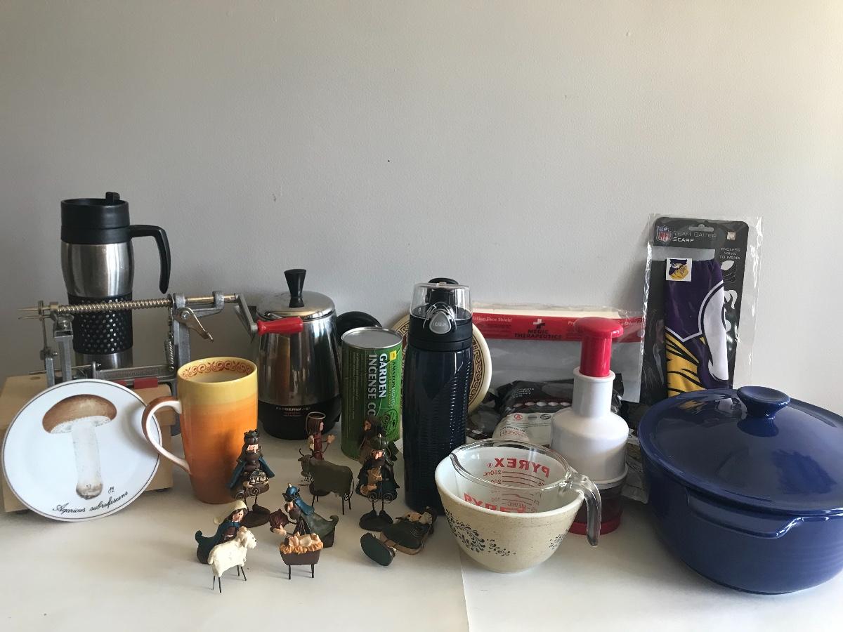 Pampered Chef apple peeler with stand, Farberware four cup percolator, Nantucket enameled, cast iron roaster, travel cups, face masks, and more. Please see all pictures for content of the lot, condition of the lot, and measurements if taken. Pictures are the best representation of the items listed and items are untested unless indicated in description. Thank you for looking and have fun bidding!