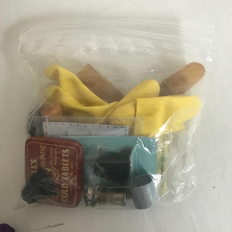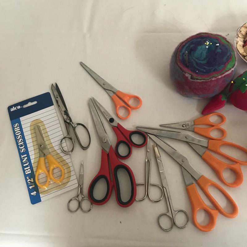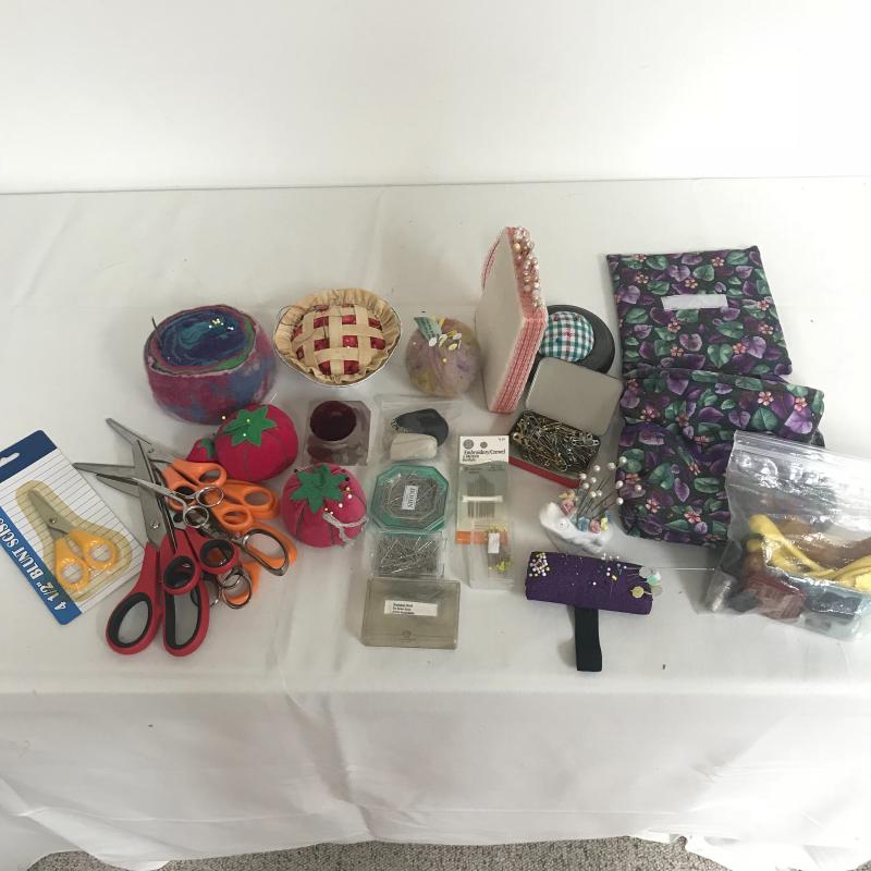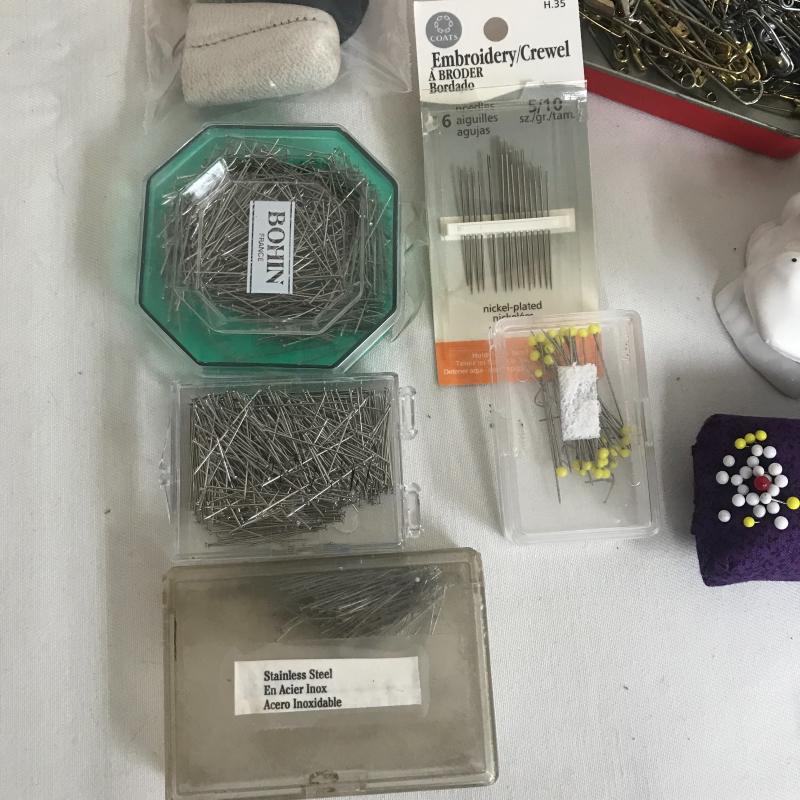 Lot includes several different pin cushion options as well as pins of all lengths and stainless steel ones. Finger protectors and several scissors of different sizes. Shipping available