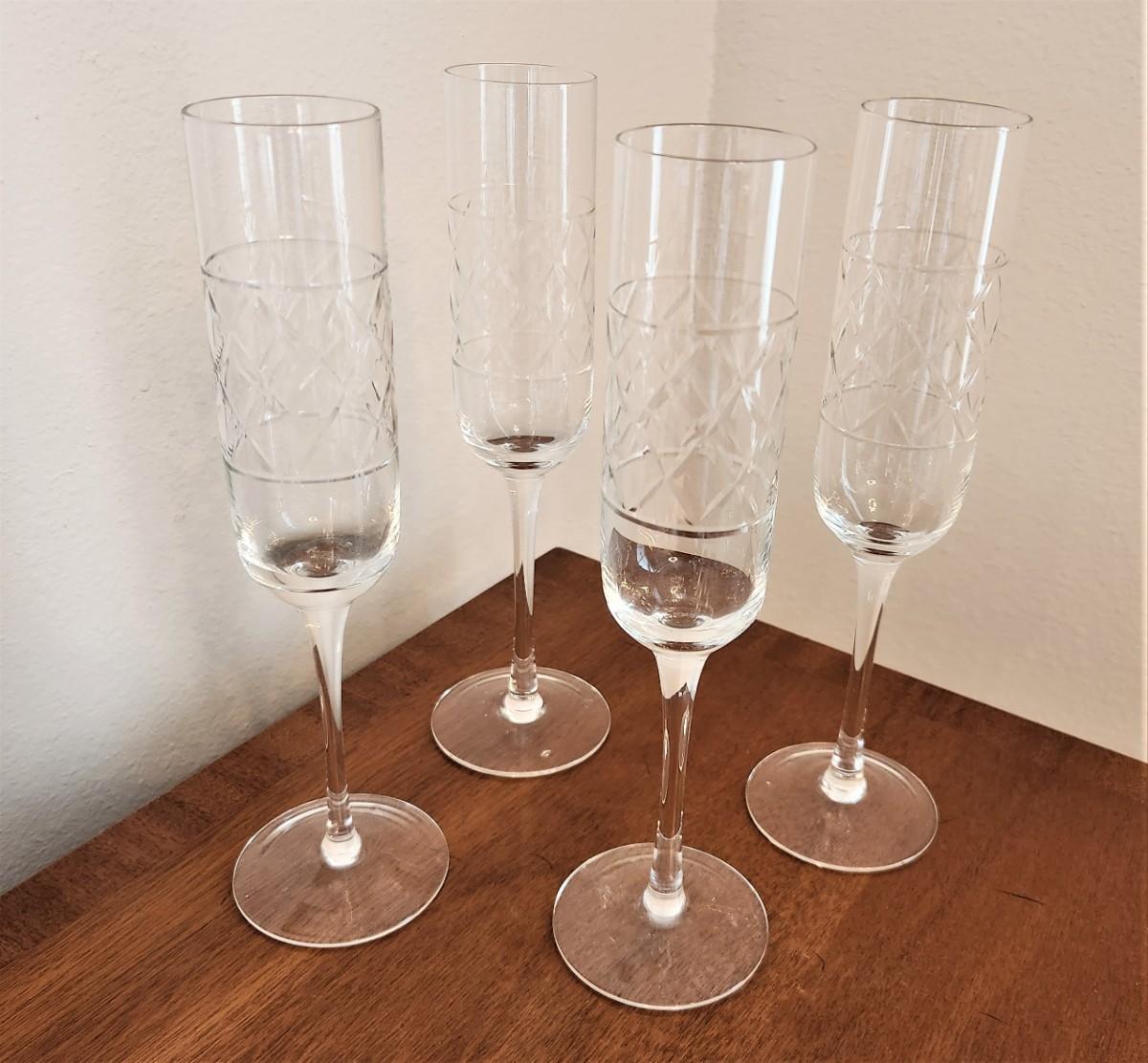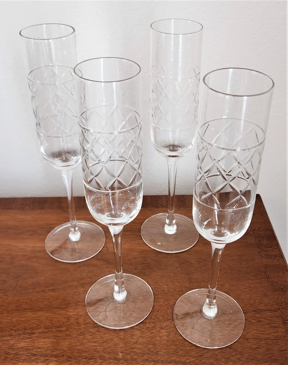 Set of 4 contemporary Crystal Champagne flutes - basketweave pattern, each 10" tall. Good condition.