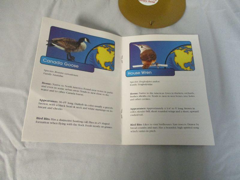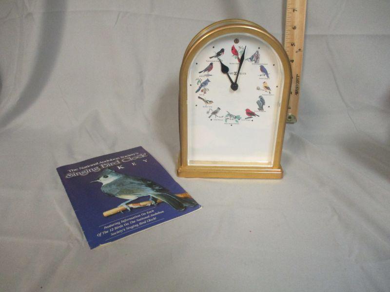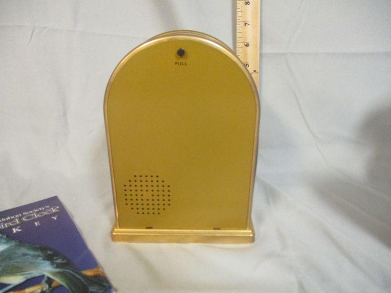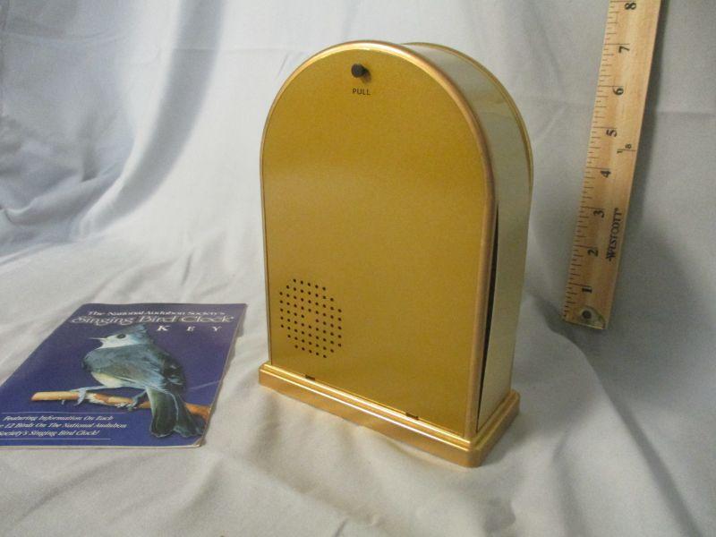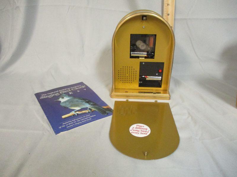 This clock requires three AA batteries of which I only had two. I used one battery to test the clock itself and it worked and then I put both batteries in to test the bird sounds, and when you press the button they work, but I was not able to test that it played their music on the hour. It is 7.5" tall and the metal on the side is loose, but when you press it back, you can hear that there is some type of sticky in it. Probably just needs to be re-stuck. Still doesn't show much when it's loose.