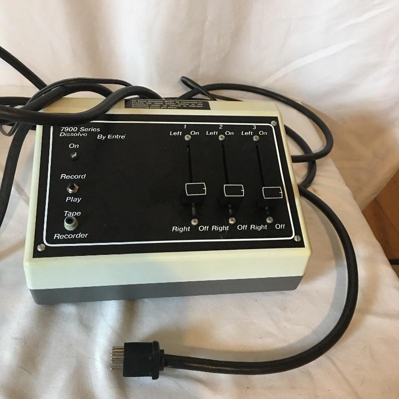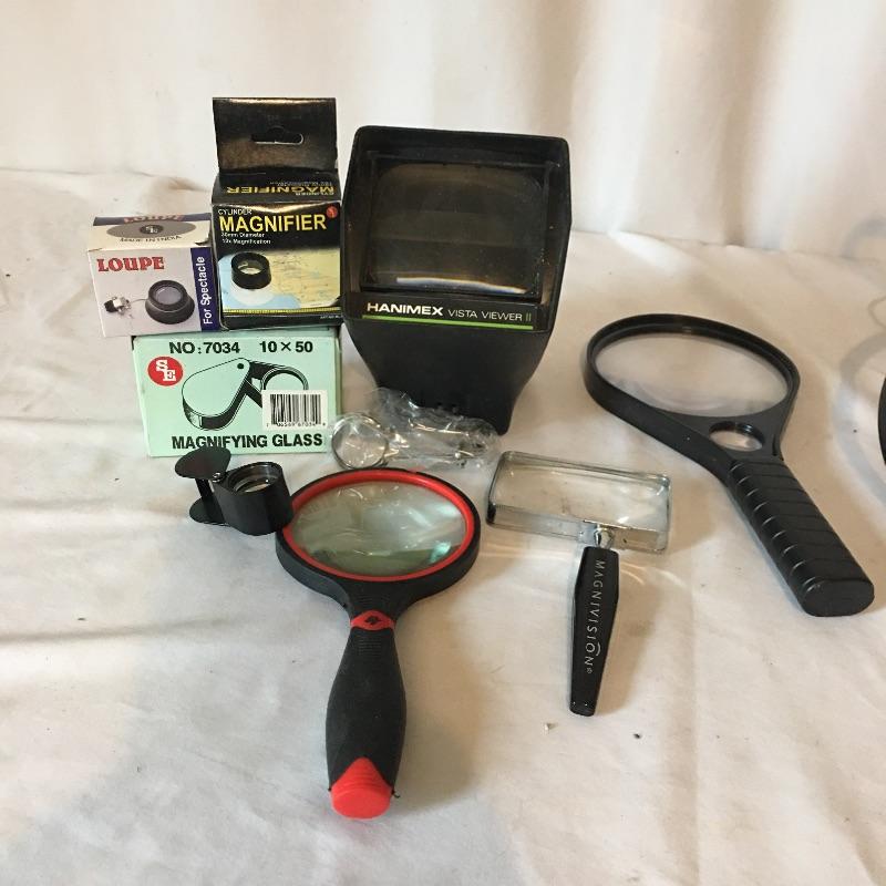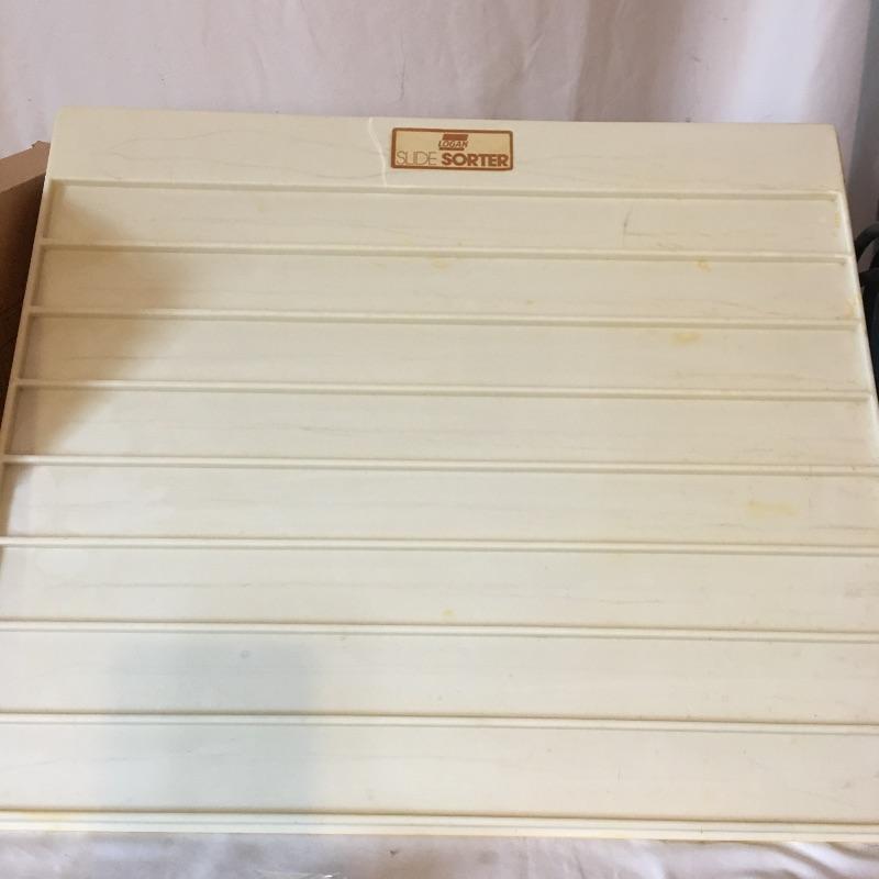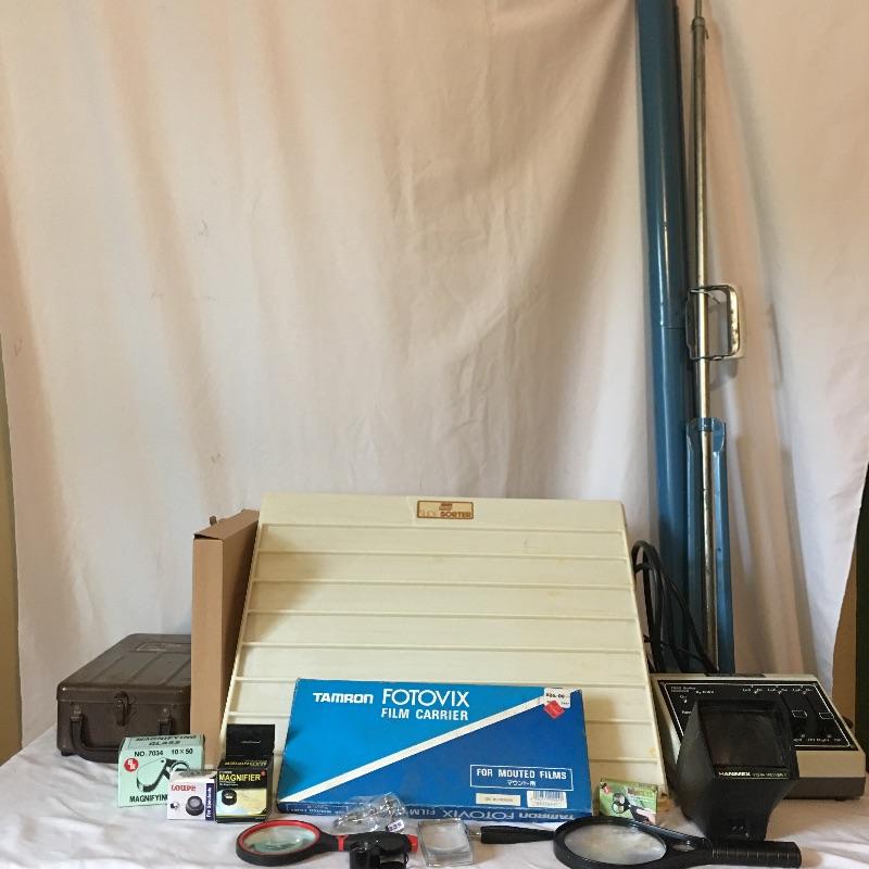Slide viewers and more. Lot includes Da-Lite 48”Diagonal screen, COC projection table viewer, Logan slide sorter, Fotovix film carrier, Haminex vista viewer, array of magnifying glasses and a 7900 series slide show dissolver. Dissolver powered on when tested, but table viewer appears to need a new bulb and did not work.