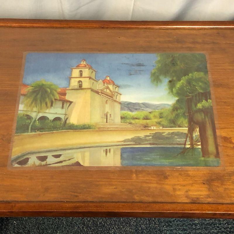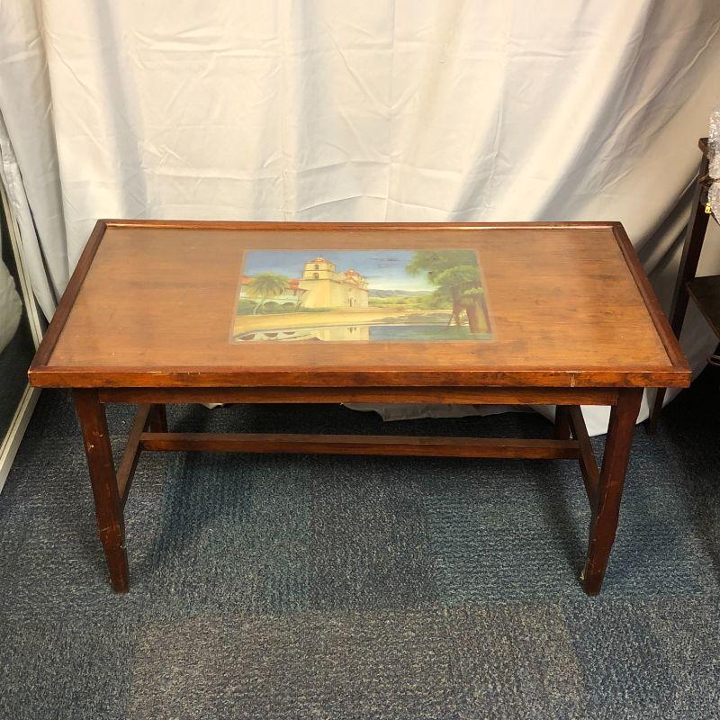 There is a glass top that covers the laminated picture and then a wood trim that holds the glass top on. If you're not into the picture, you should be able to take off the trim, remove the glass and picture, then put it all back on after you remove the picture. It is 19.25" tall, and 37" x 19". There are scuff marks, but no real damage.