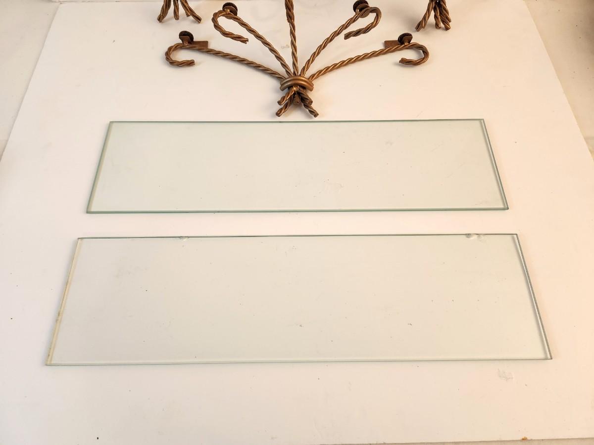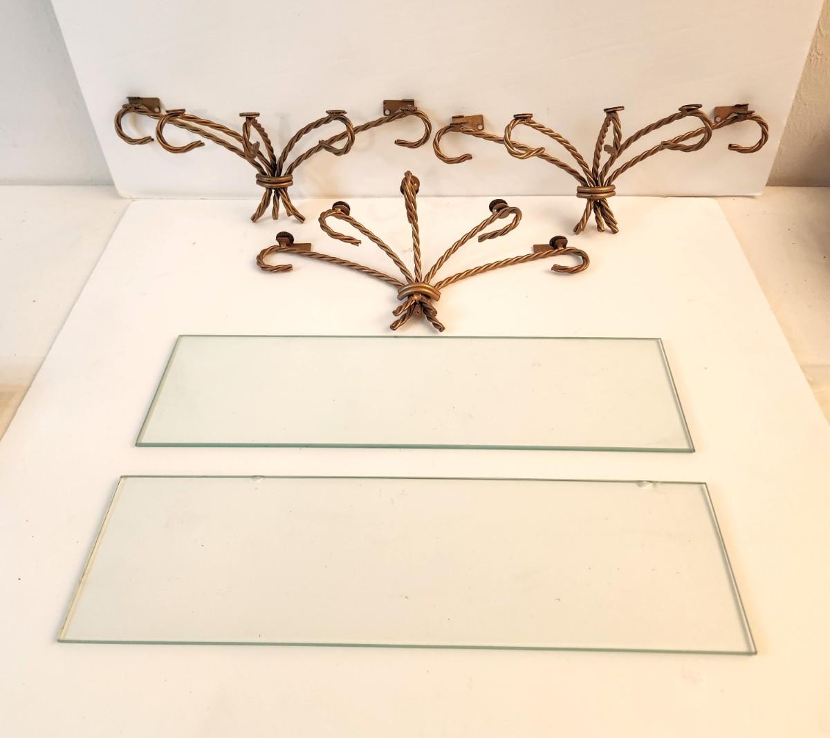 Three vintage wall shelves - 3 metal bases, 2 glass shelves (one has chigger bite - if placed next to wall will not show). 18" across, 5" deep