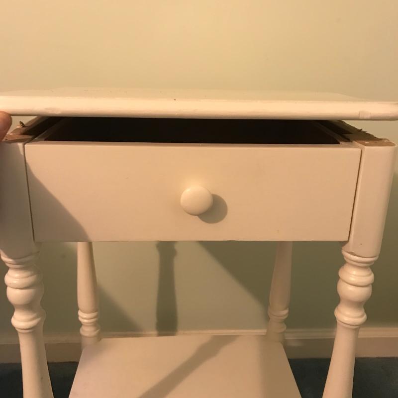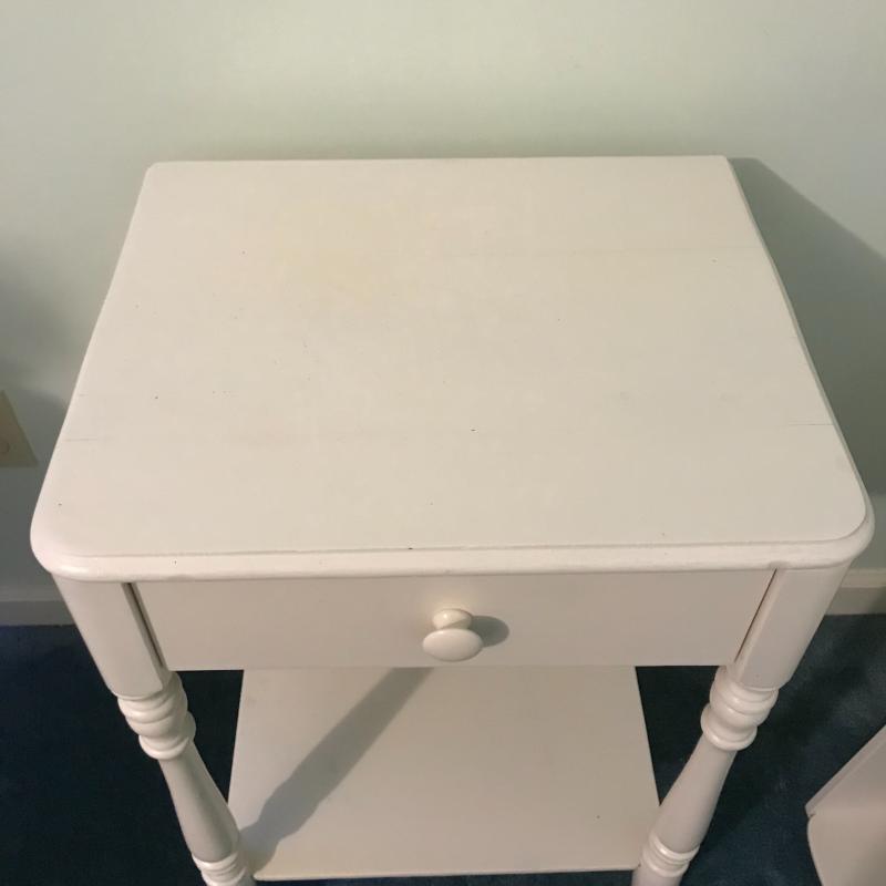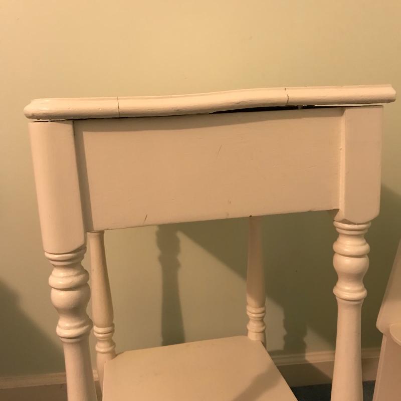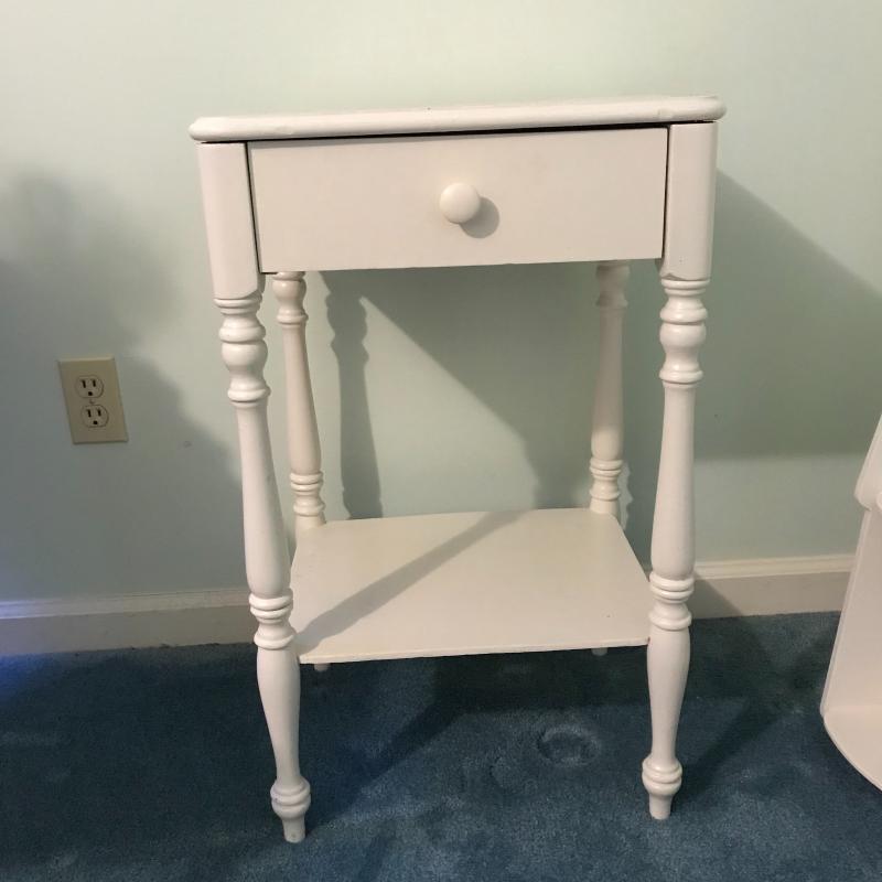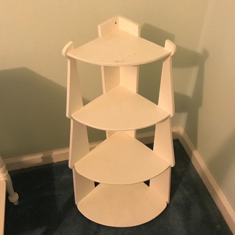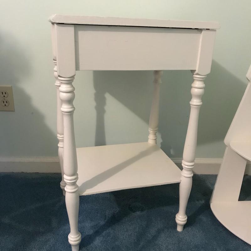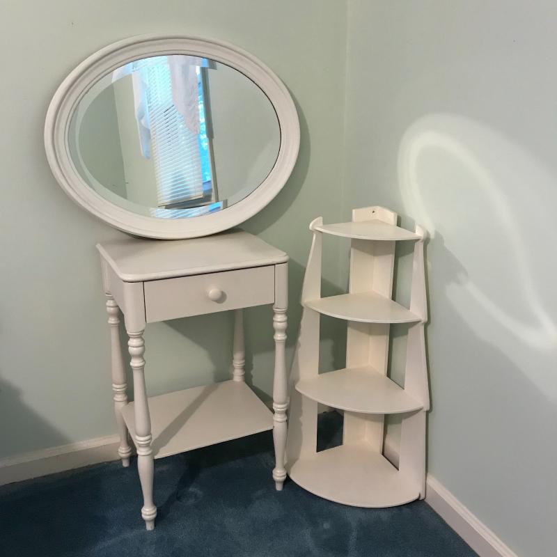 This lot includes three wooden pieces that are all painted white: an oval mirror, a side table with drawer measuring 17”x14”x27” and a sweet corner shelf unit that appears to have been hung on the wall. The table’s top needs to be reattached, but is in great shape otherwise. Barely any signs of wear, unless closely inspected. Local pick up only.