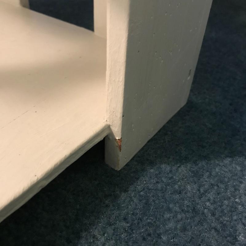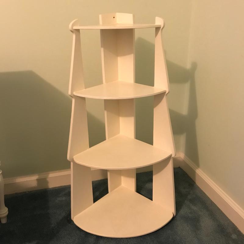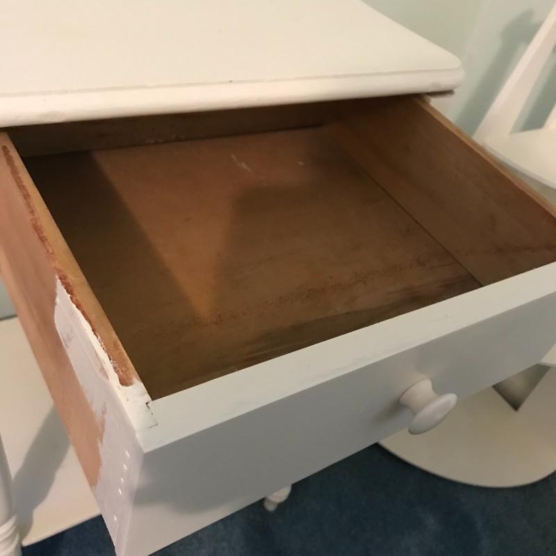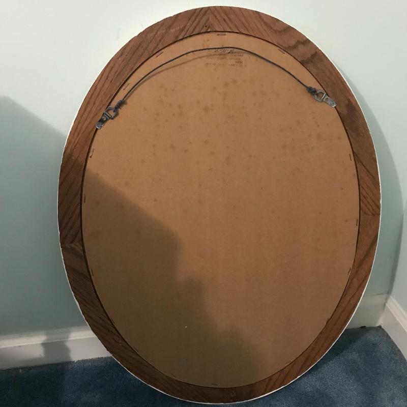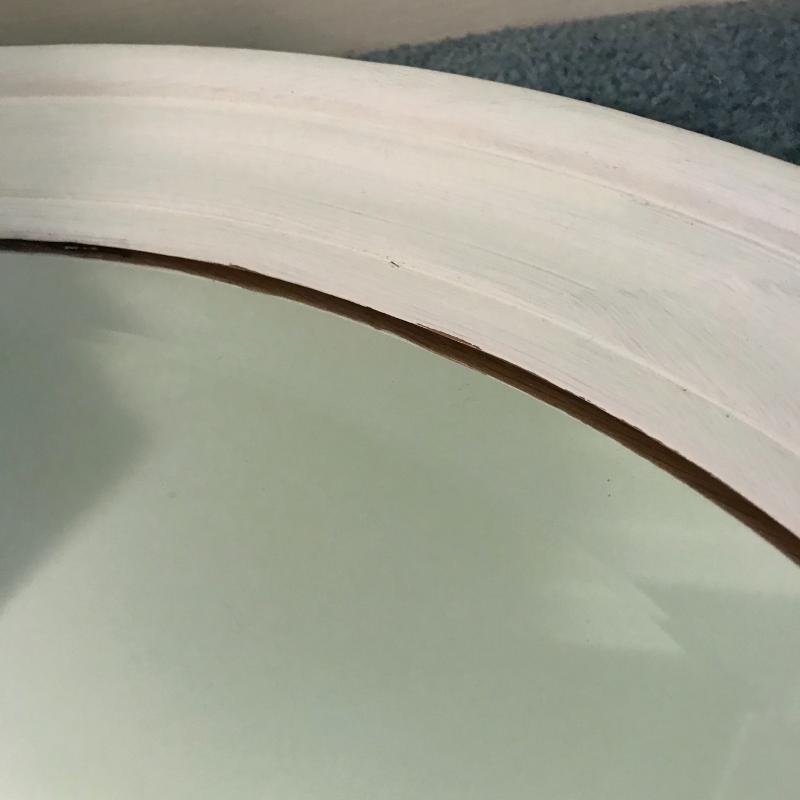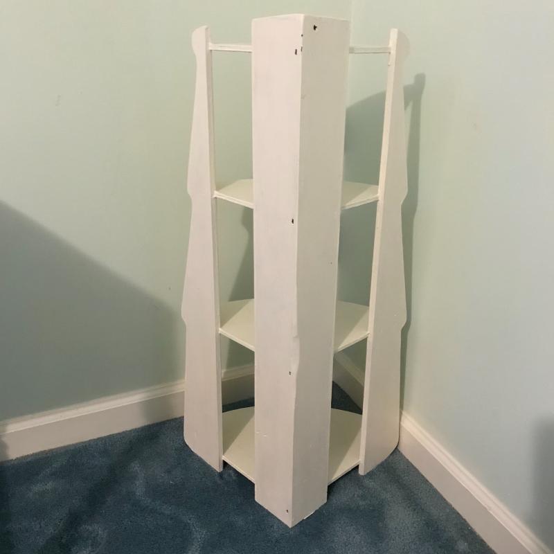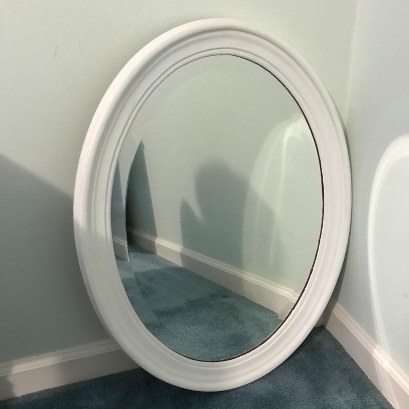 This lot includes three wooden pieces that are all painted white: an oval mirror, a side table with drawer measuring 17”x14”x27” and a sweet corner shelf unit that appears to have been hung on the wall. The table’s top needs to be reattached, but is in great shape otherwise. Barely any signs of wear, unless closely inspected. Local pick up only.