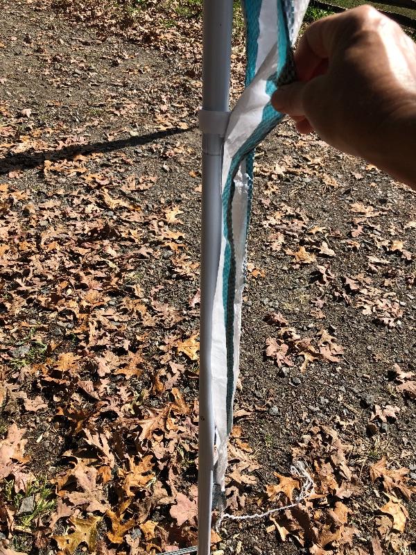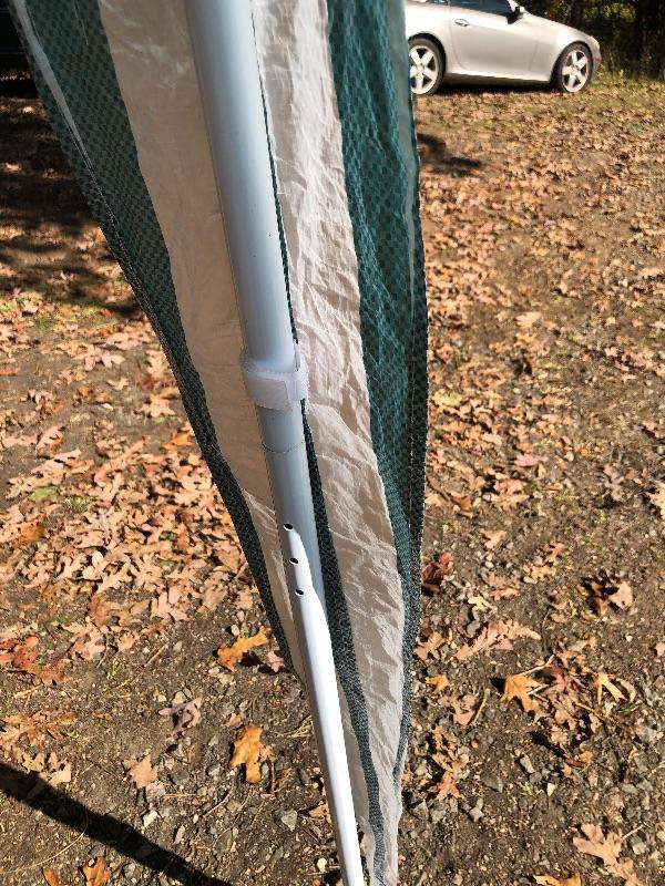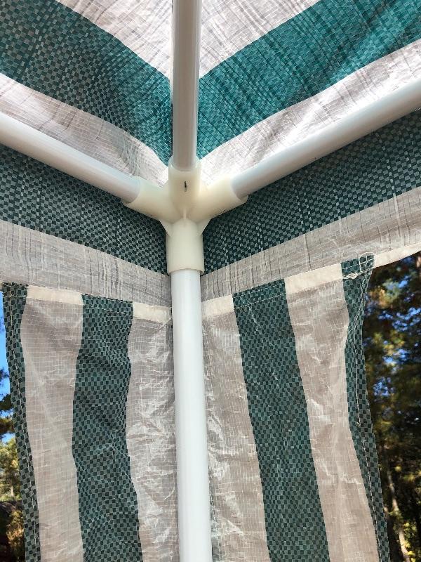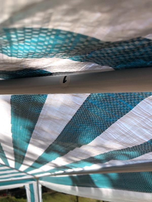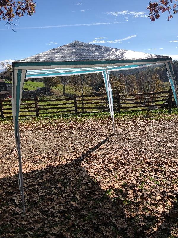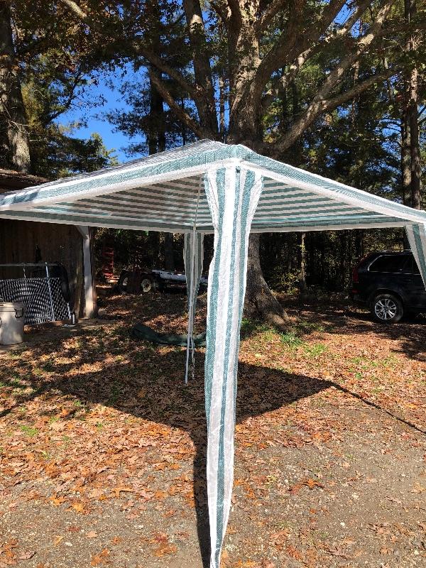 Watch your fall soccer games under this 10’ x 10’ Teal and White Stripped Vintage Canopy. Easy to assemble once you figure out how the numbered poles fit together! Poles slide into grooved plastic elbows and canopy has velcro straps to hold cover to poles. Canopy also has plastic feet and comes with 3 metal stakes. In good condition and comes with a spacious carrying case. Measures 10 ft x 10 ft. Local pick up only.