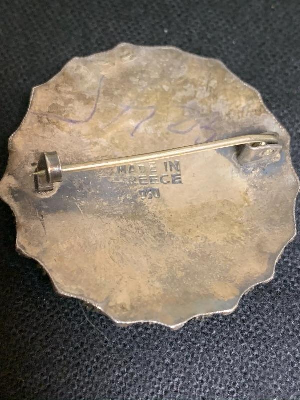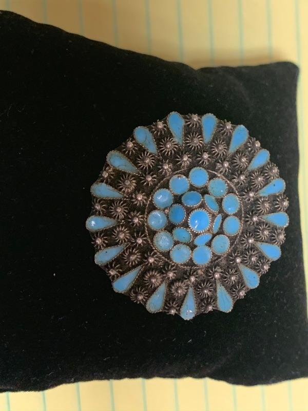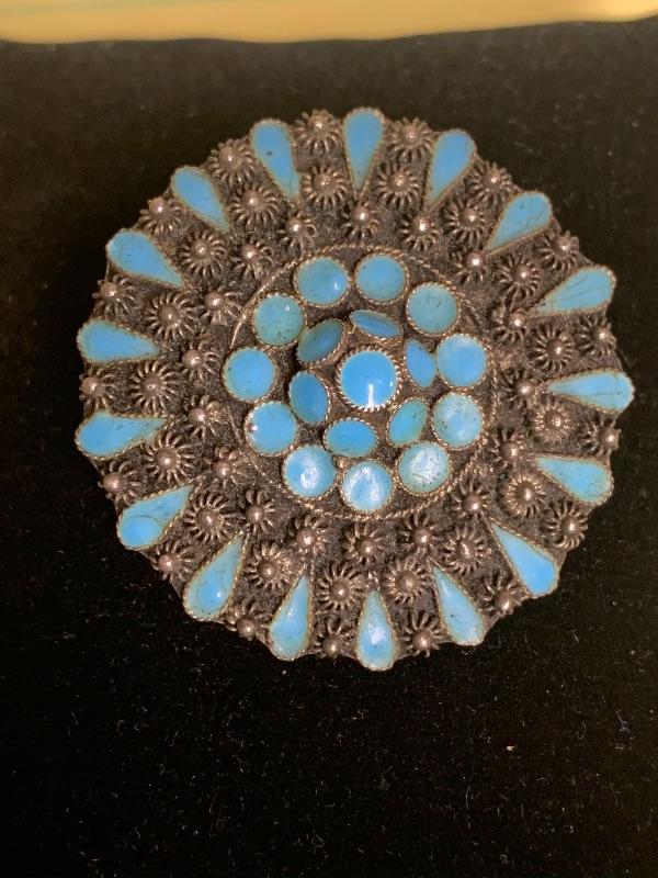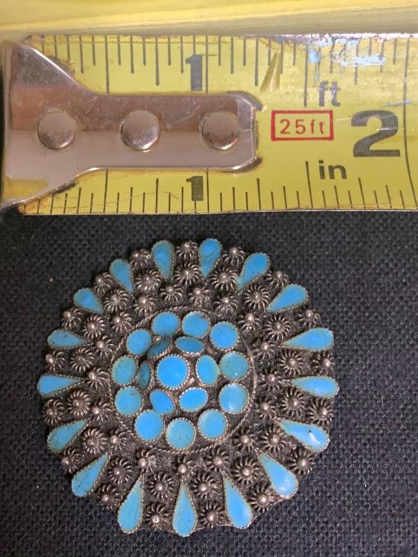 LOT # 61 VINTAGE STERLING SILVER 950 TURQUOISE ORNATE BROOCH PIN 1 1/2 " CIRCLE