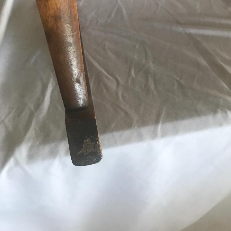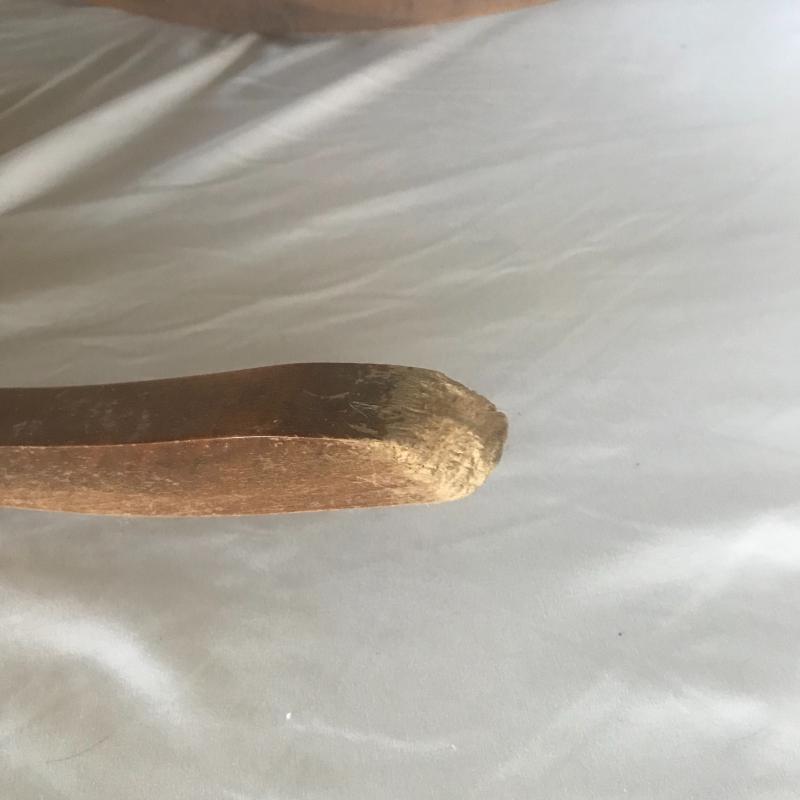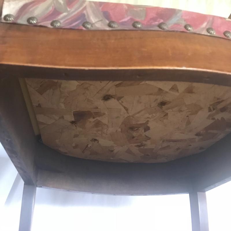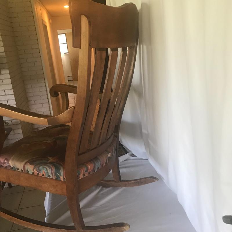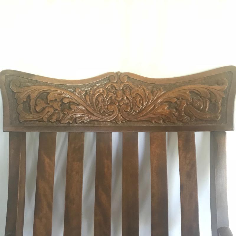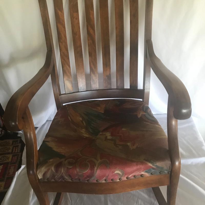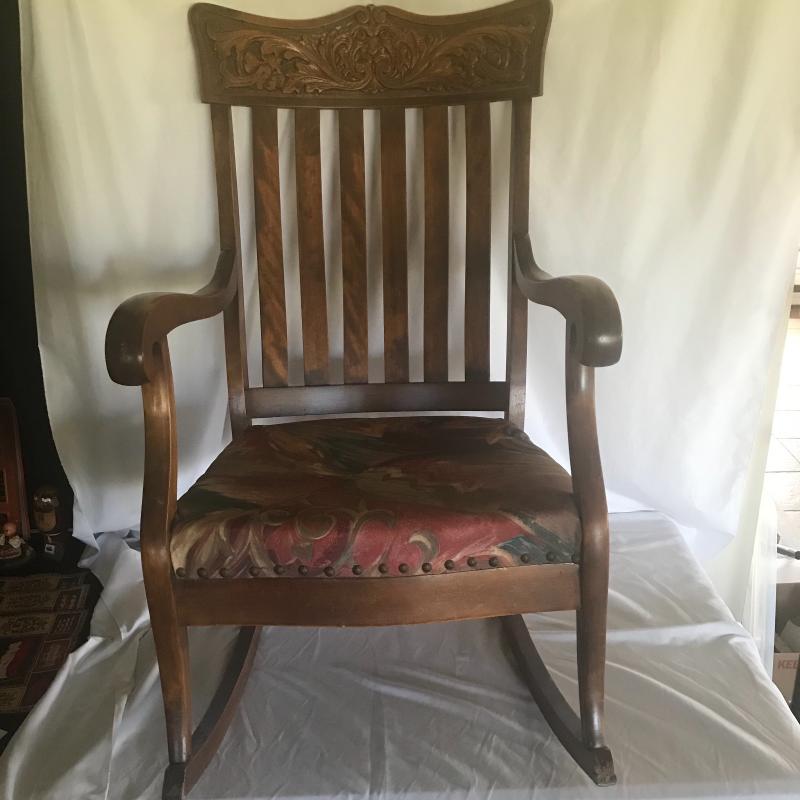 New cushion added, see pic of this lovely detailed rocker. Rocker feet have some animal markings but are still functional and could be repaired. See pics. Piece measures 22.5” x 31.5” x 40”. Local pick up only.