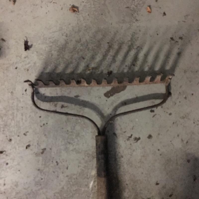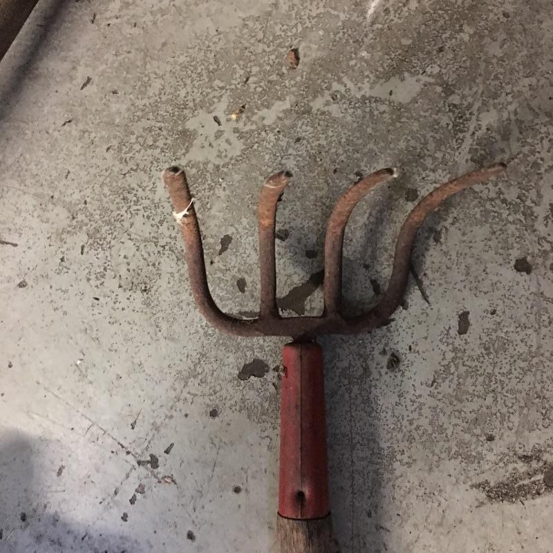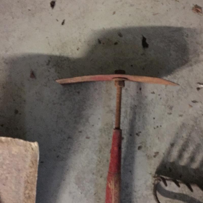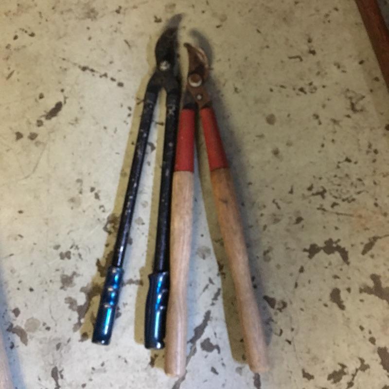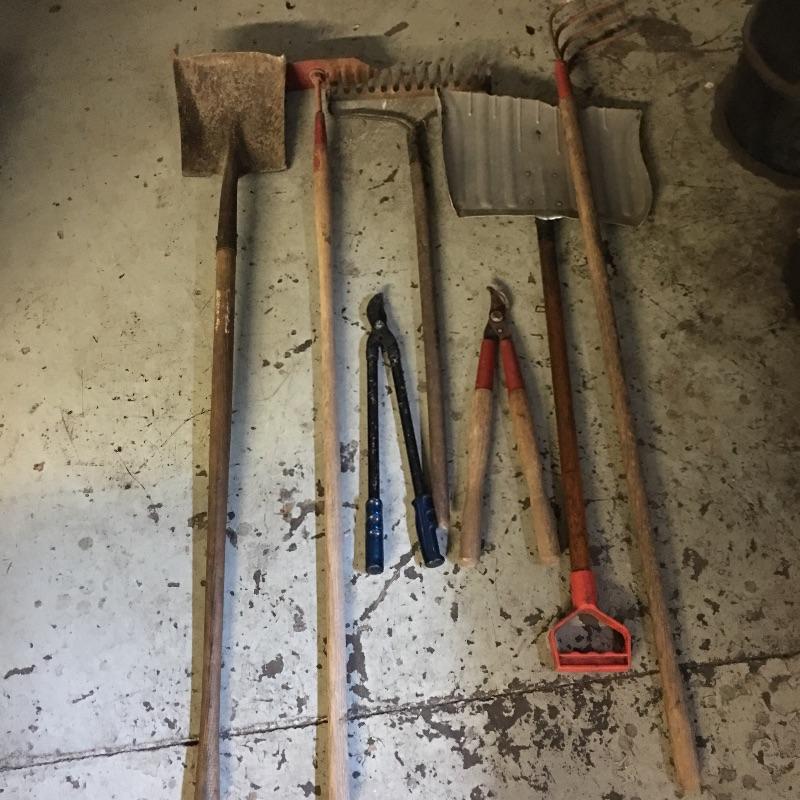 Selection of yard tools including shovel, heavy rake, fork, snow shovel, hoe and two pair of loppers. Keep your yard nice and tidy with this collection of tools. Rake handle is broken.