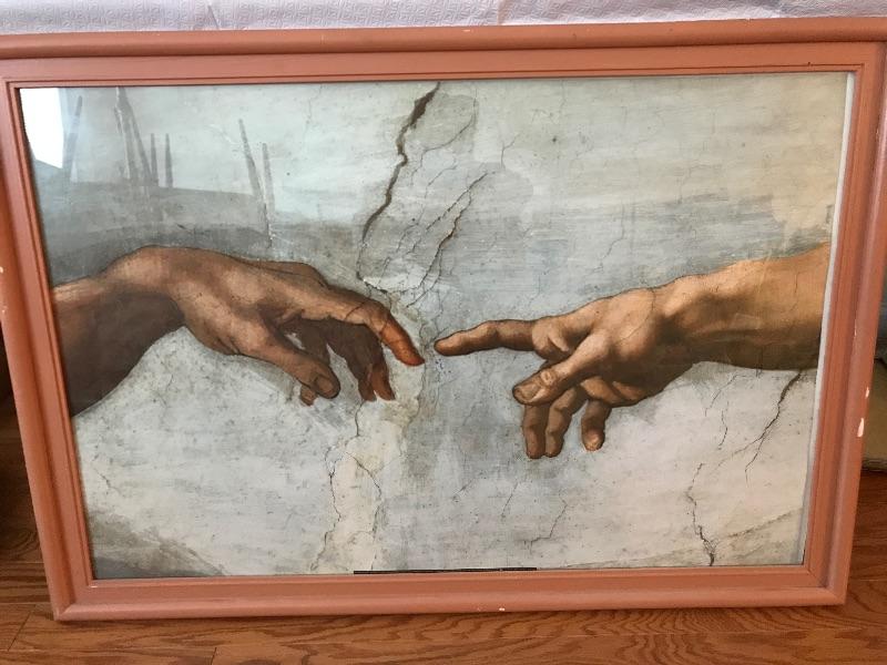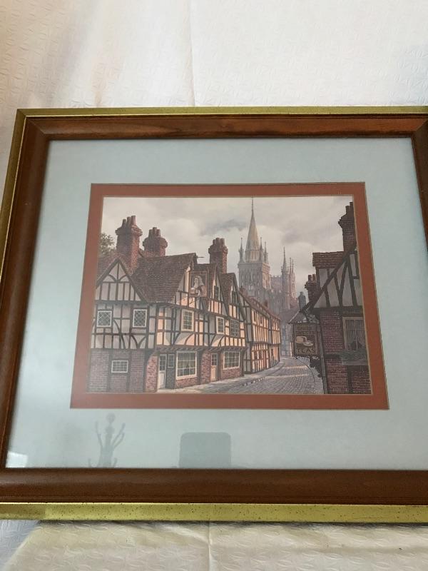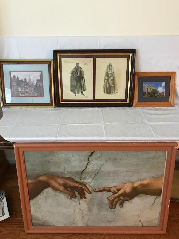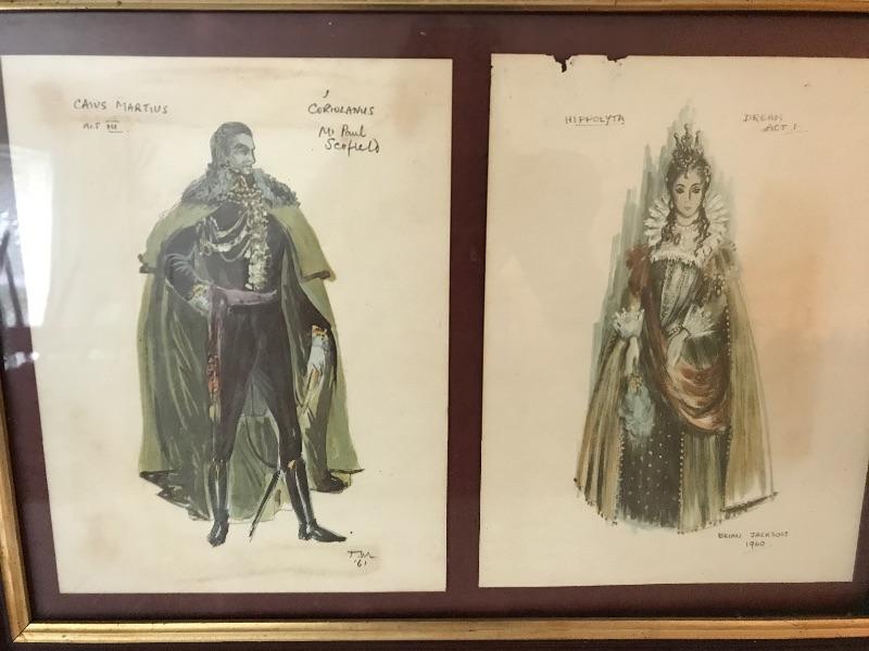 Large print From the Creatiob of Adam Sistine Chapel , small print of Saint Marys, small print of the streets of England, two framed sketches Coriolanus Paul Schofield, Hippolyta Dream Act 1 Brian Jackson 1960