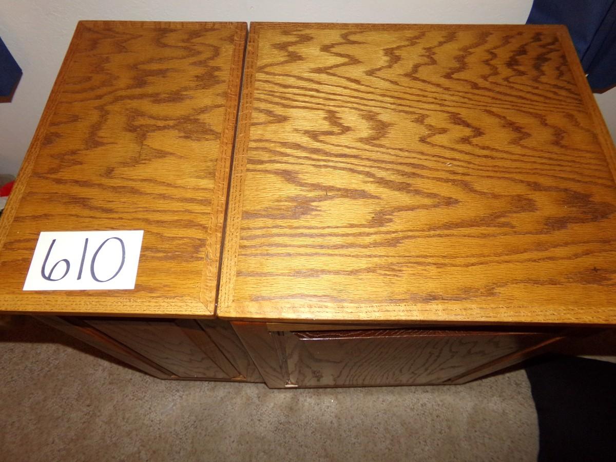 OAK STORAGE CABINET WITH 4 PULL-OUT SHELVES AND 3 REGULAR SHELVES. THE TOP FOLDS OUT FOR A RECORD PLAYER.