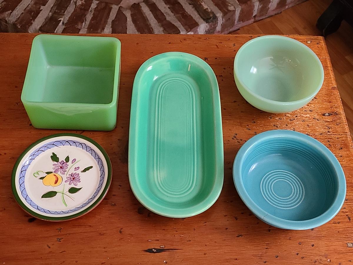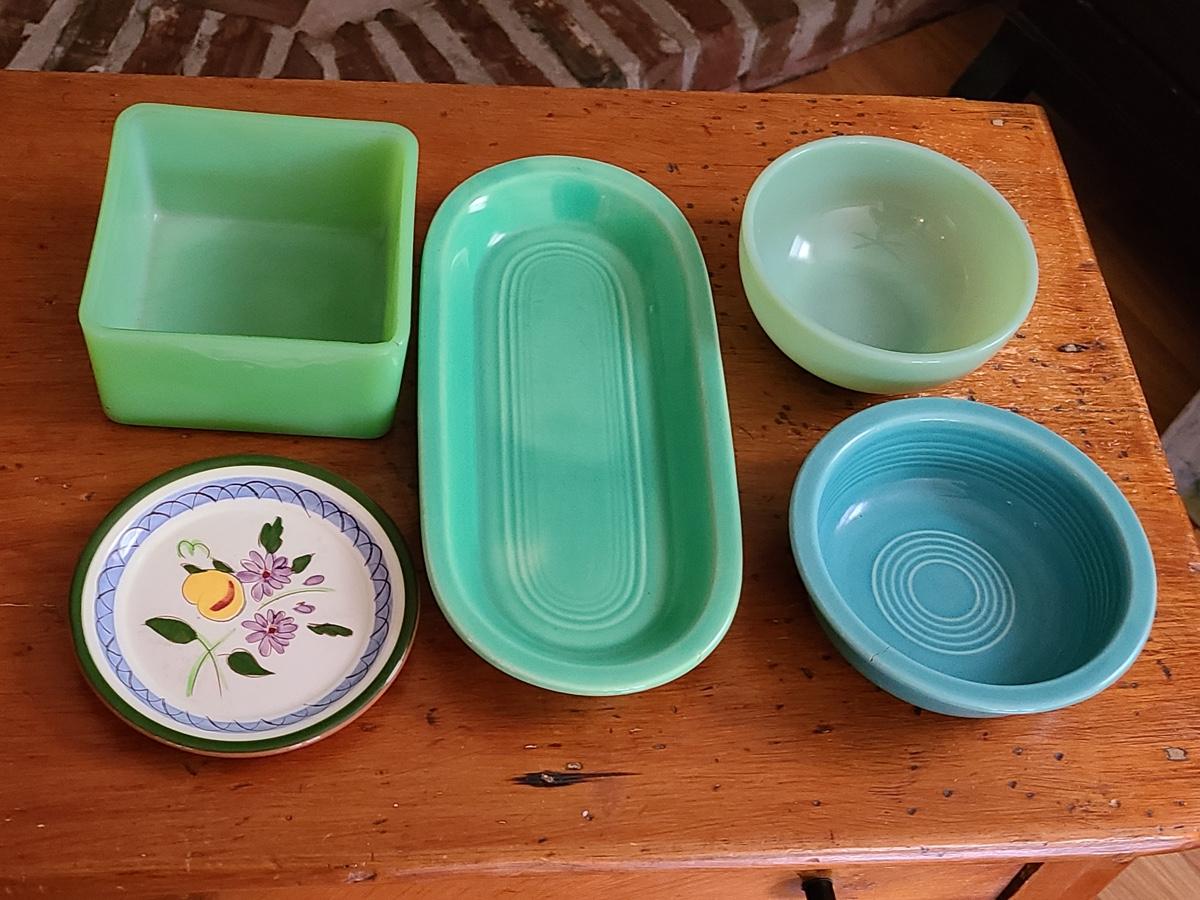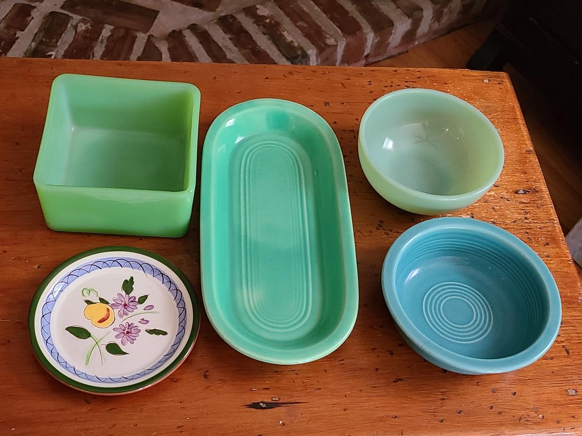 Mixed lot of vintage collectibles including unmarked Jadeite square "bowl", Fire-King small bowl, Stangl trinket dish, and Fiesta pieces.
