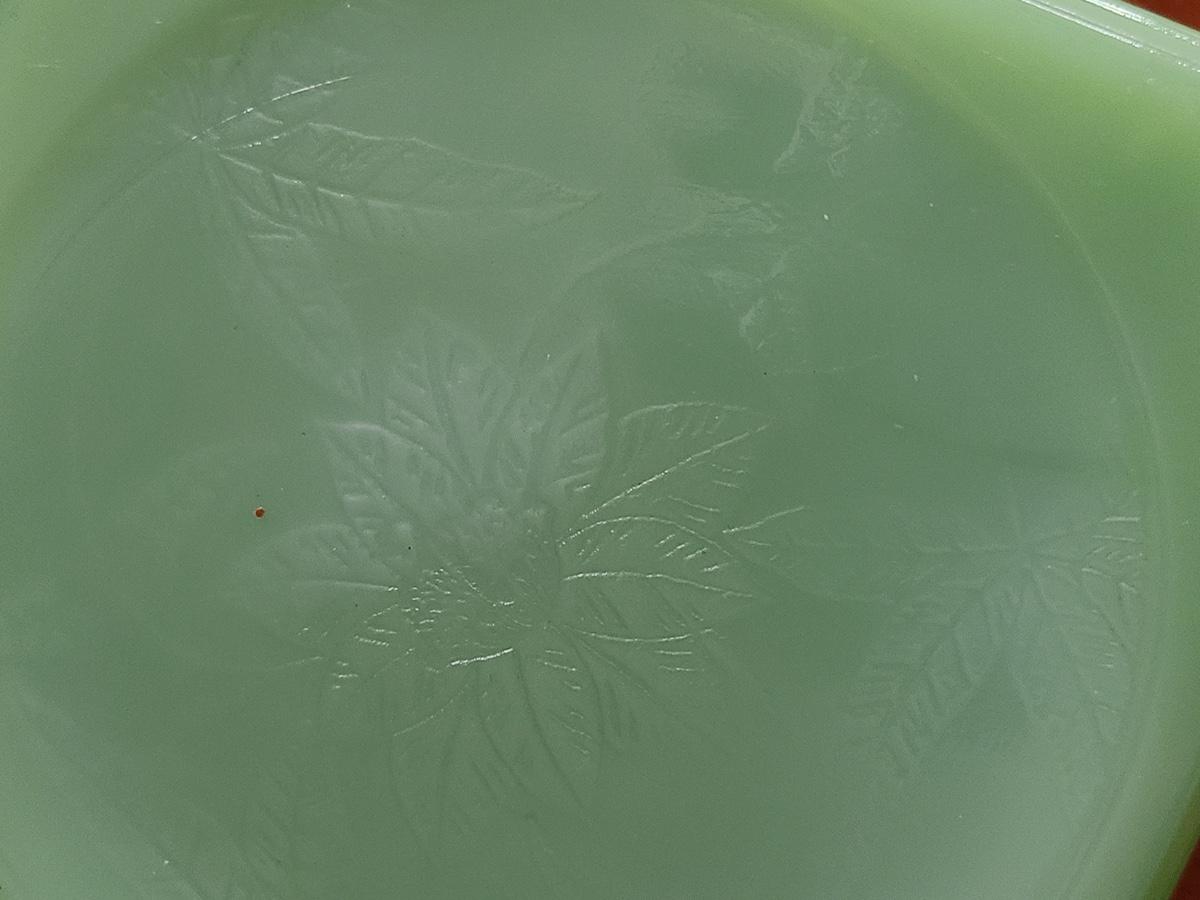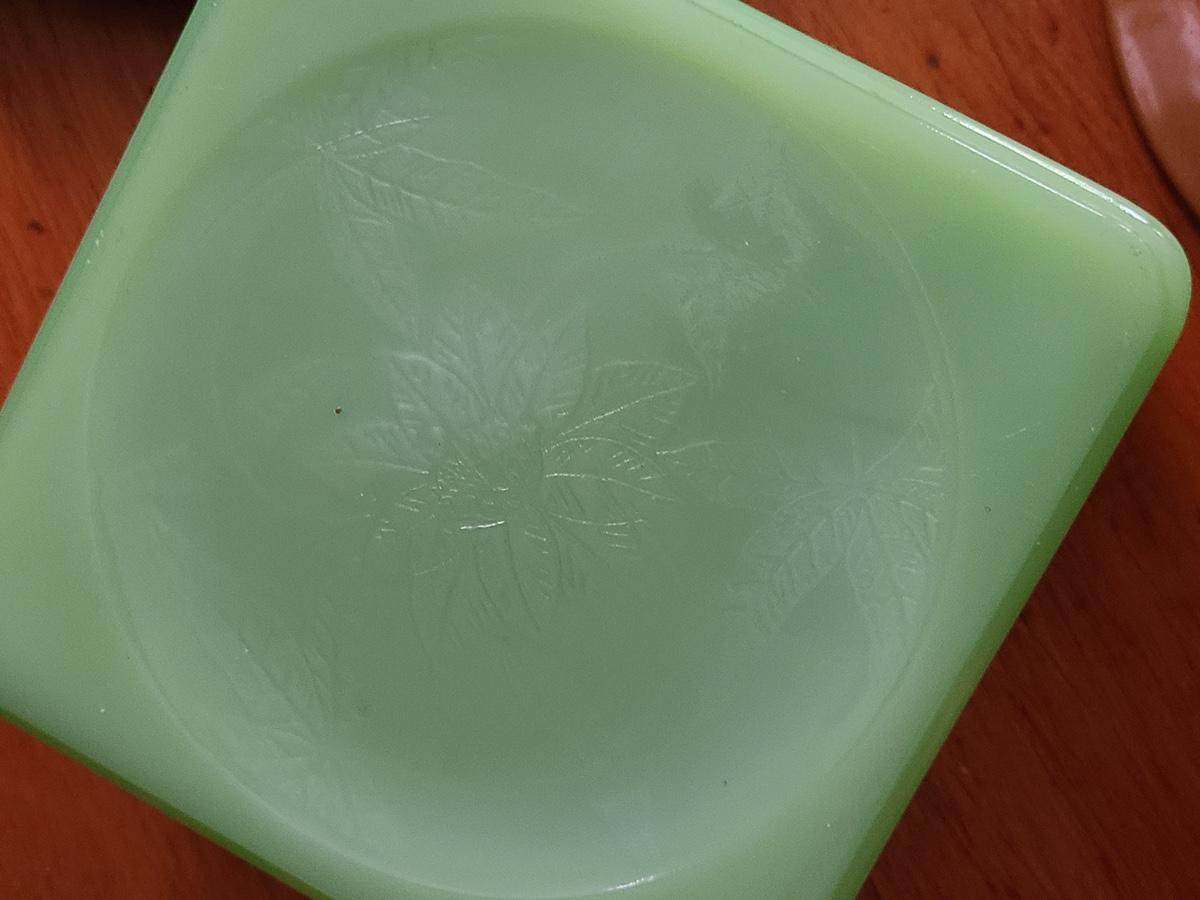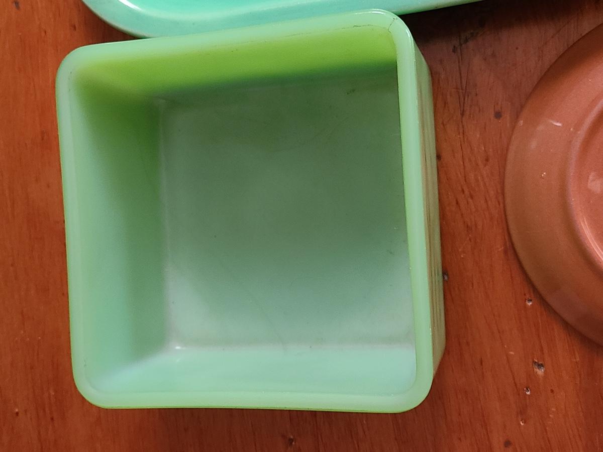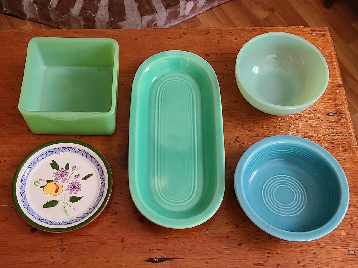 Mixed lot of vintage collectibles including unmarked Jadeite square "bowl", Fire-King small bowl, Stangl trinket dish, and Fiesta pieces.