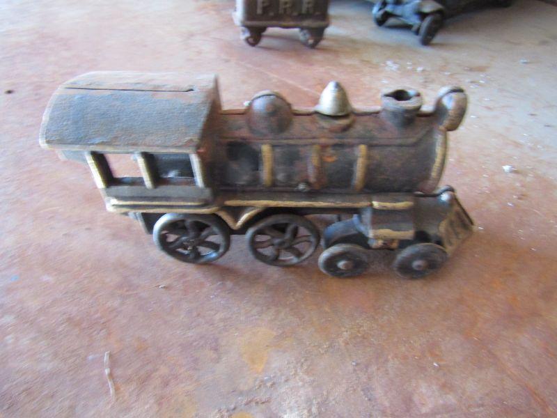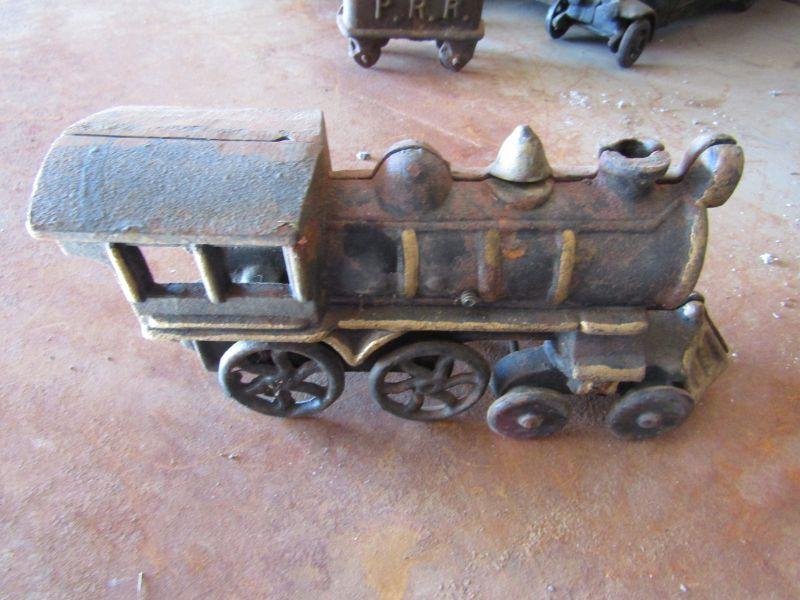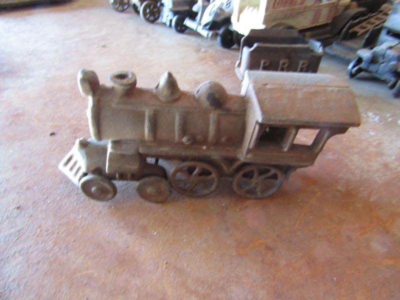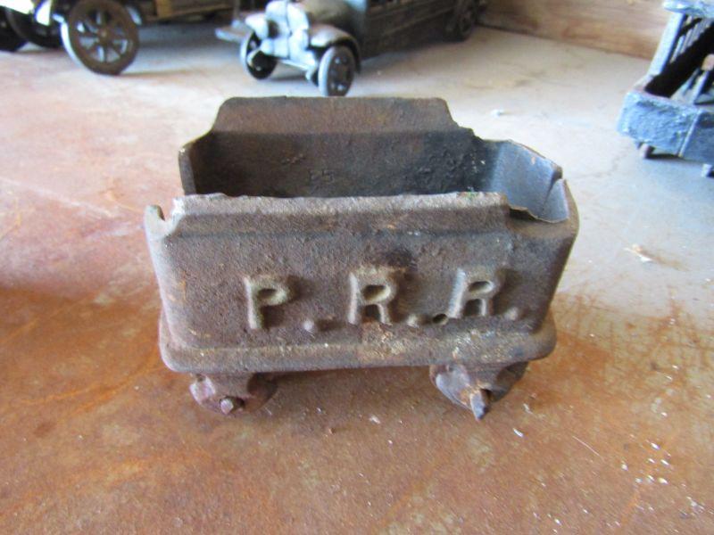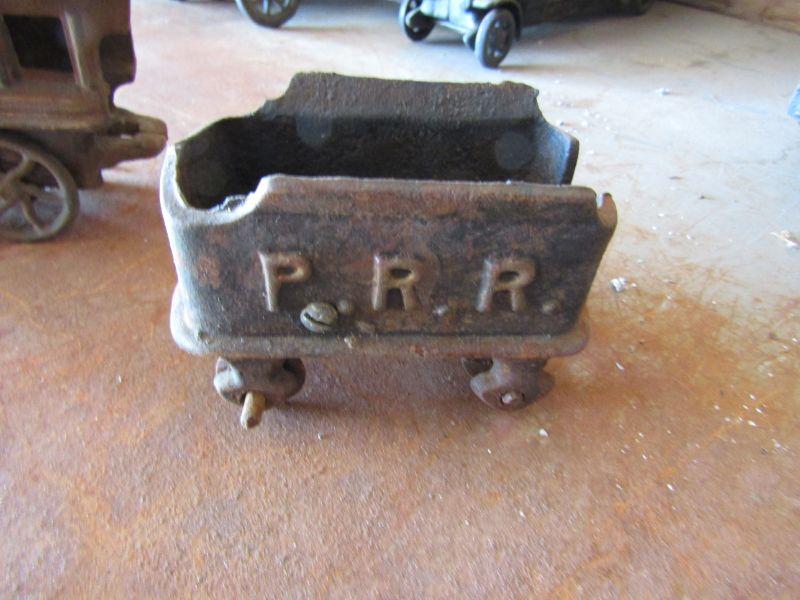 VINTAGE ANTIQUE CAST IRON TOY TRAIN WITH ENGINE. EMBOSSED WITH P. R. R. PENNSYLVANIA RAILROAD. FAIR CONDITION. SLIGHT RUSTING. VEHICLE COLLECTOR'S ITEM. TRAIN MEMORABILIA COLLECTIBLES.