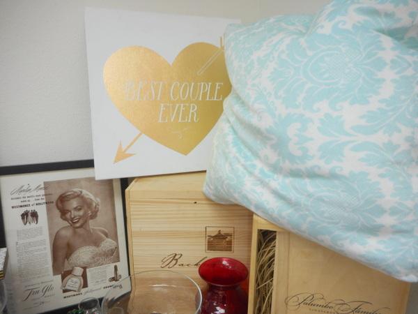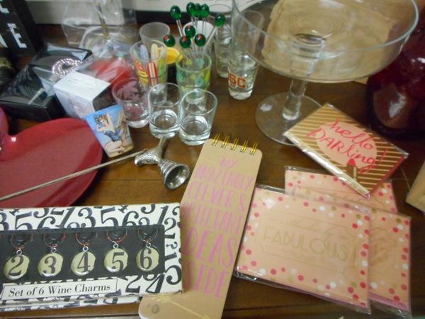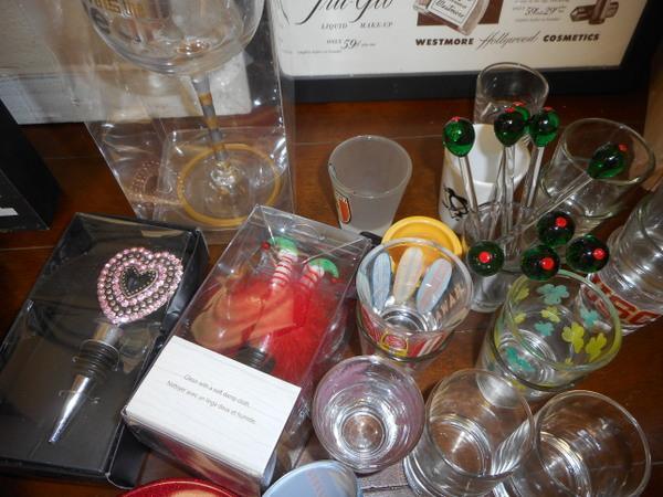 Everything you see is included. Some items are blue & white bean bag cube, shotglasses, rhinestone cork stopper, wine glass, cute napkin rings, snuffer and metal "&" sign.