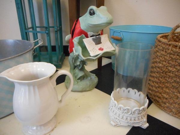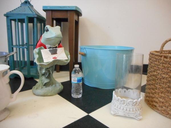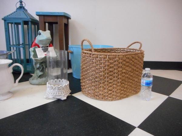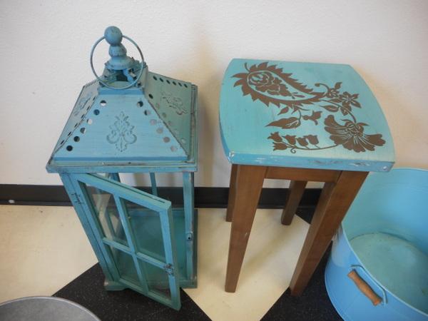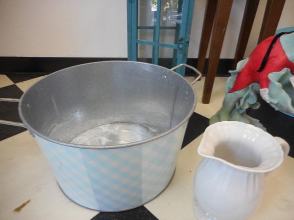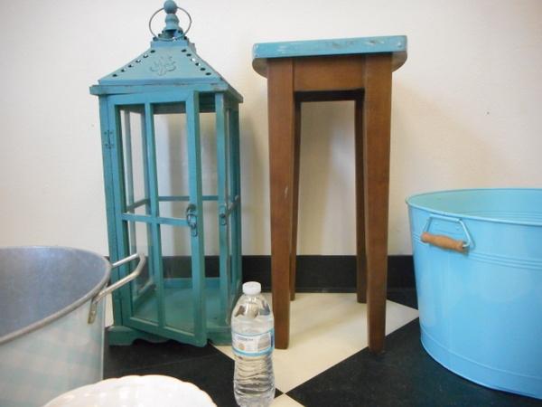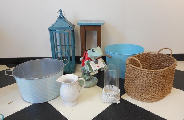 29" tall metal "lantern". 23" tall small wood table. 2 metal wash bins and a wicker basket.