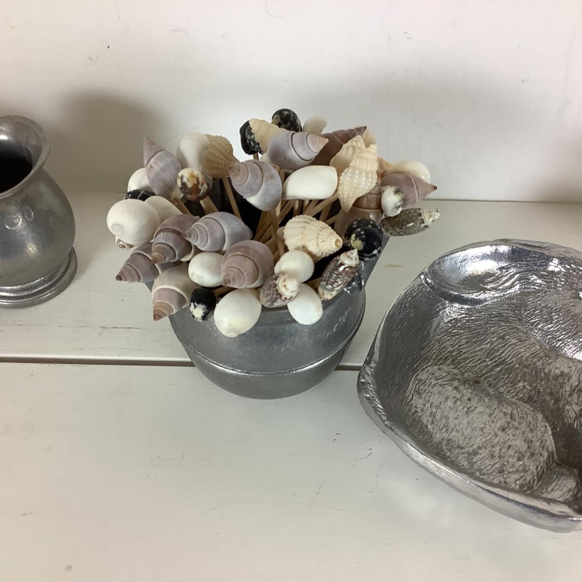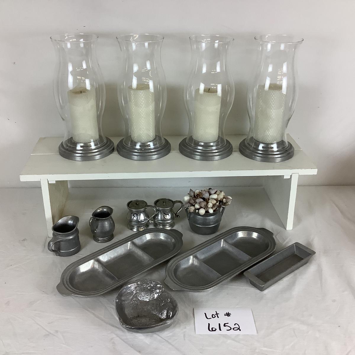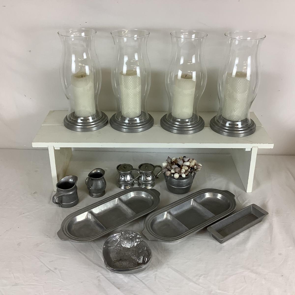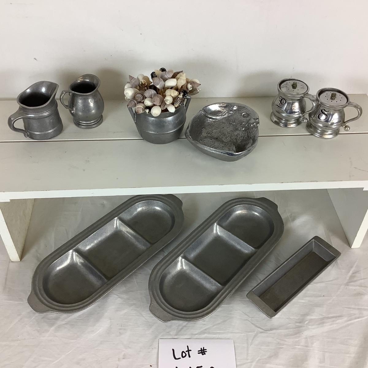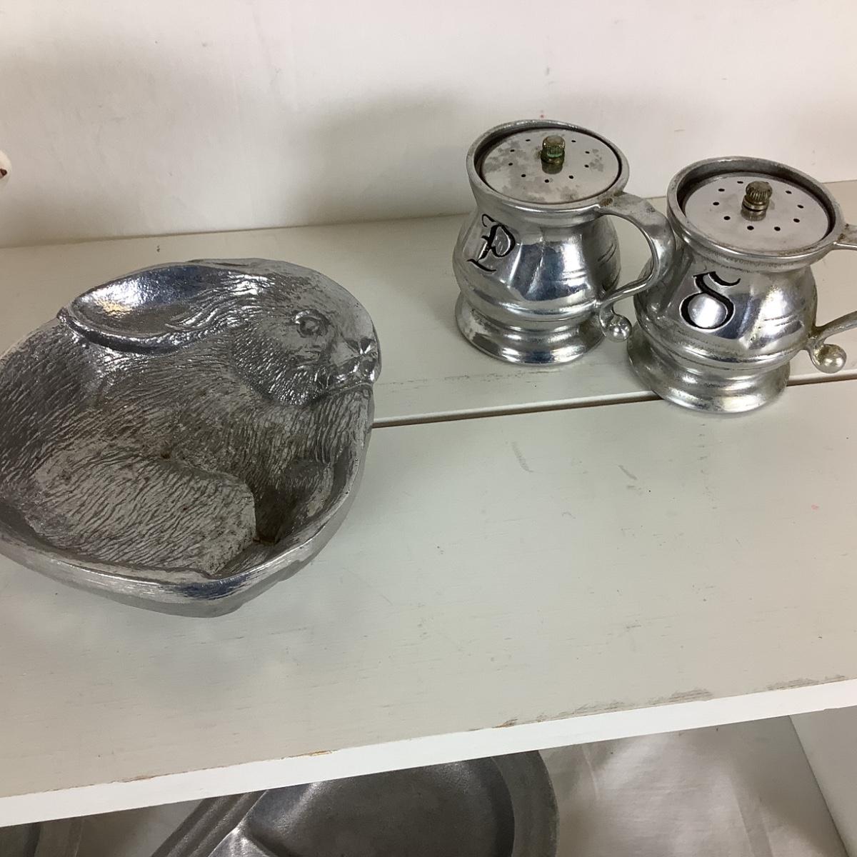 Pewter Holloware lot. 4 lanterns, 2 serving trays, salt and pepper, cream and sugar bowls, small tray, bunny bowl