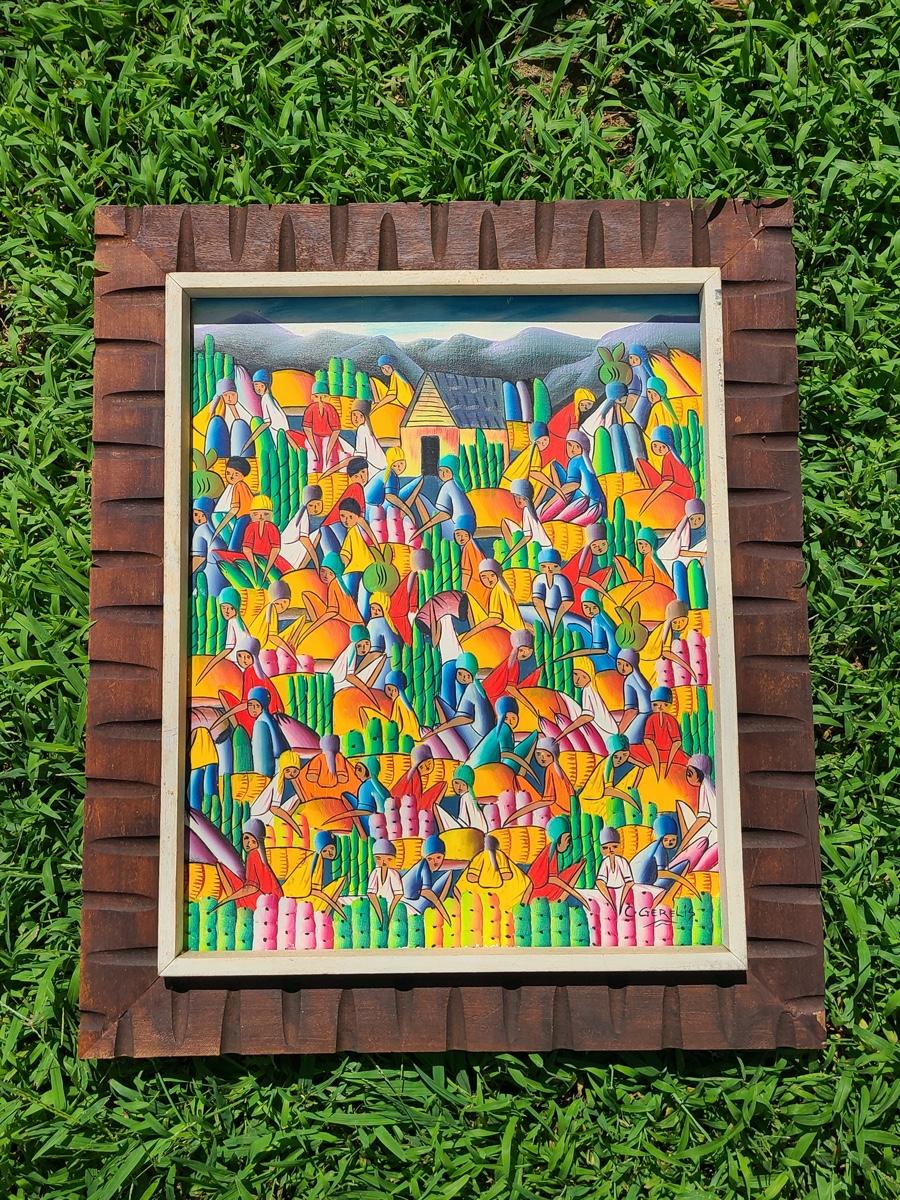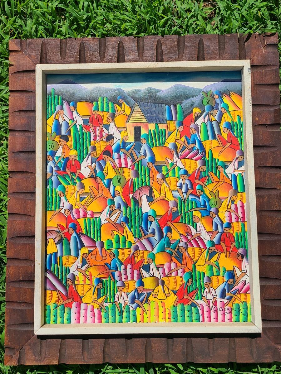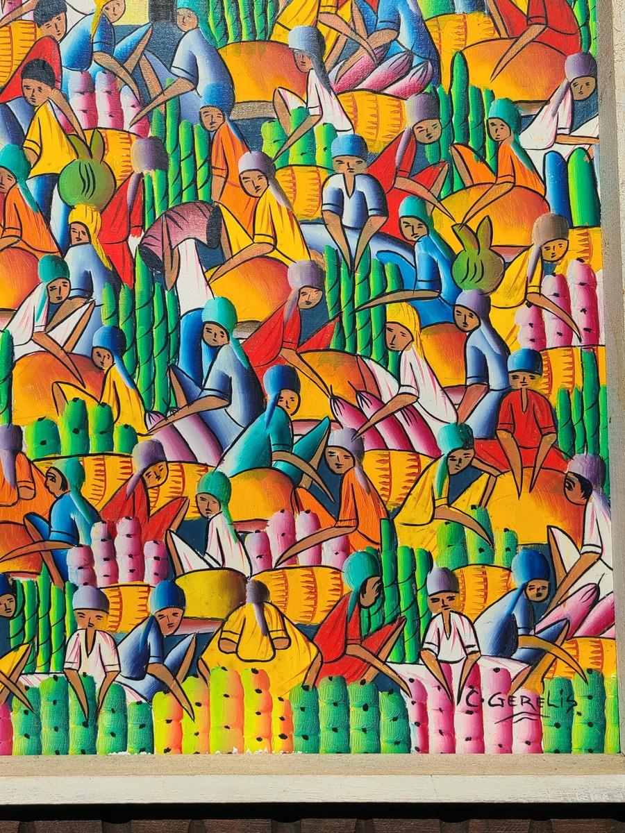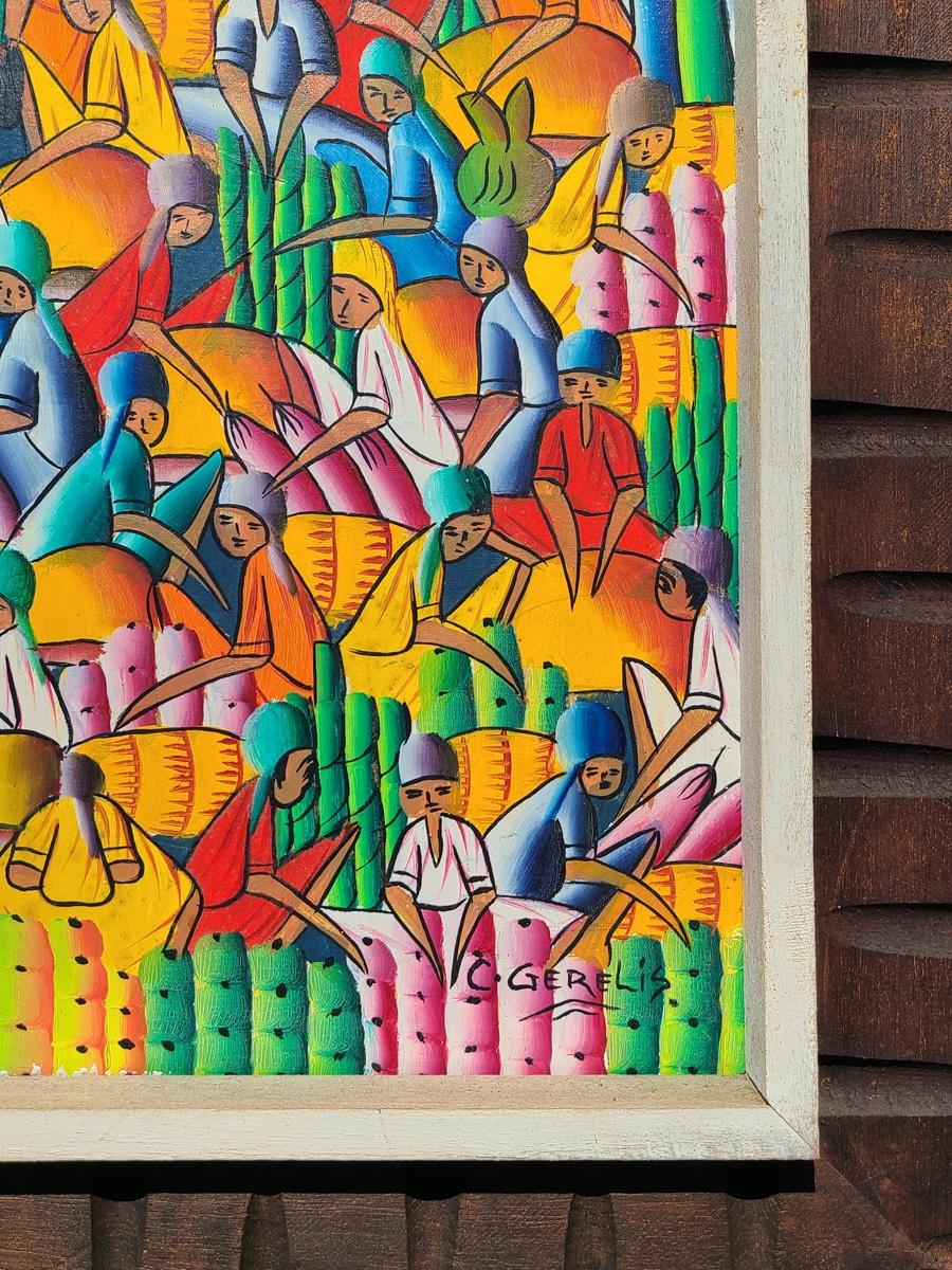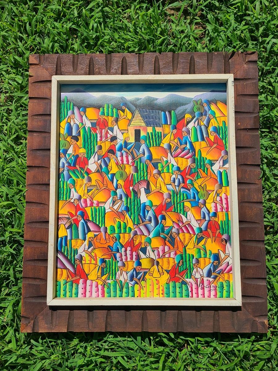 This piece is most likely from Haiti and is done by the artist C. Gerelis. Looks to be stretched canvas in vintage wood frame! Please see all pictures as they are the best representation of the items. The pictures show condition, measurements if taken, and what is included in the lot. Due to the large amount that we photograph and the time frame, we are not always able to take measurements. All items unless noted, are pre-owned and have been used. If you purchased furniture, you must bring help. We do not allow one person to carry large furniture out on their own. Bring help, tools and a truck for the safety of our client’s homes, and your personal safety. Company policy. Thank you.