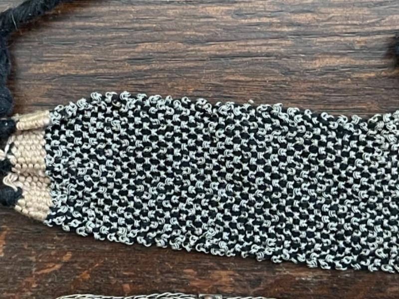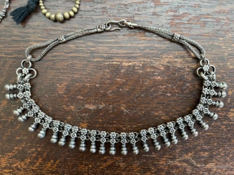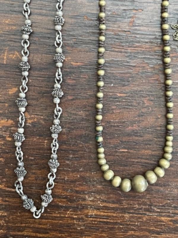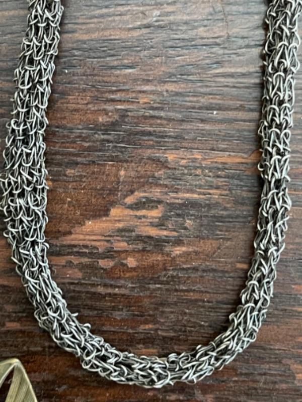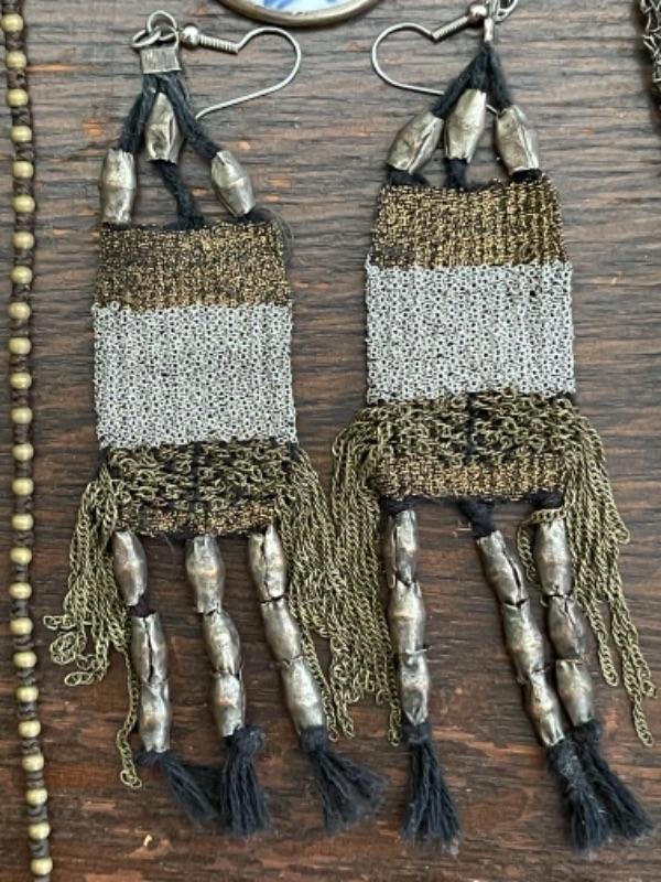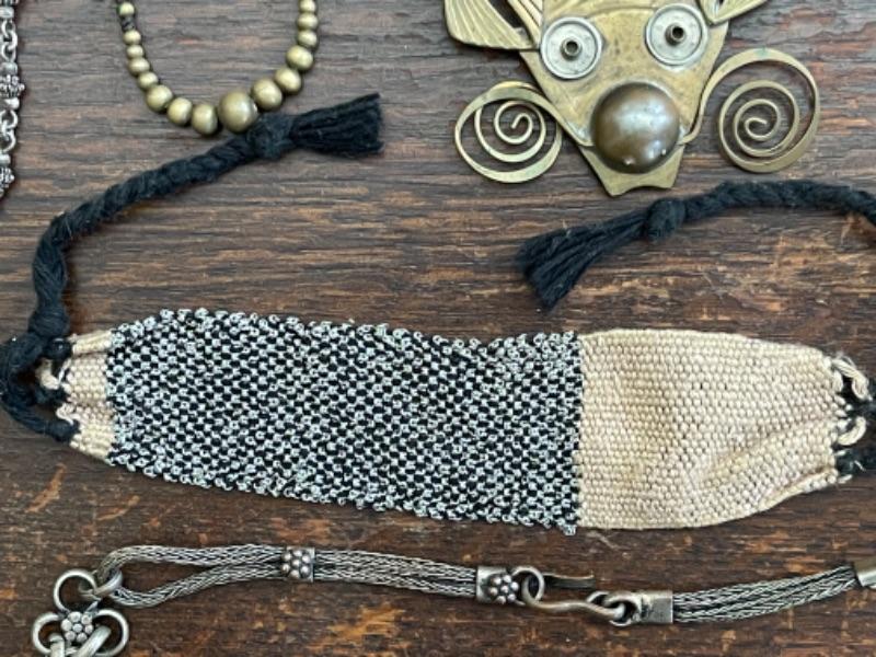 Lot 61LD. Assorted vintage jewelry, all metal; brass bead necklace; 2 metal bead necklaces, metal mesh earrings, metal mesh and hemp bracelet; brass brooch, porcelain pendant in sterling silver setting--$75