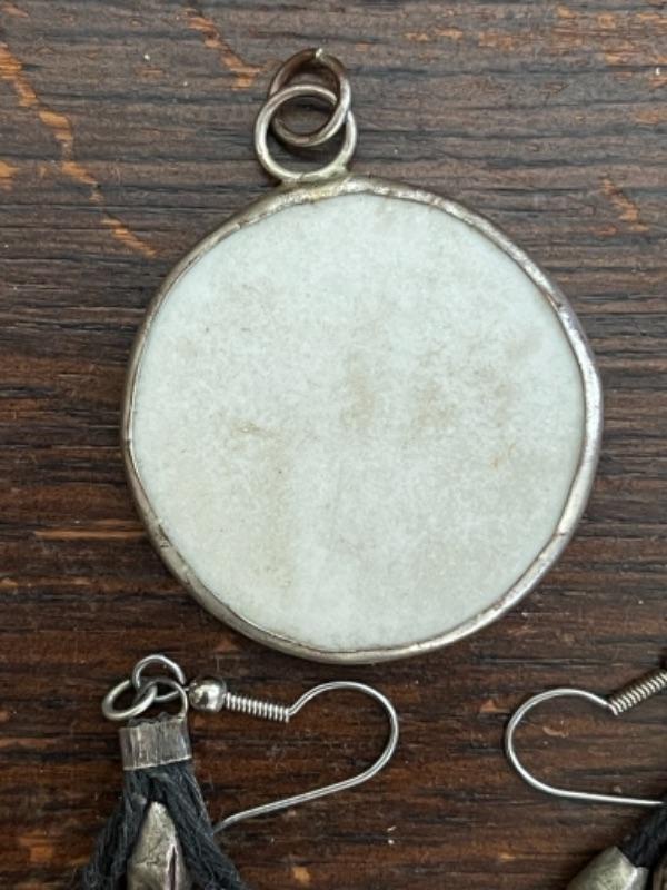 Lot 61LD. Assorted vintage jewelry, all metal;  necklaces, earrings, bracelet, brooch, pendant in sterling silver setting--$75