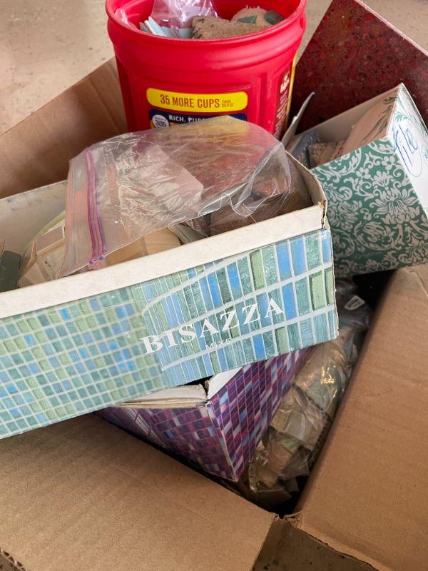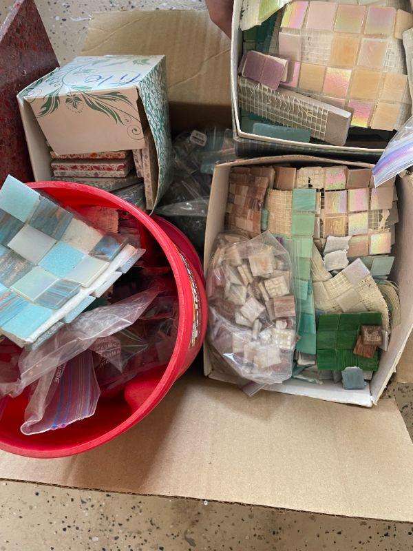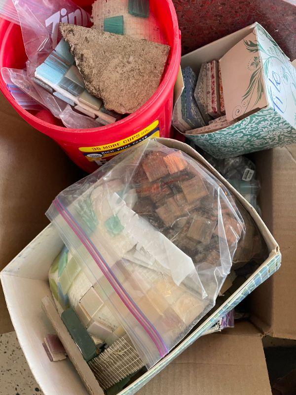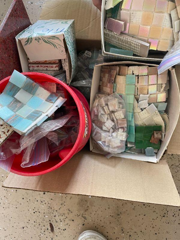 Lot 62 - (2) potting plants, wind chimes, misc. box of tiles, thinsulate boots size 11