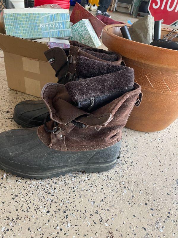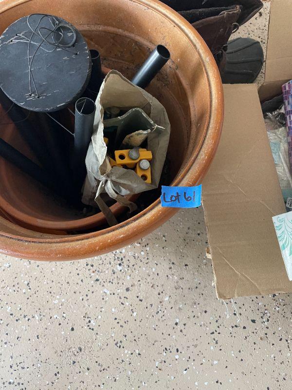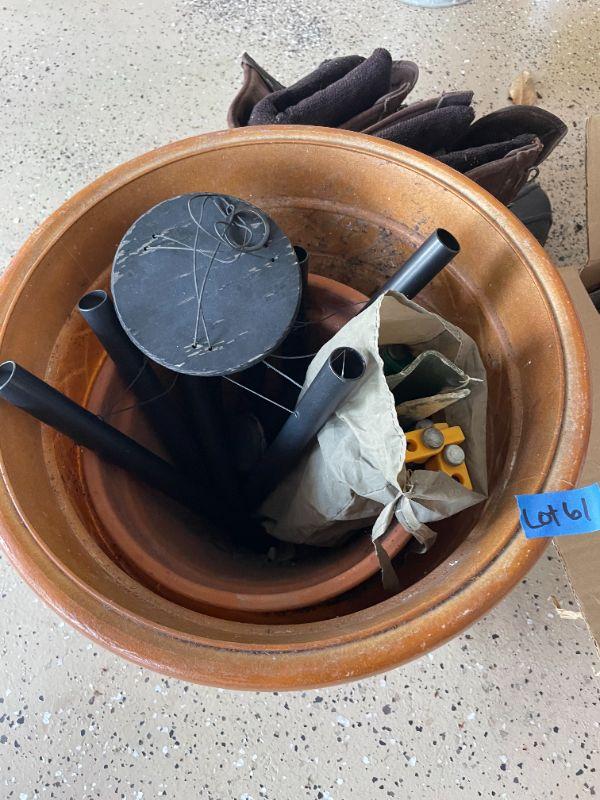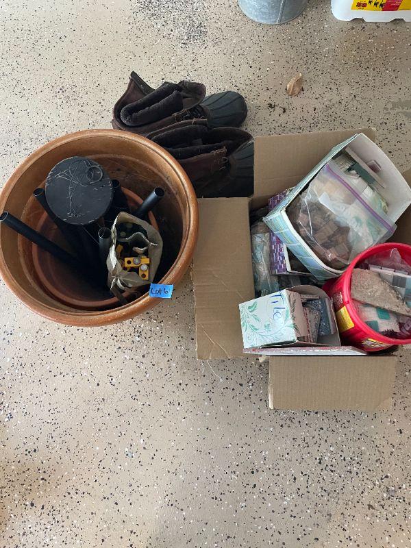 Lot 62 -  (2) potting plants, wind chimes, misc. box of tiles, thinsulate boots size 11