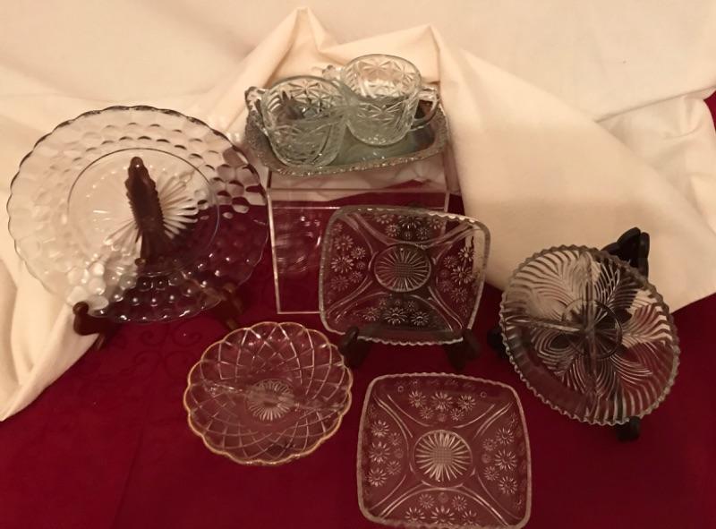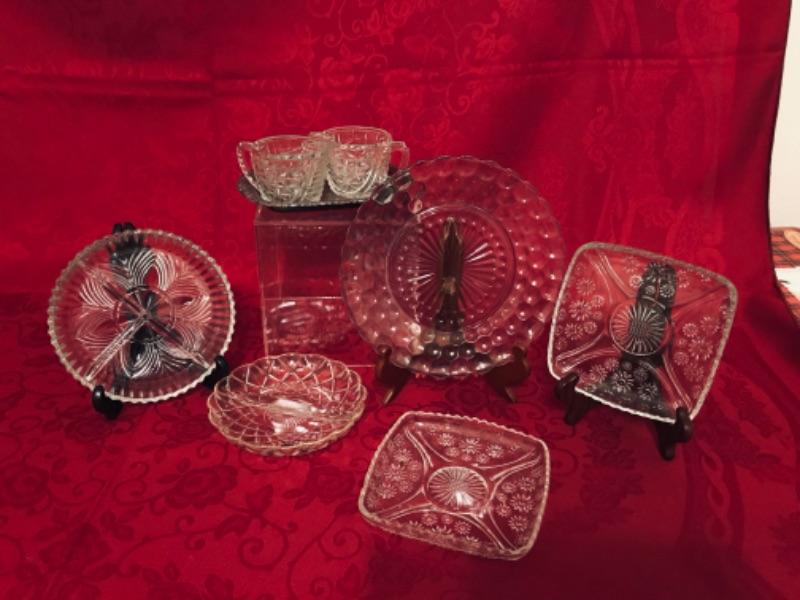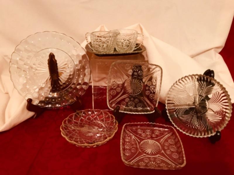 The cutest lot of glass party dishes. A cream and sugar on a silverplate tray. Two divided dishes. And two daisy pattern square plates and one large glass plate.