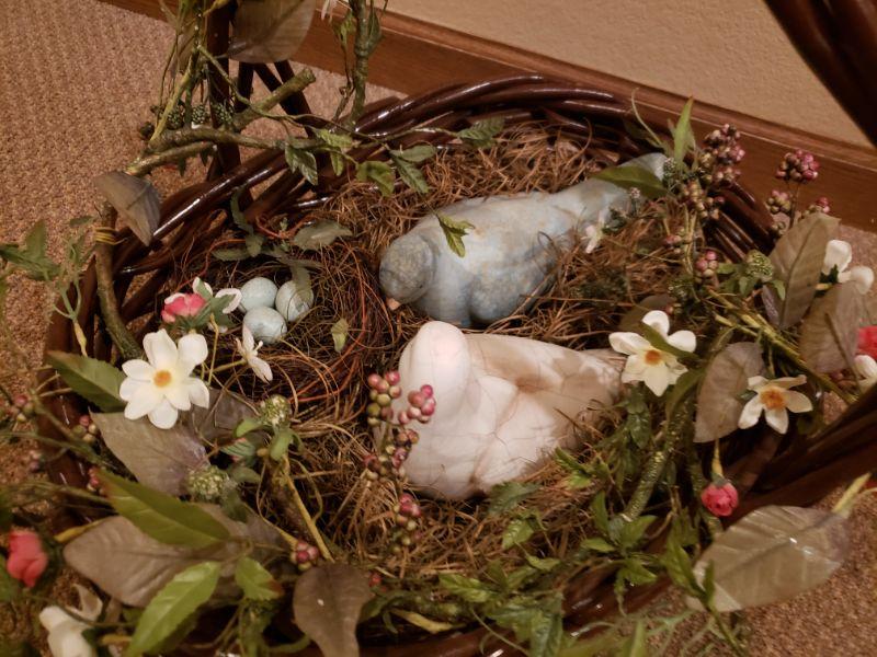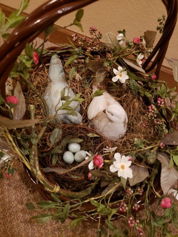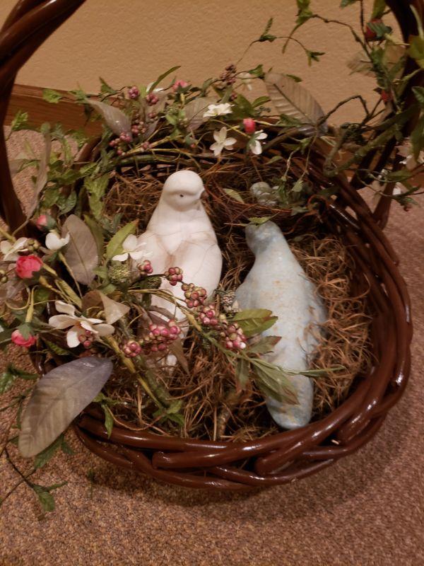 2 ceramic birds and a nest inside.