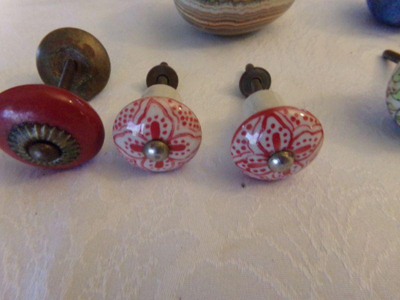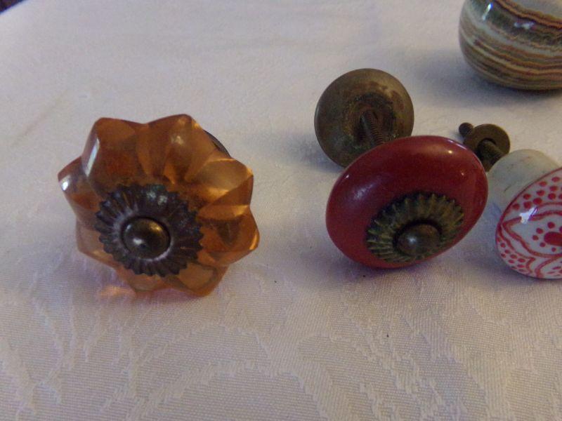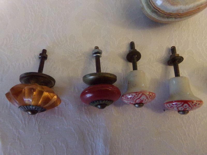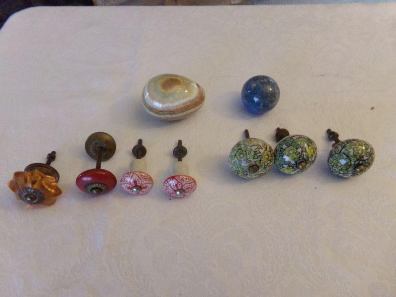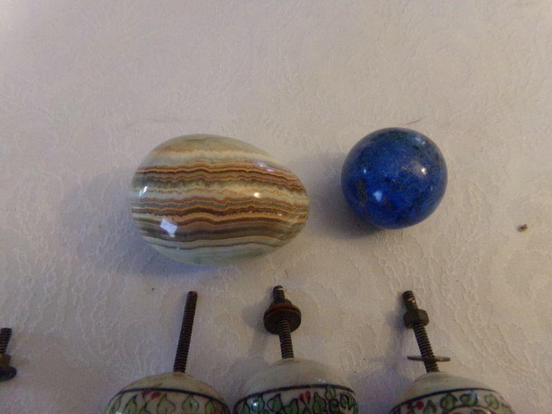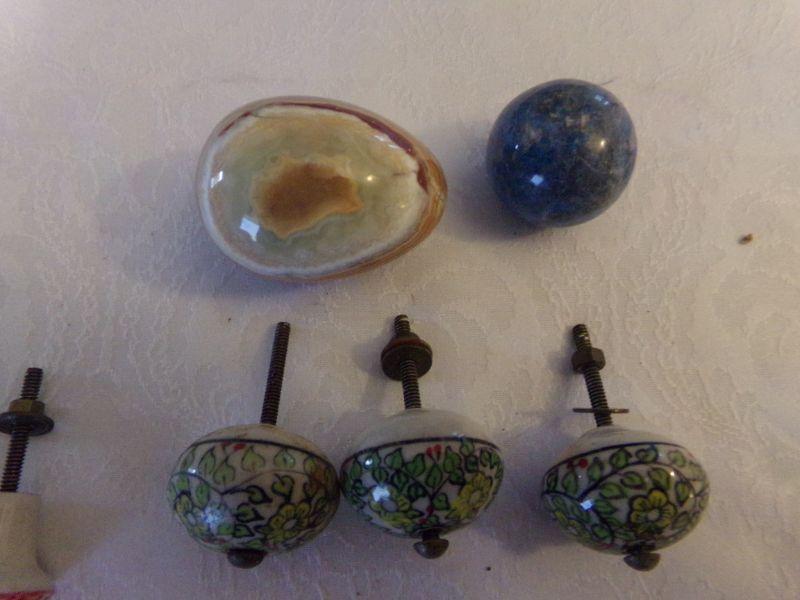 ANTIQUE KNOBS, SOME ARE PORCELAIN, AND THE ROCKS ARE ROUND, COLORFUL, AND SHINY. THEY ARE IN GOOD CONDITION.