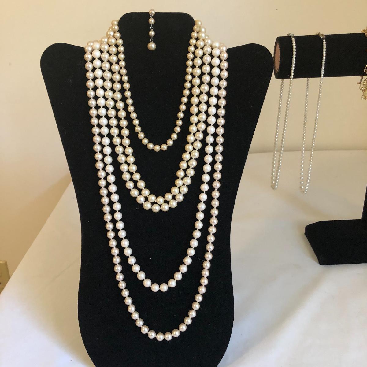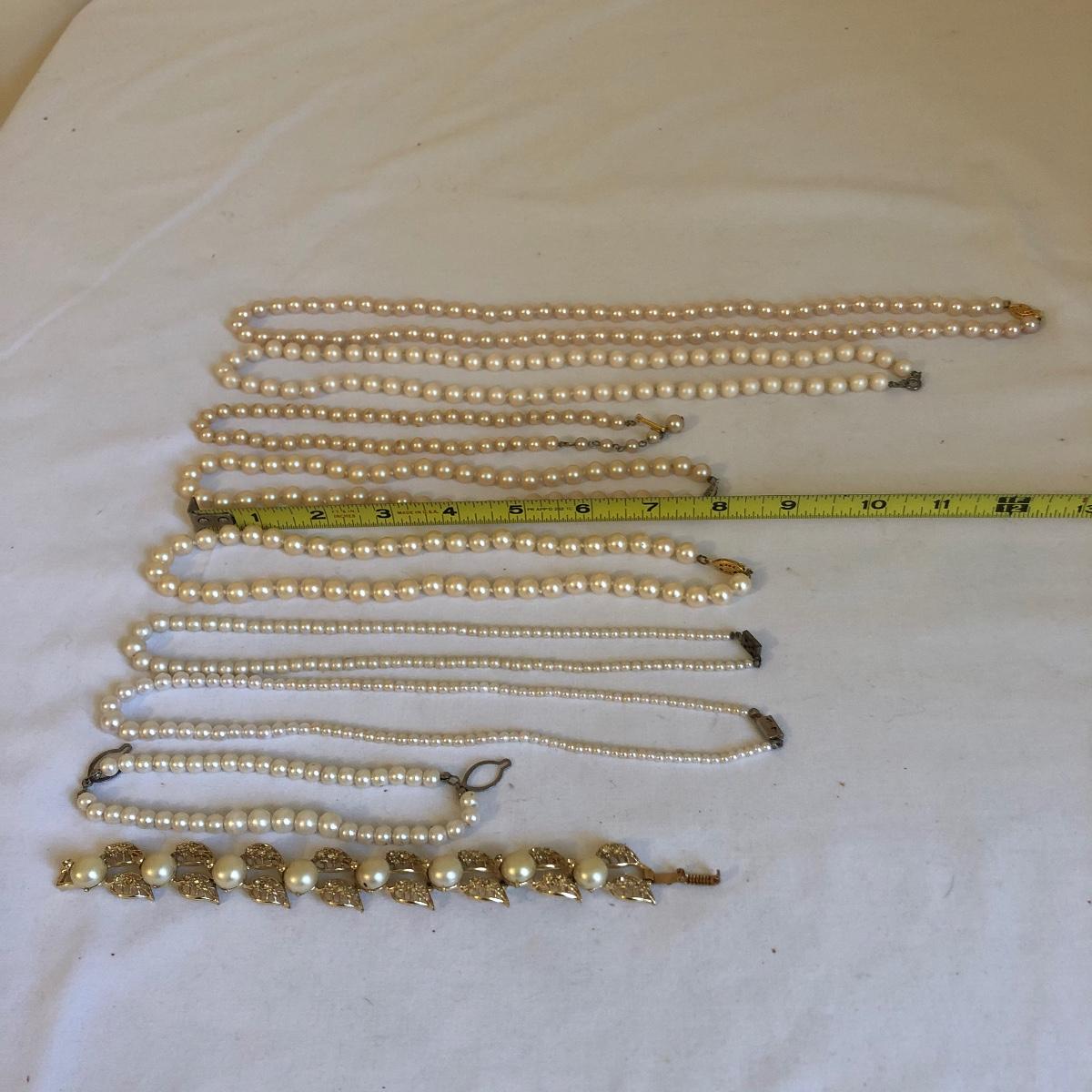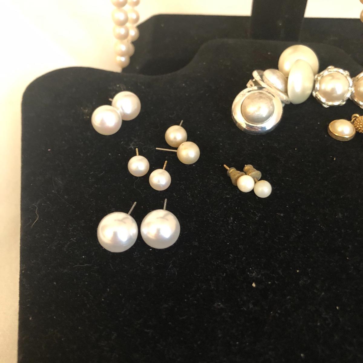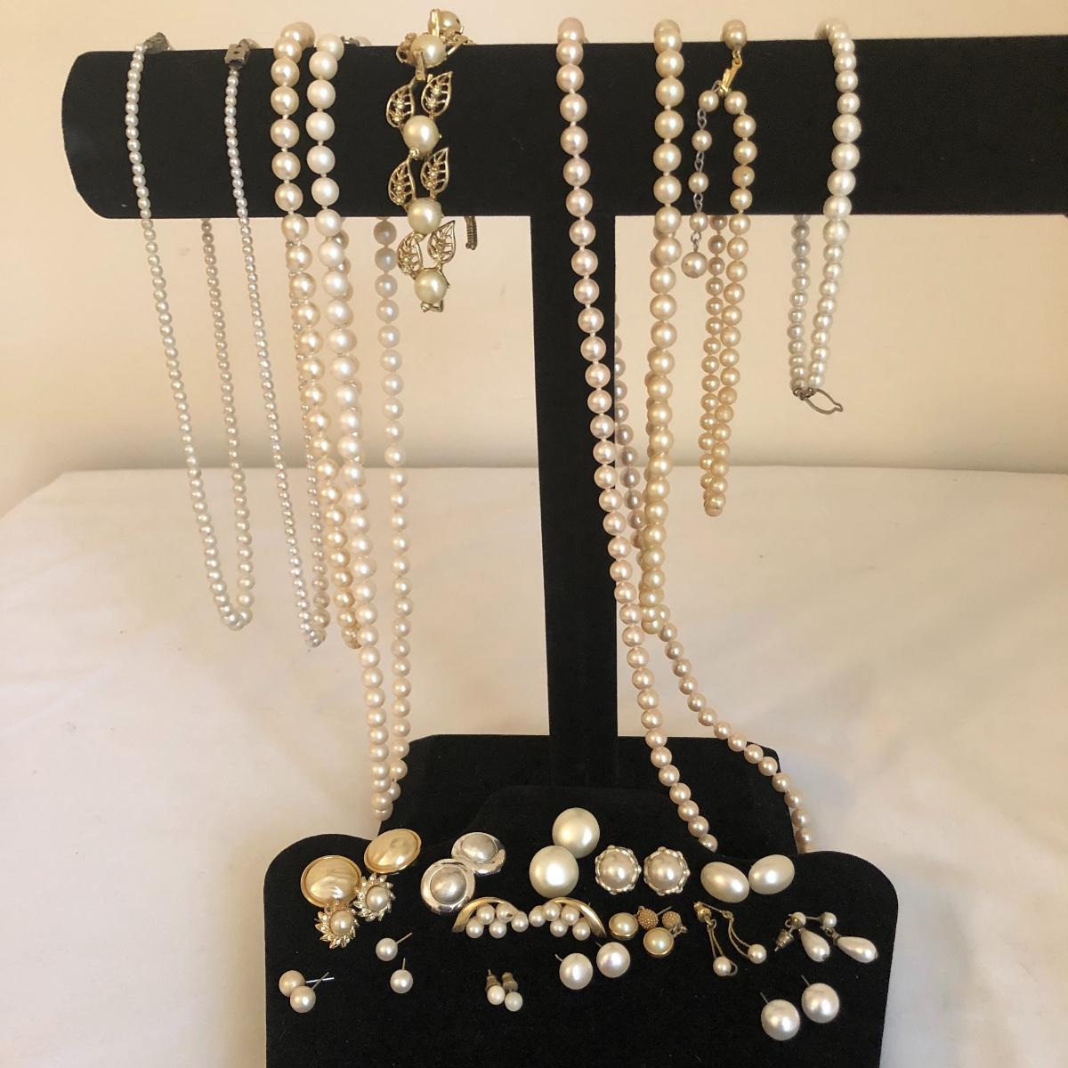 Adorn yourself with this large lot of pearls that includes earrings, necklaces and bracelet. We cannot guarantee that any pearls are genuine but a couple could possibly be real, in particular the longest necklace pictured last. The majority of the earrings are post with 2 pairs of clip-one.