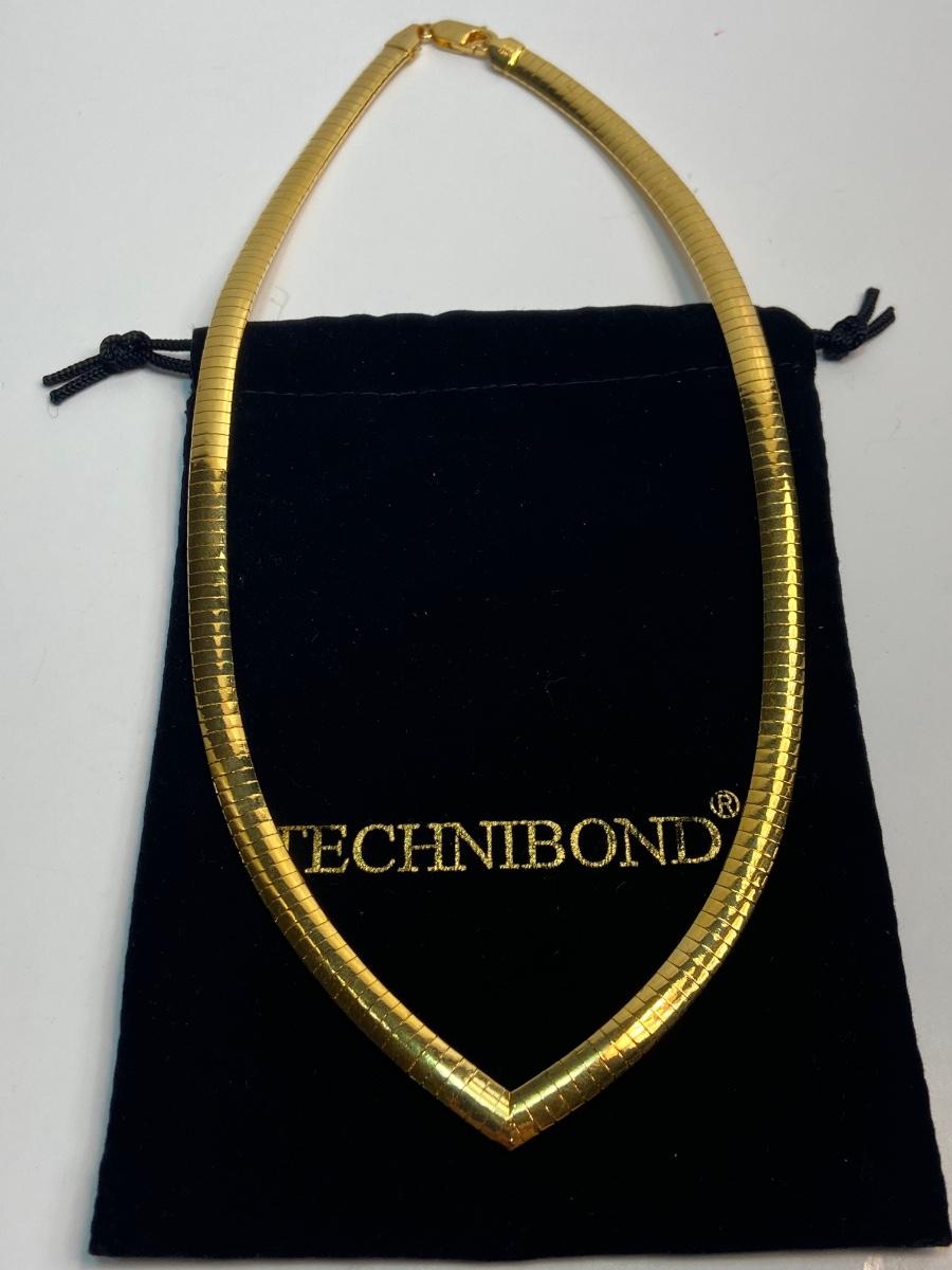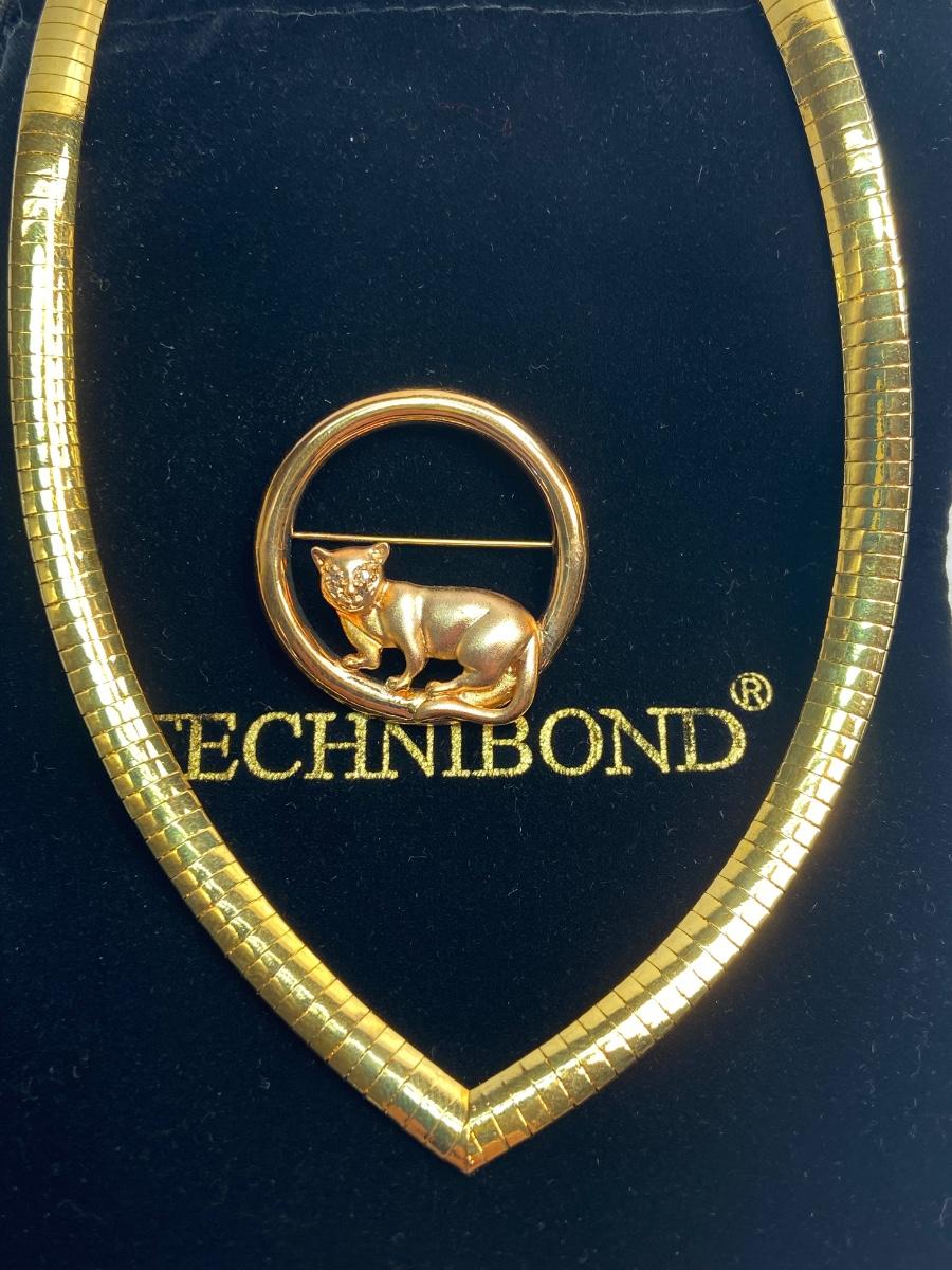 Vintage Technibond V-shaped choke with 18-kt gold bonded to sterling silver along with a gold tone cat pin.