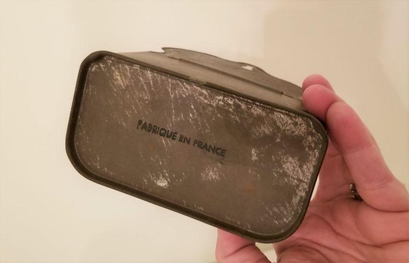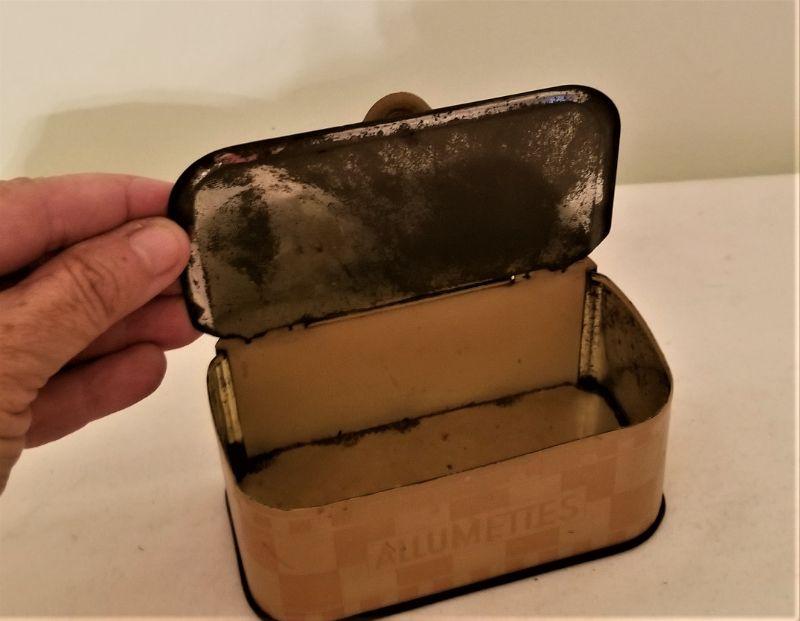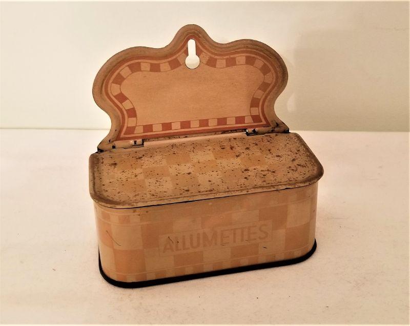 Once a staple in every kitchen - tin match box - rust on lid, ca. 1910. French word for matches "Allumettes" is on the front.