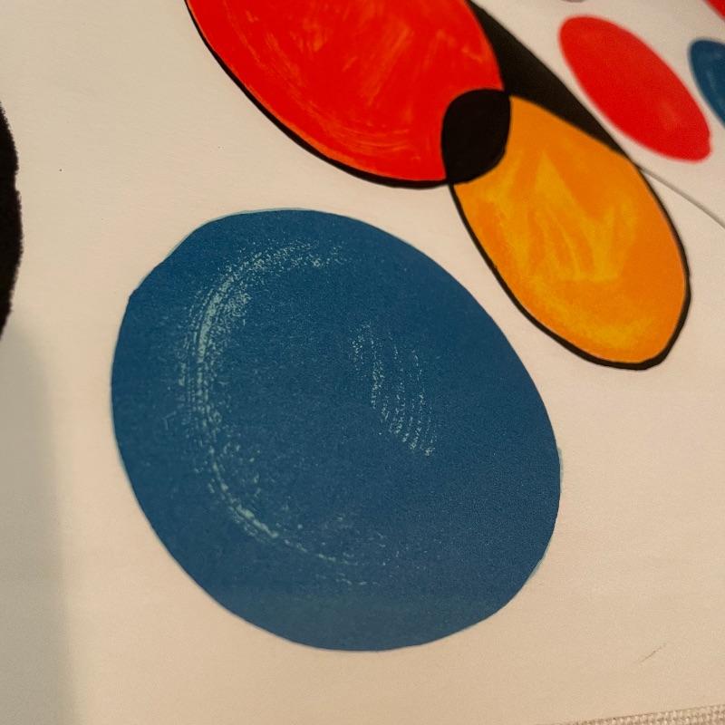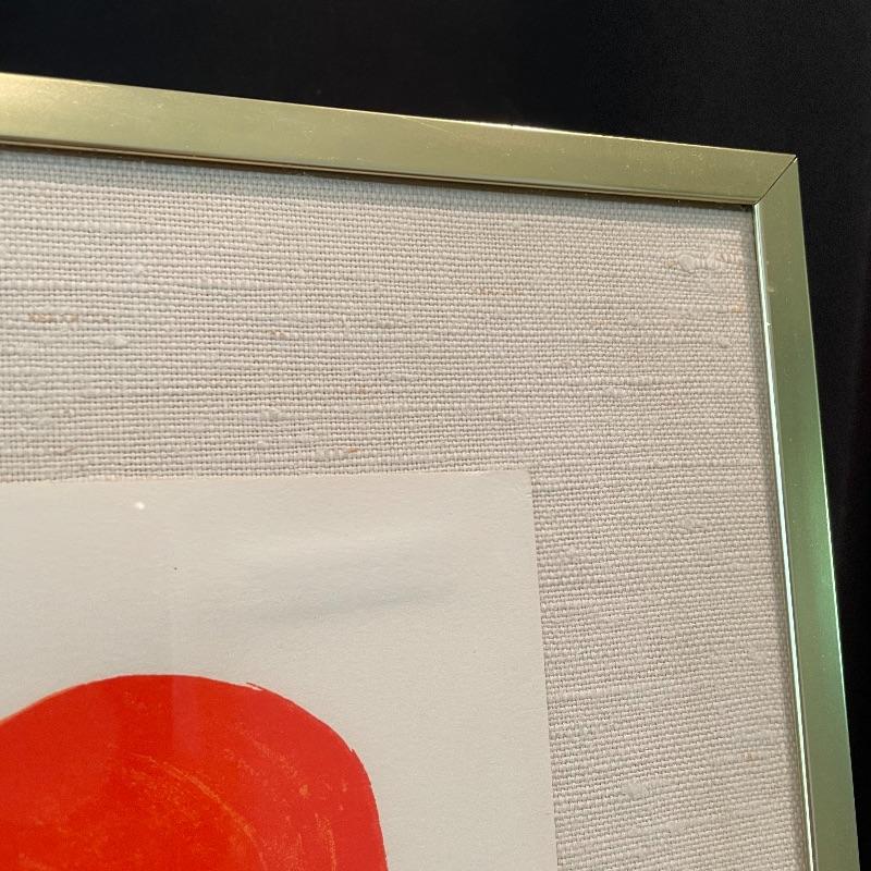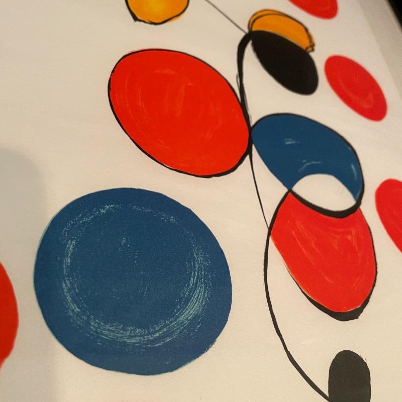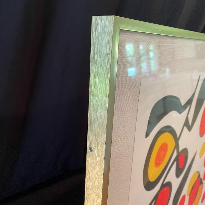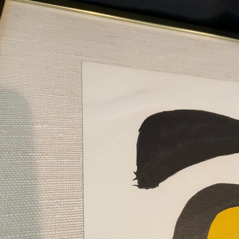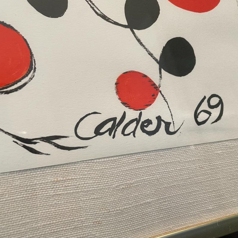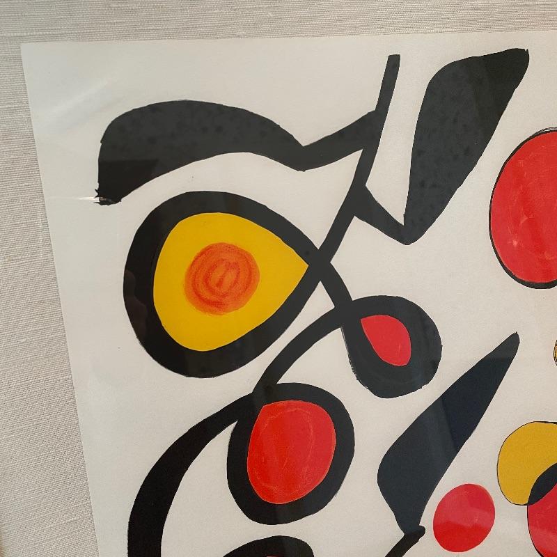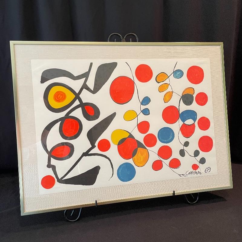 Wow. This bold abstract art is completely eye catching. We believe it is a plate signed lithograph by Alexander Calder. The art appears to sit on linen, behind glass in a nice metal frame. The frame measures approximately 30” x 22”. Shipping available. Please call UPS with dimensions at 828-252-6930 for a shipping quote prior to bidding.
