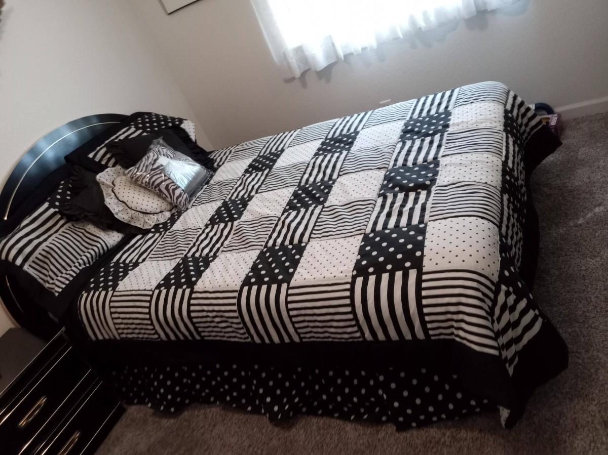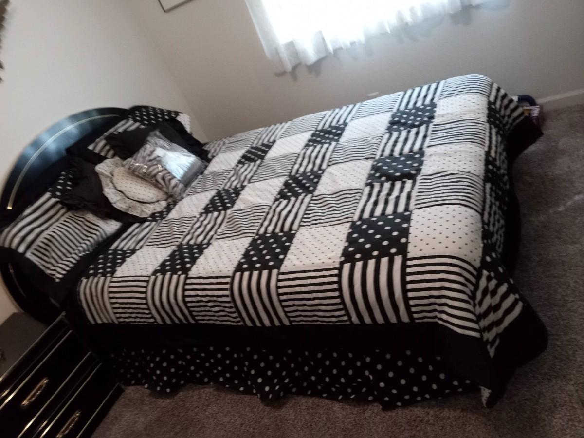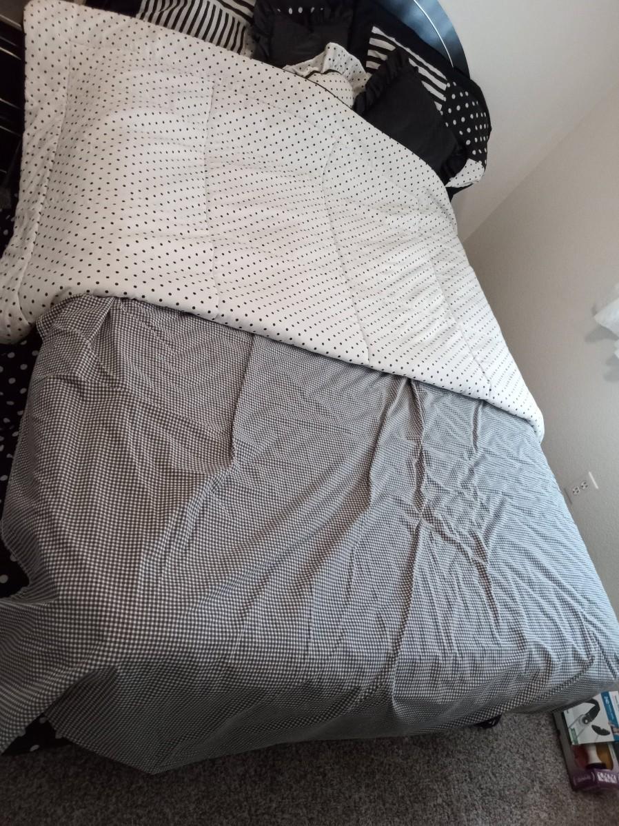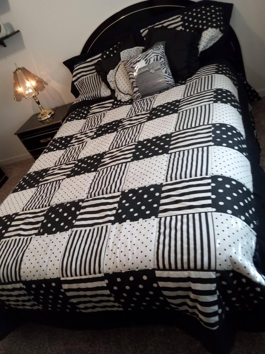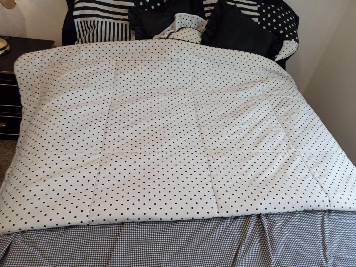 DOUBLE SIZE REVERSIBLE BLACK AND WHITE POLKA DOTS AND STRIPES COMFORTER. SET OF SHEETS, PILLOW SHAMS, THROW PILLOWS, BED SKIRT AND A PAIN-FREE PILLOW.