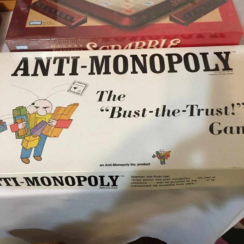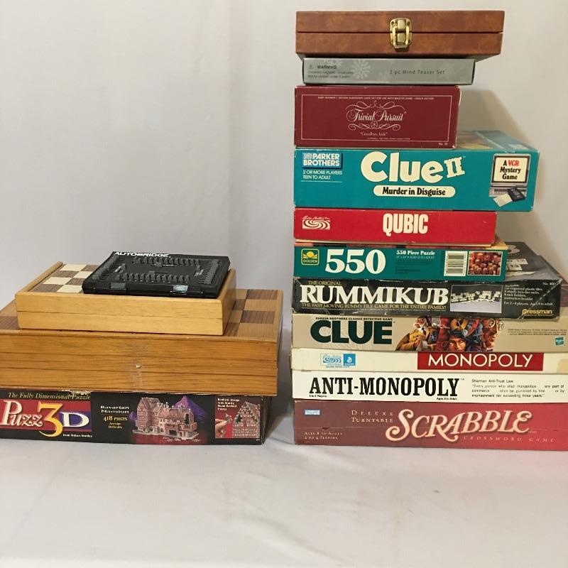 Great way to pass the time if you are stuck in the house. Board games! Lot includes Monopoly, Anti-Monopoly, Scrabble NIB, two chess sets with one made of stone, Clue, 3D puzzle, Cubic, Trivial Pursuit and more.