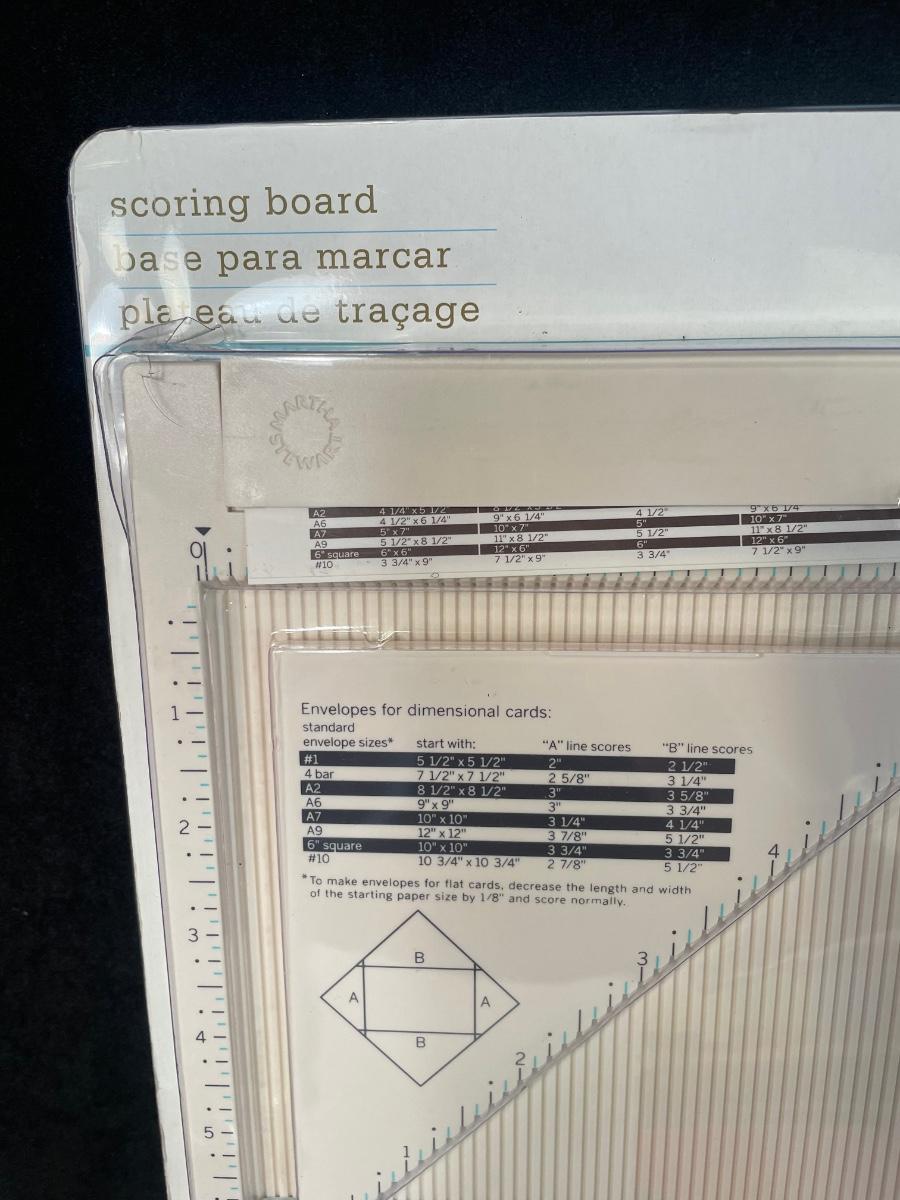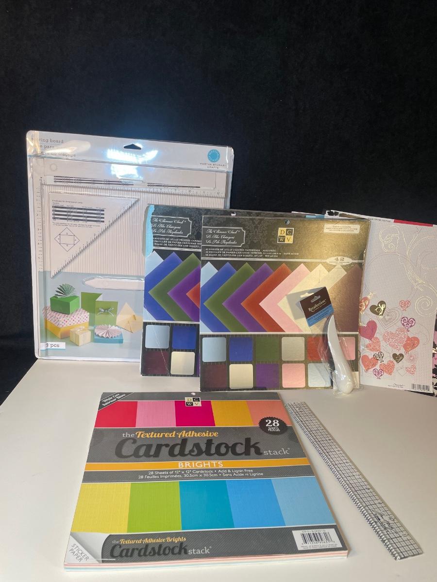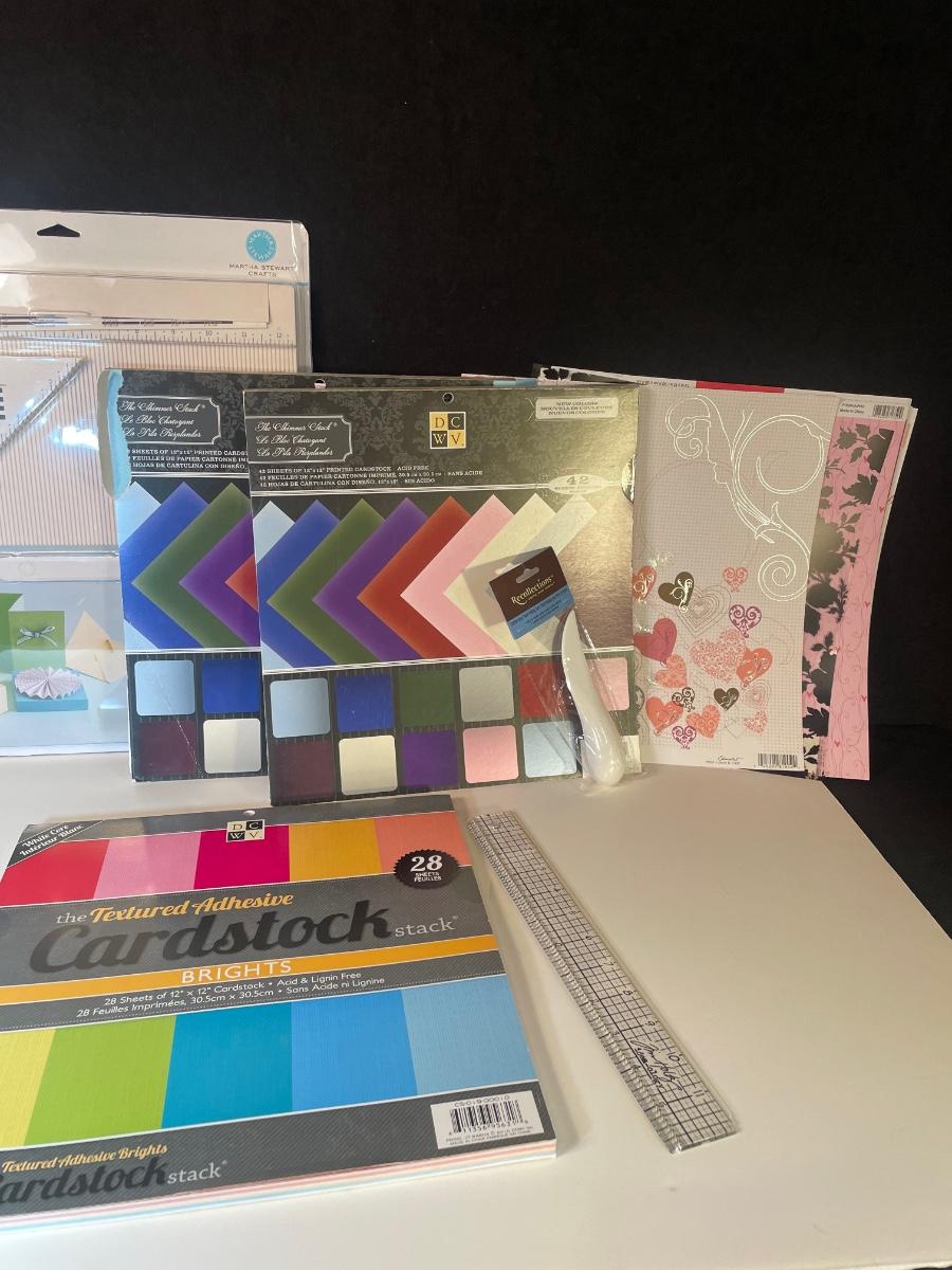 Martha Stewart Scoring Board Kit (still in package), two pads of 12' x 12" cardstock and misc sheets, new pack of textured, adhesive cardstock, clear ruler and a folding tool