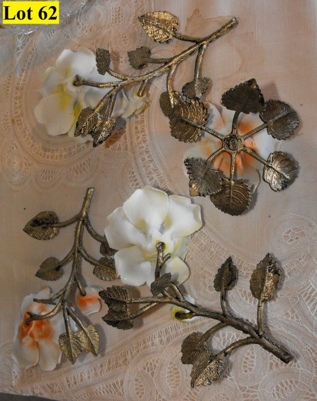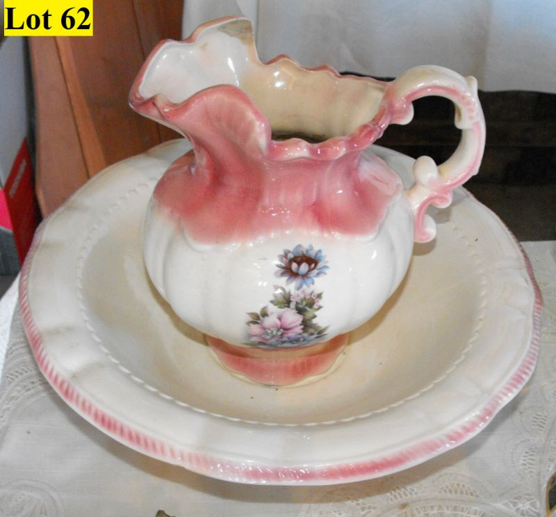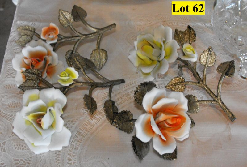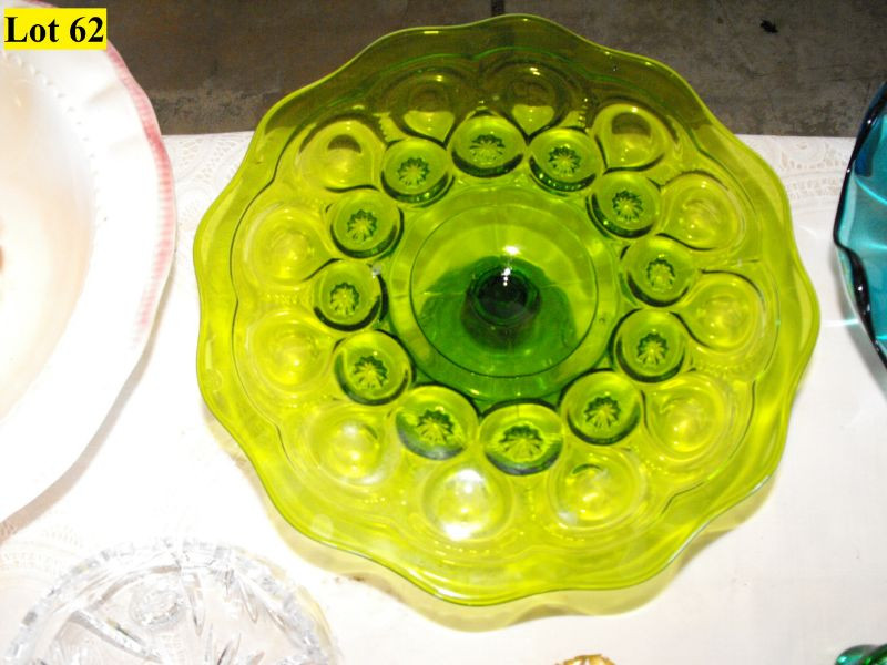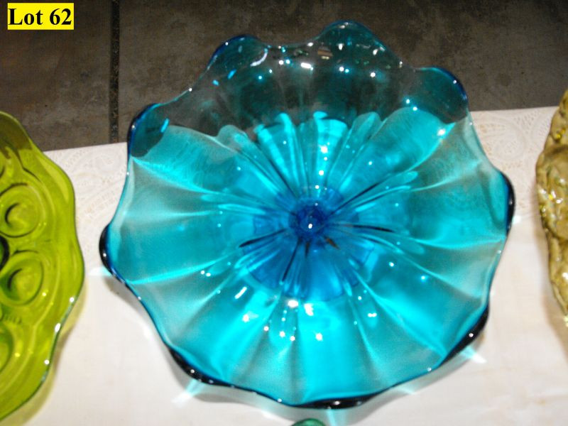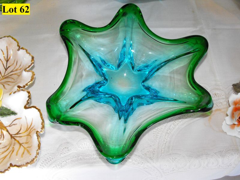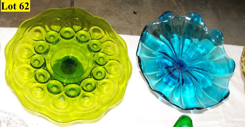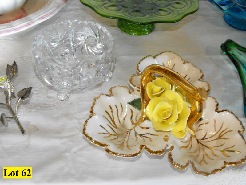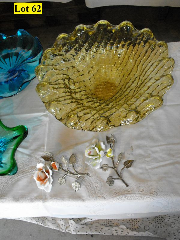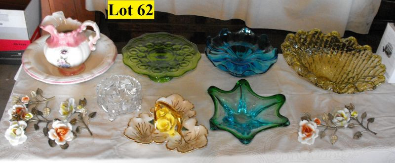 6 Piece Porcelain Roses on Brass Stems, Arnels Wash Bowl and Pitcher, 16” Yellow Bowl, Green Glass Cake Plate, Yellow Rose Candy Dish, Crystal Footed Bowl, Blue and Green Star Burst Glass Dish and Blue Glass Serving Plate