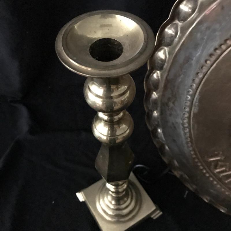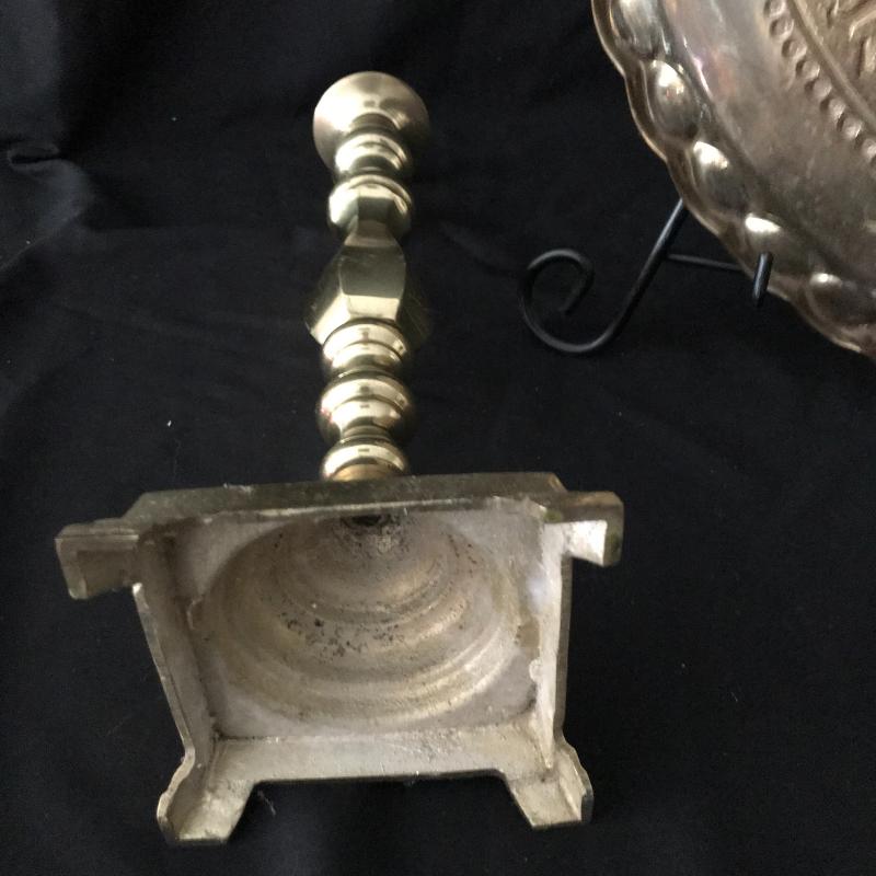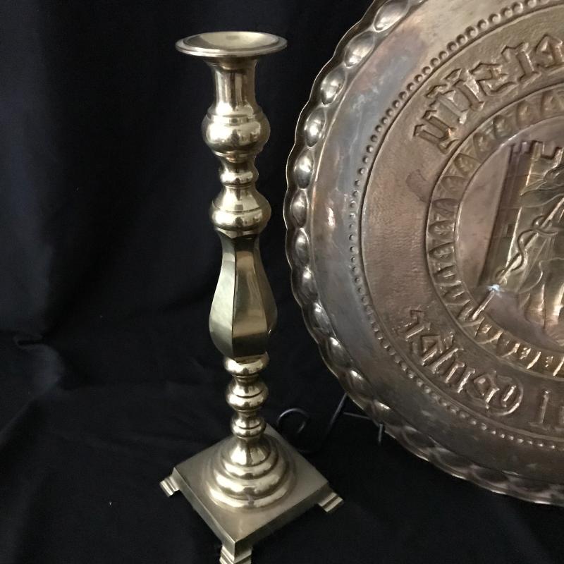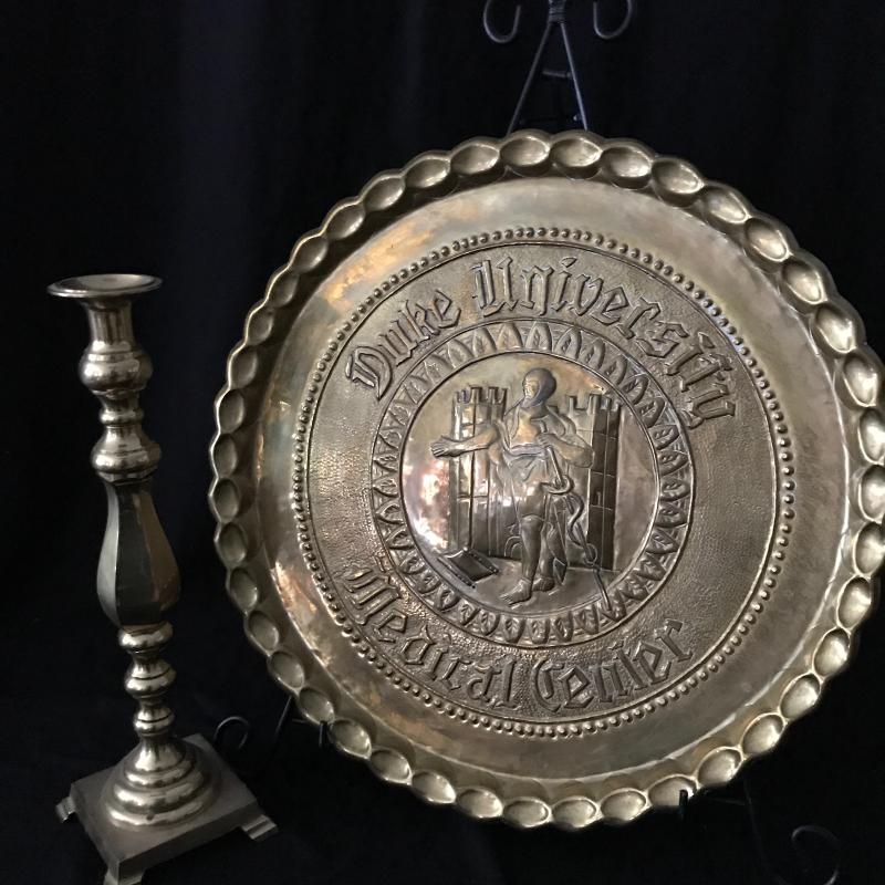 Large brass tray from Duke University Medical Center measures 21”diameter. Gift this to your favorite graduate! Lot also includes brass candle holder, 17” tall. Shipping available or local pick up in Maggie Valley.