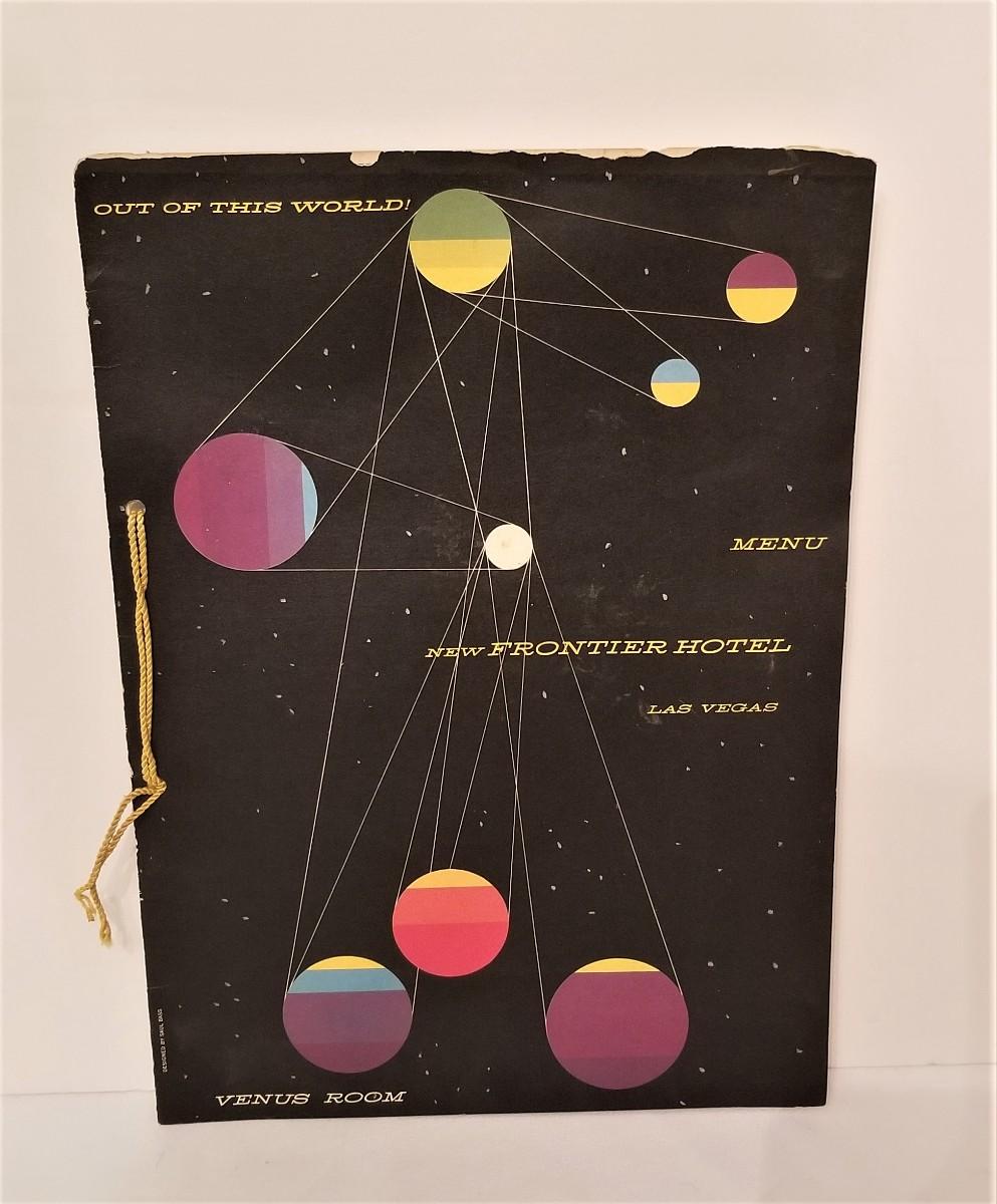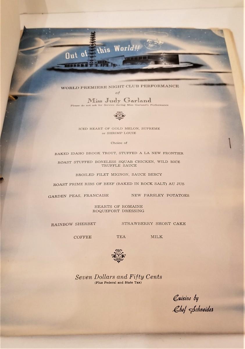 Complete menu/program for Judy Garland's nightclub premiere in Las Vegas in 1956 at the Frontier Hotel (closed 2007). She was getting paid the then unheard of salary of about 55k per week when she performed at the Frontier for about a month in 1956. A special menu with a tipped-in photo print of Miss Garland was created for her run there. You could see her act AND have a gourmet meal for $7.50 per person - YES - $7.50! The Mid Century Space age design on the menu is a real bonus. Measures 10" x 14". Some wear along the outside edges, as shown. If you are a Garland fan, this is a must!