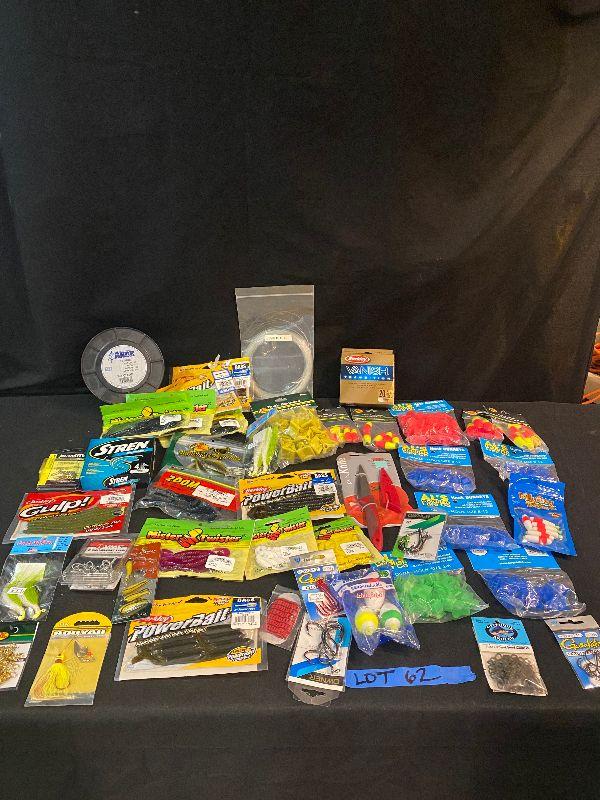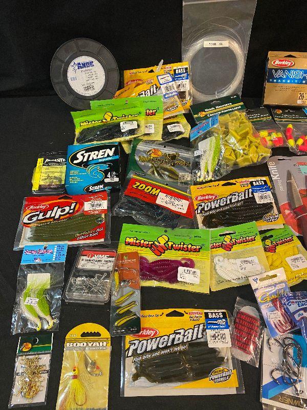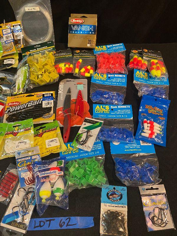 Lot 62 - Fishing Gear (Paring knife, hook bonnets, foam peg floats, unbreakable weighted bobbers, vanish line, bait, fishing line and much more!)