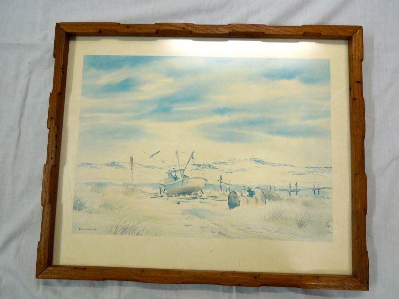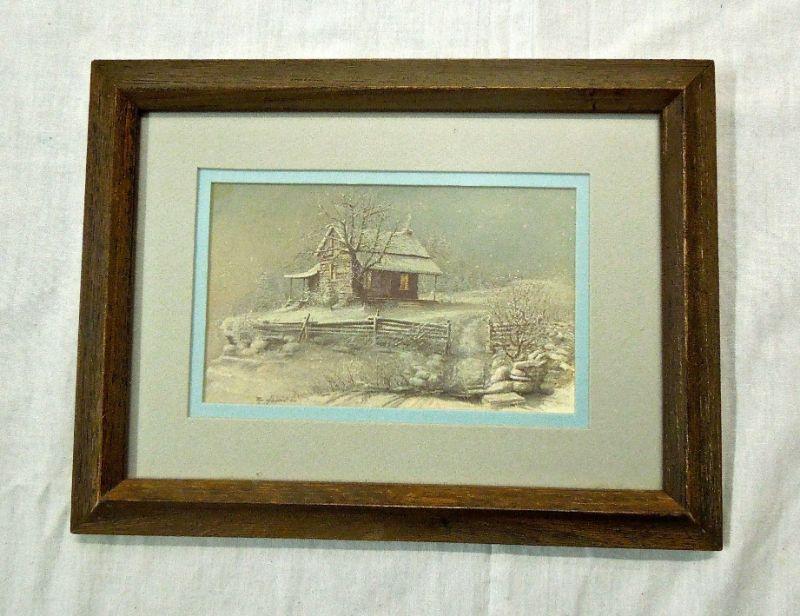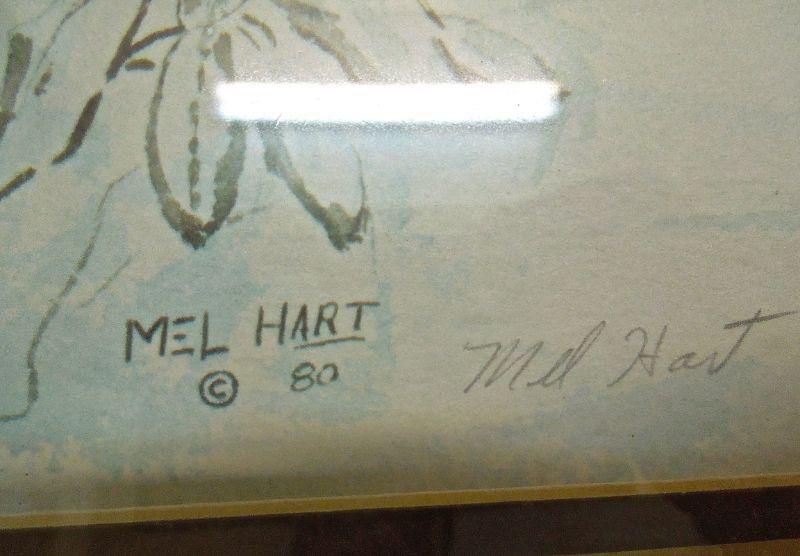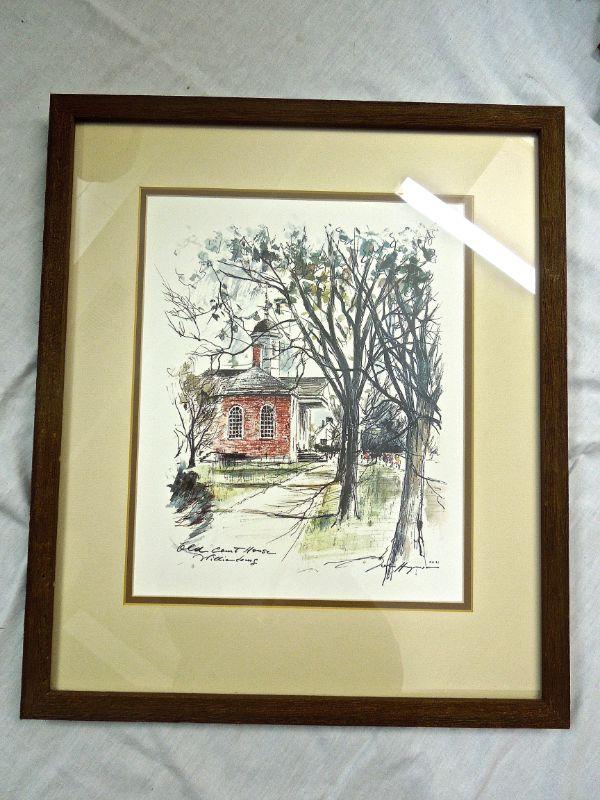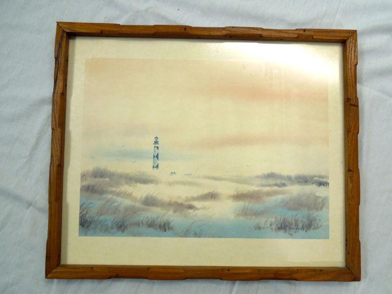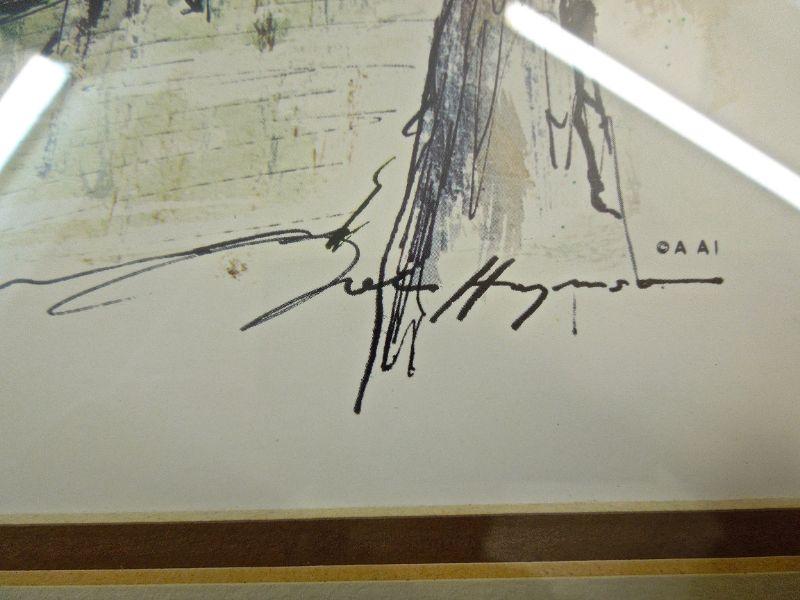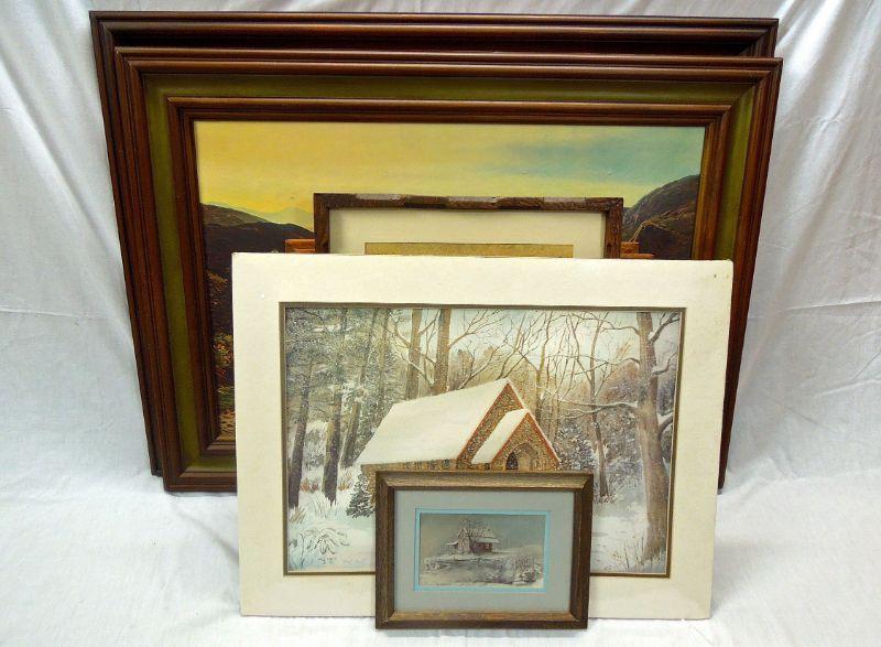 Largest framed picture is a 38" x 30" print and there are two of the same. One is darker print than the other. 8 other framed prints and originals, soome signed. Smallest is 12" x 9".