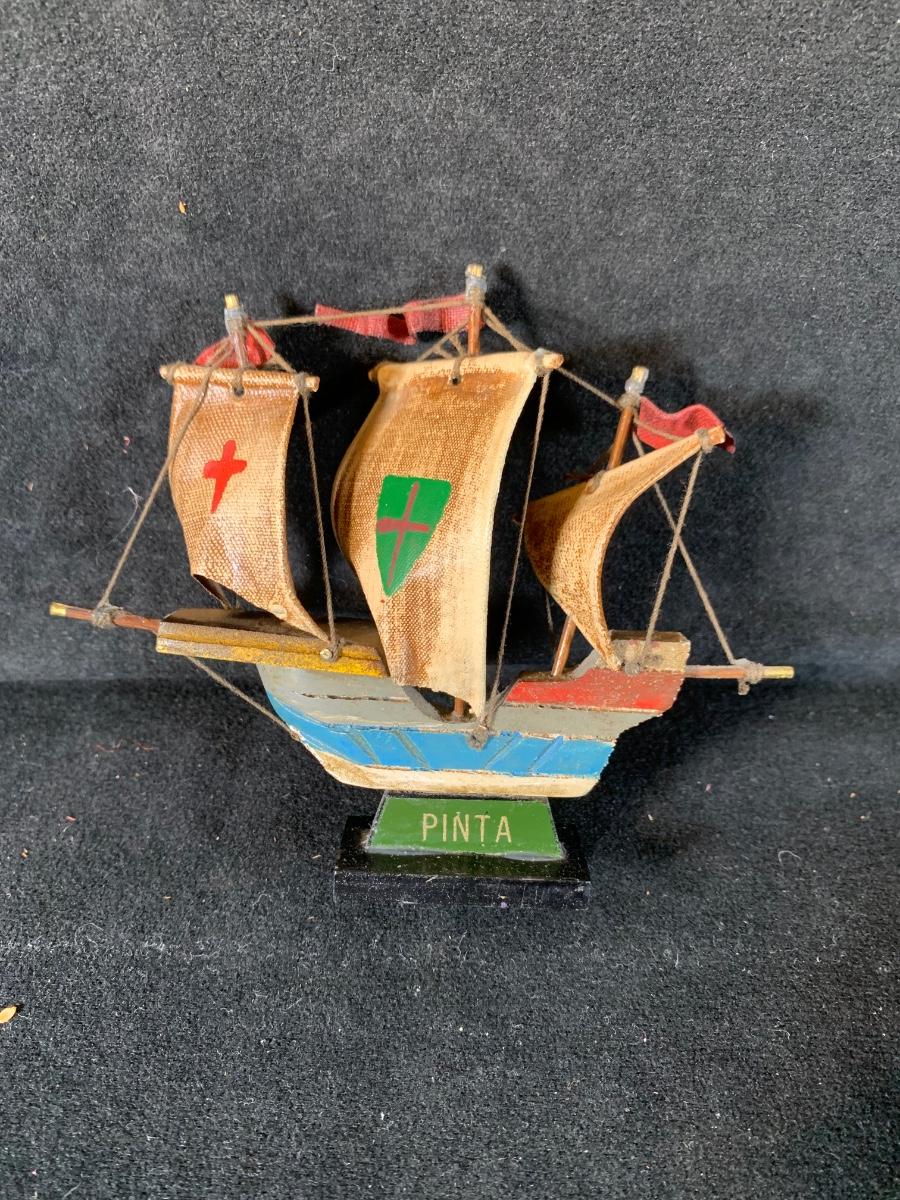 Carved wood bowl features different designs on the outside. Diameter of bowl is 6". Also includes small Pinta sailboat and round woven Indian platter that is 9 1/2" in diameter.