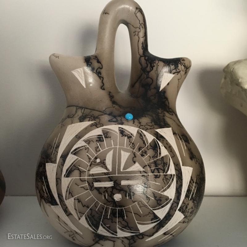 Native American Horse Hair Pottery Etched Wedding Vase Signed . See photos.